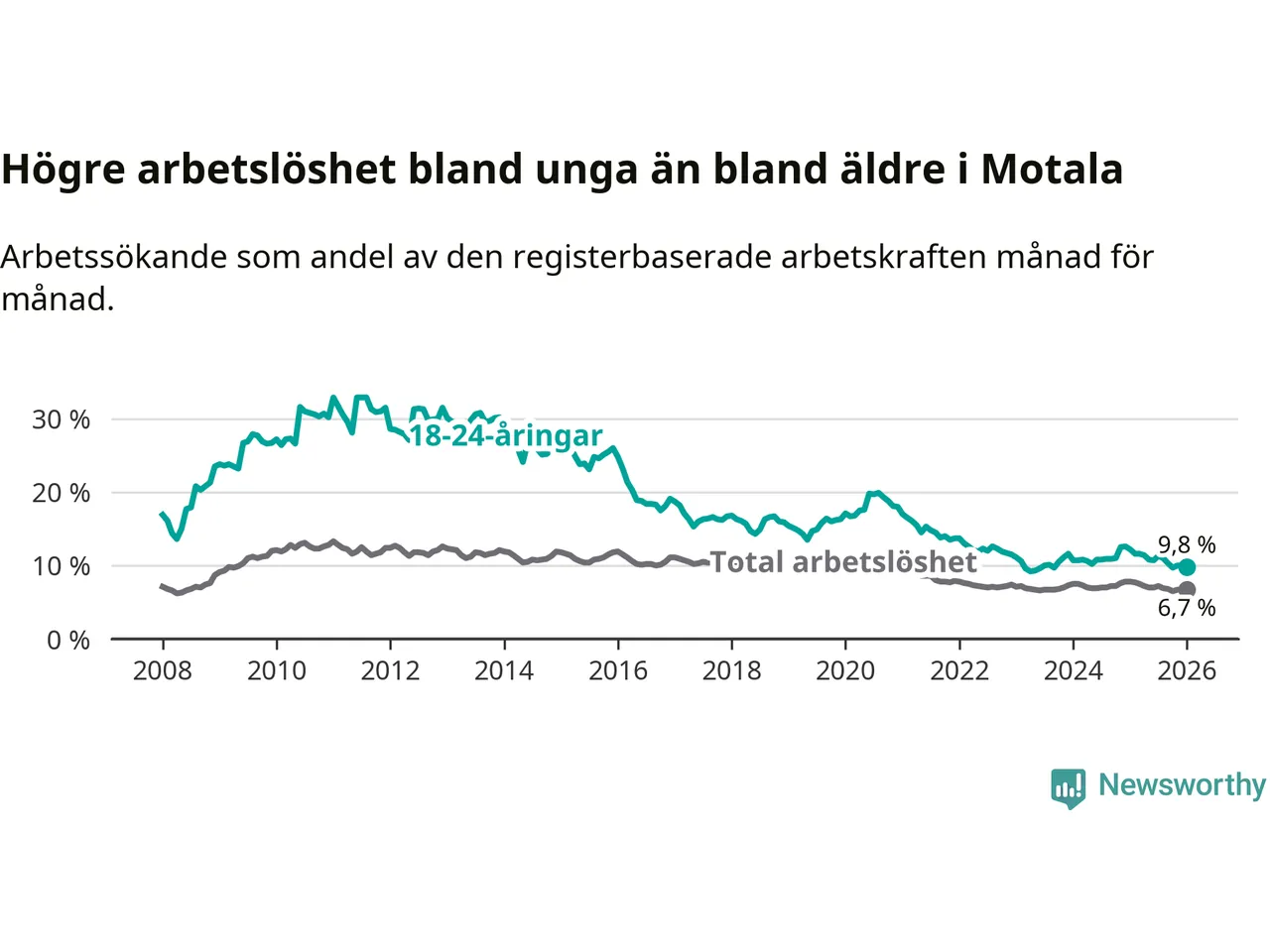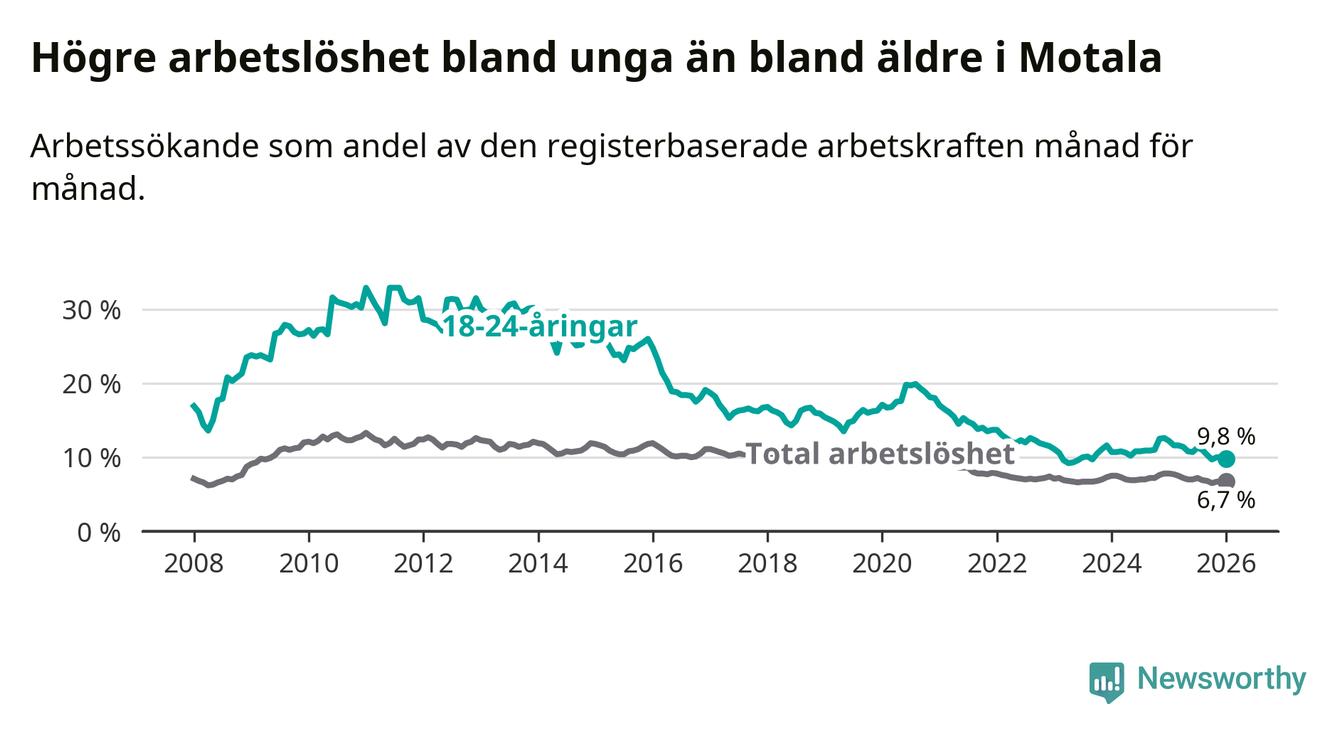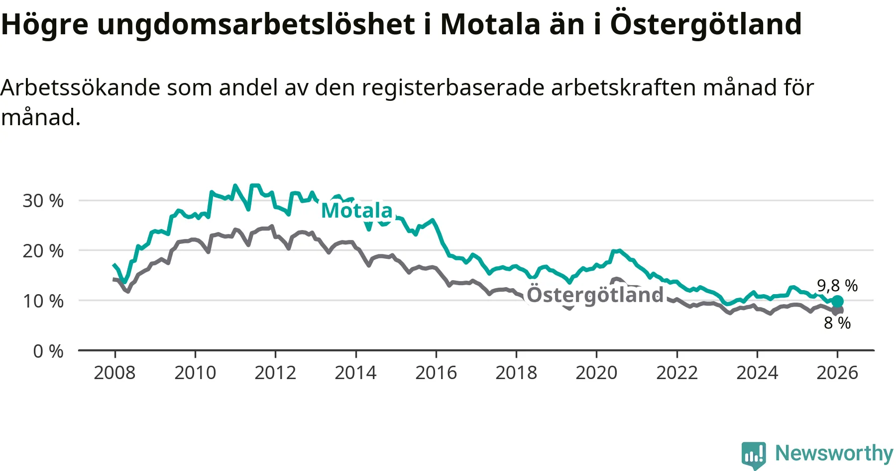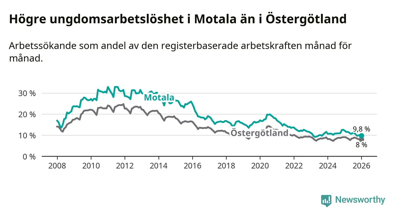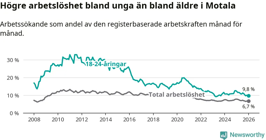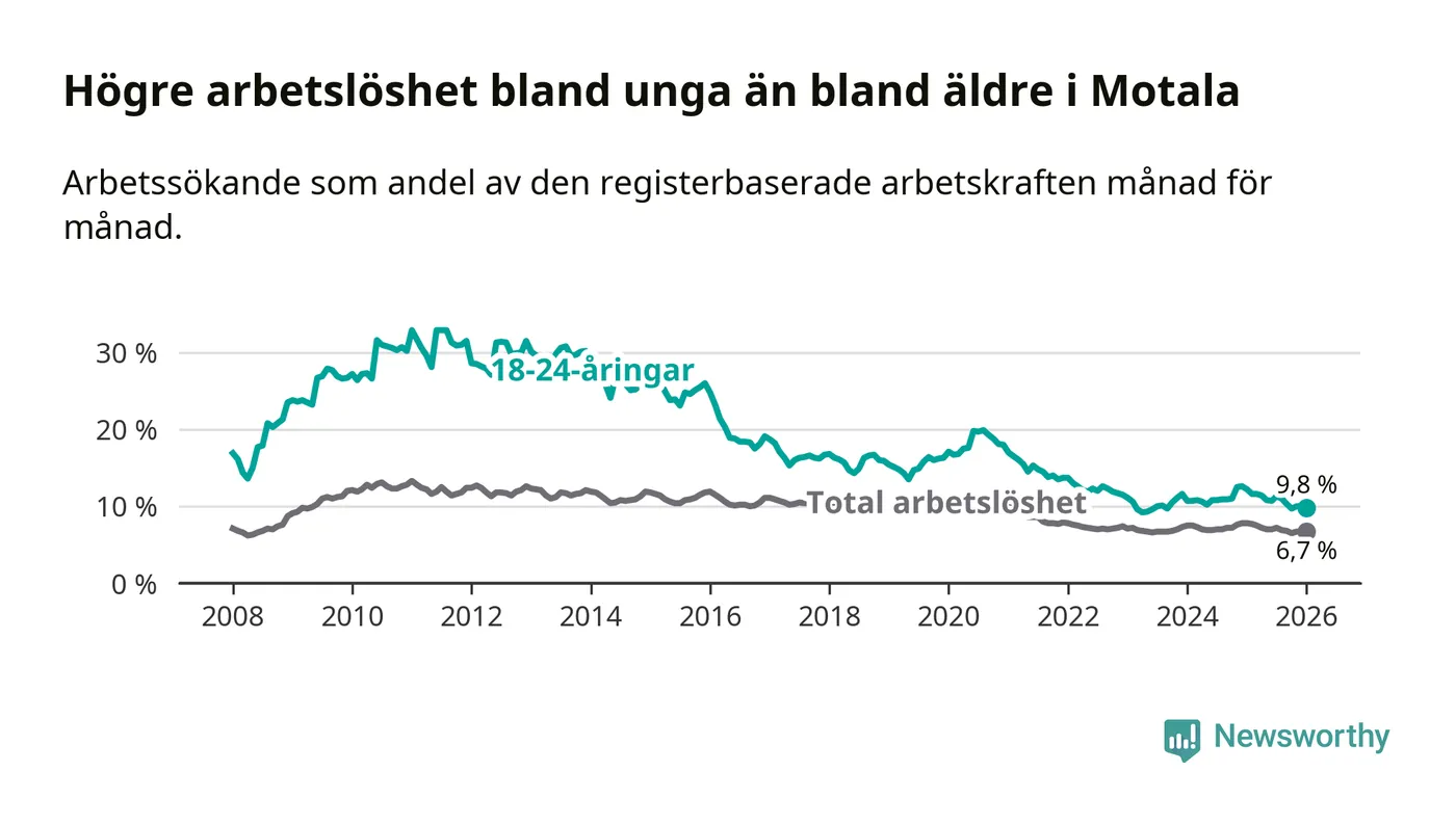 Medan Motala har lägre total arbetslöshet än Östergötland, ligger ungdomsarbetslösheten 1,8 procentenheter högre i Motala.