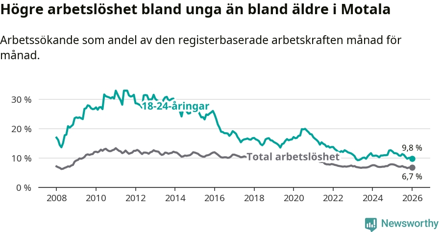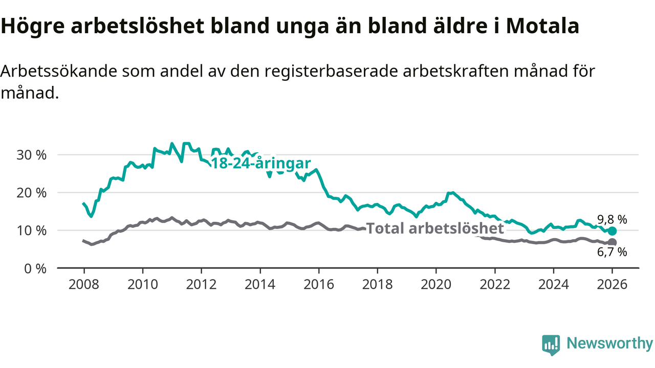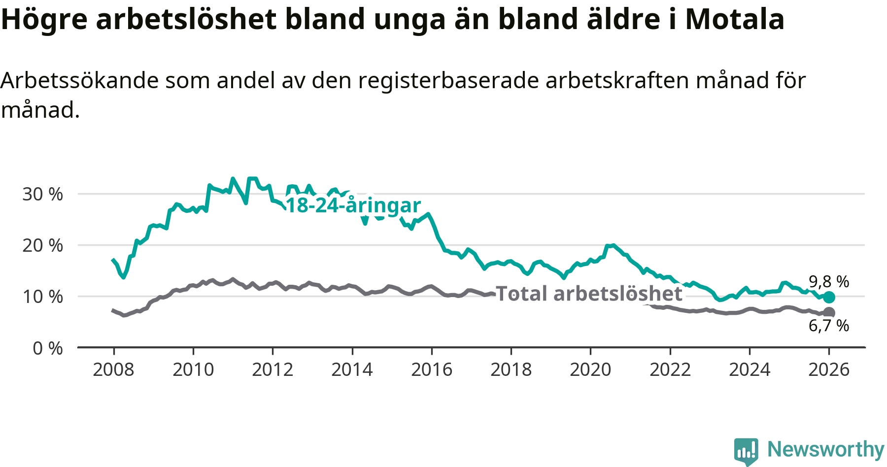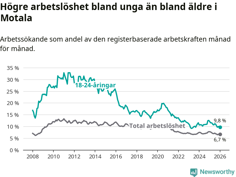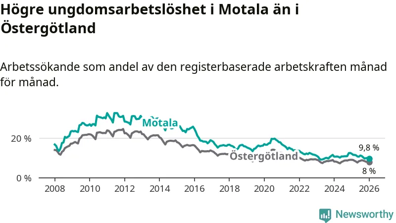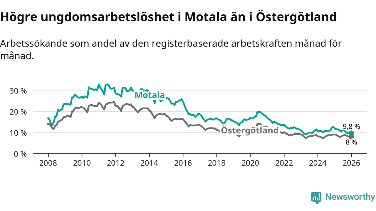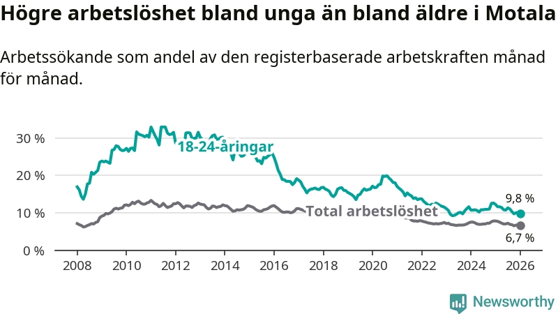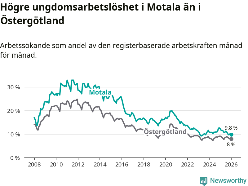 Medan Motala har lägre total arbetslöshet än Östergötland, ligger ungdomsarbetslösheten 1,8 procentenheter högre i Motala.