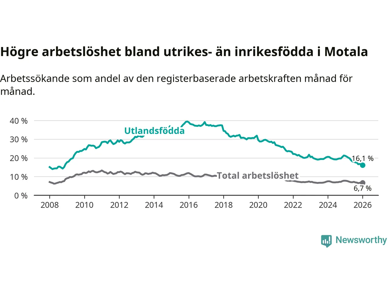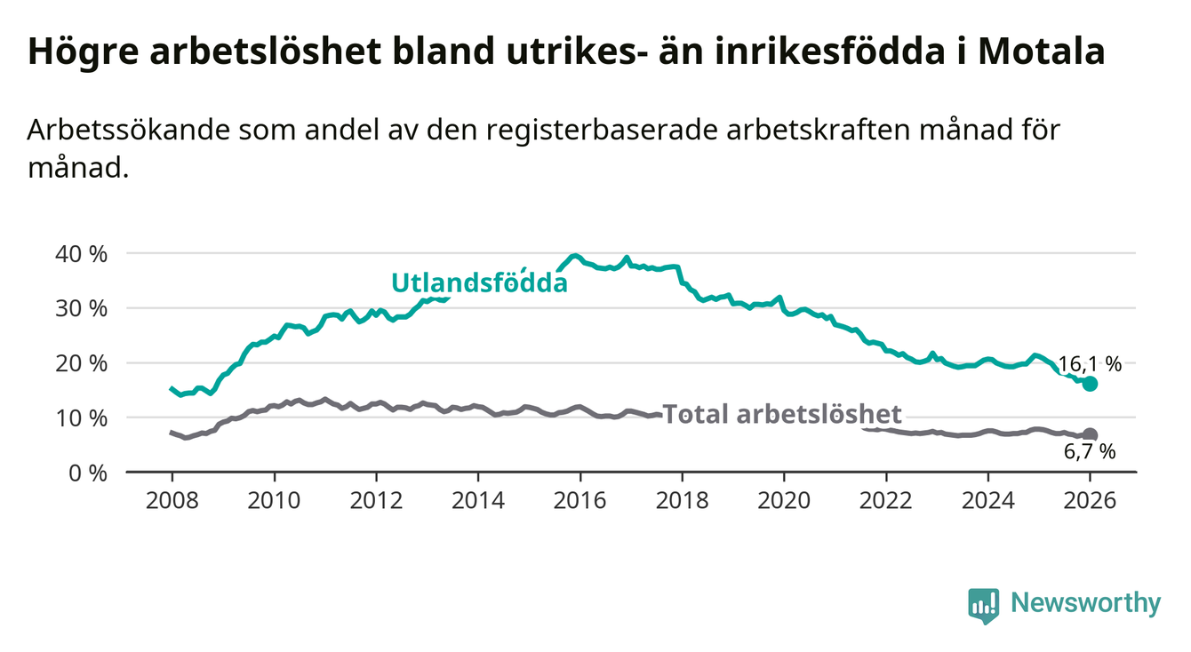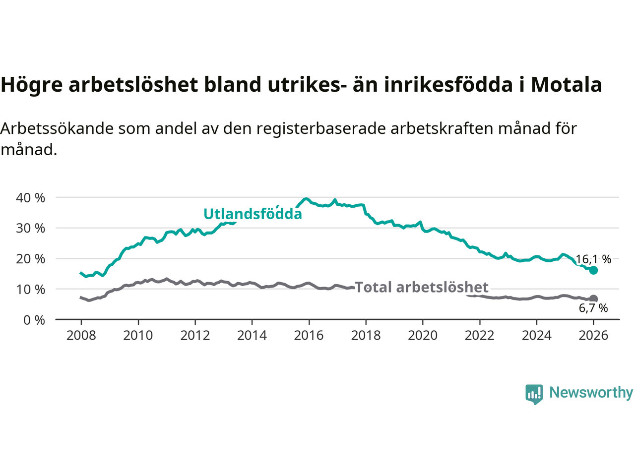 Arbetslösheten bland utlandsfödda var 16,1 procent i Motala under januari månad, motsvarande 602 av 3 739 personer. Det är 5,0 procentenheter färre än vid samma tidpunkt i fjol (−191 om man räknar personer). Därmed är de utlandsföddas arbetslöshet lägre än vid samma tidpunkt i fjol för nionde månaden i följd. Sedan april 2025 har arbetslösheten bland utlandsfödda minskat från 19,8 till 16,1 procent. Den nuvarande arbetslöshetsnivån är den lägsta sedan november 2008.