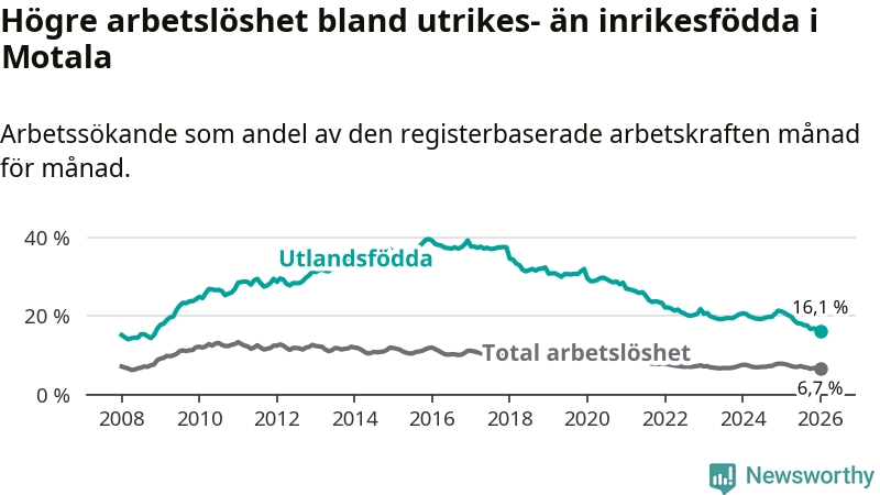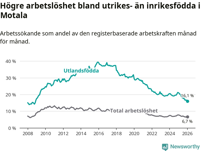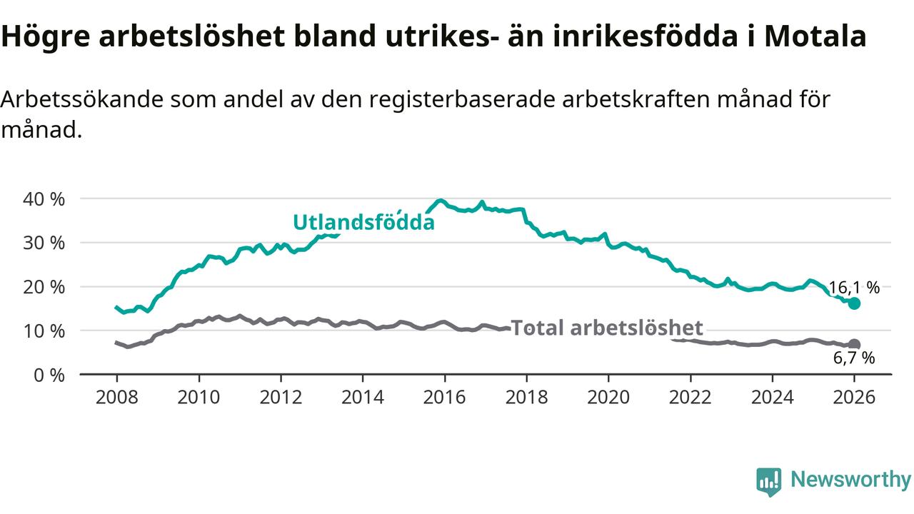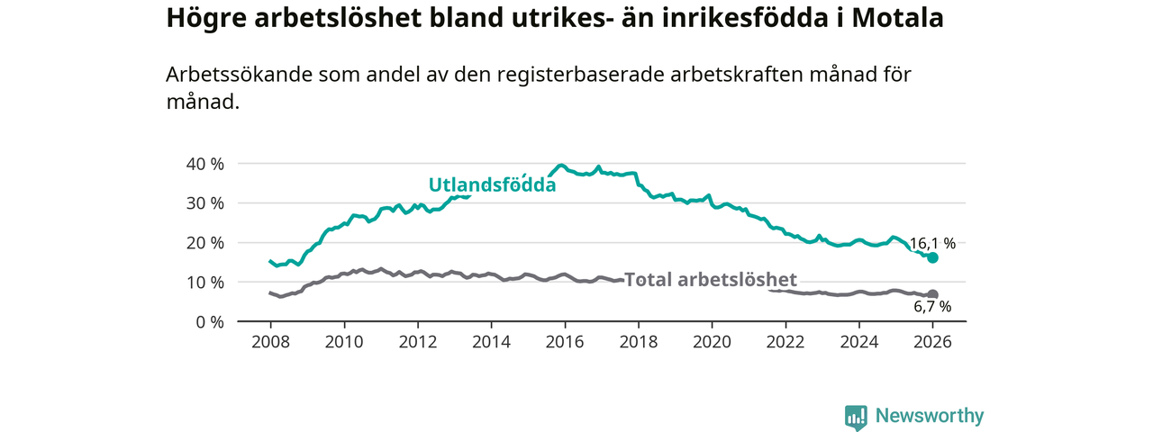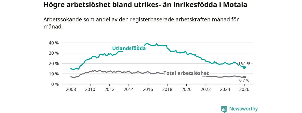 Arbetslösheten bland utlandsfödda var 16,1 procent i Motala under januari månad, motsvarande 602 av 3 739 personer. Det är 5,0 procentenheter färre än vid samma tidpunkt i fjol (−191 om man räknar personer). Därmed är de utlandsföddas arbetslöshet lägre än vid samma tidpunkt i fjol för nionde månaden i följd. Sedan april 2025 har arbetslösheten bland utlandsfödda minskat från 19,8 till 16,1 procent. Den nuvarande arbetslöshetsnivån är den lägsta sedan november 2008.