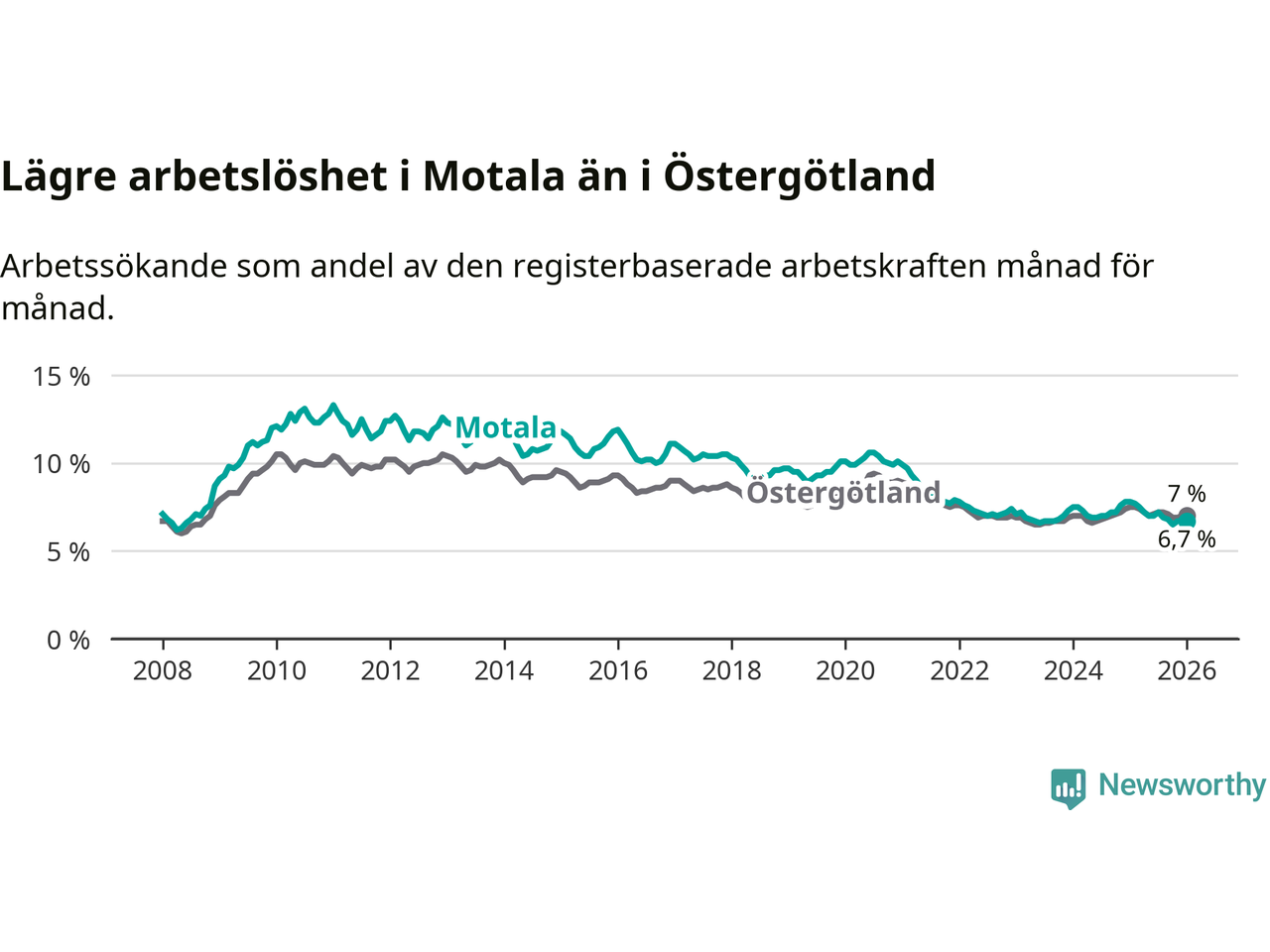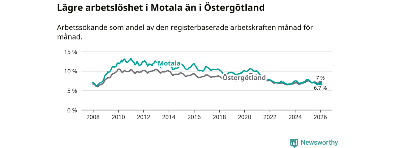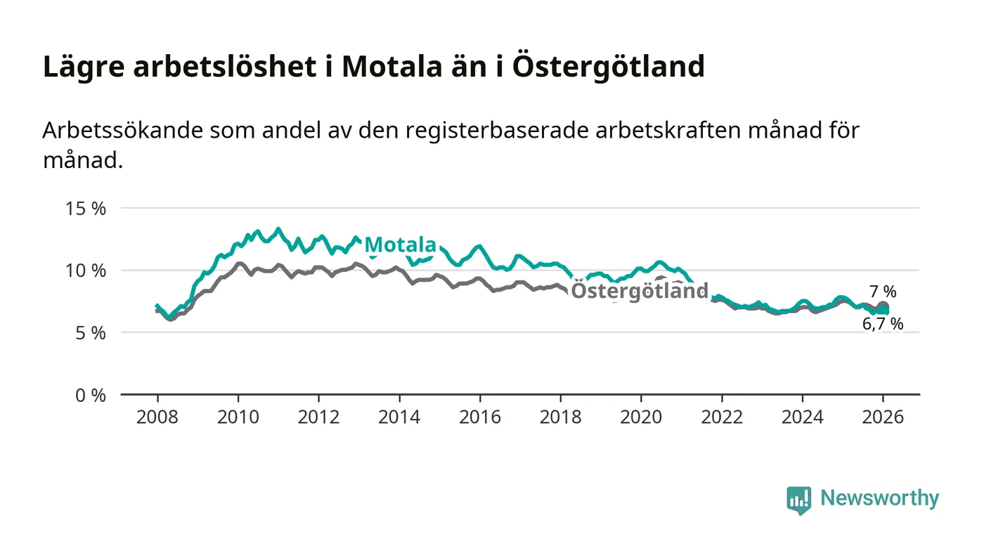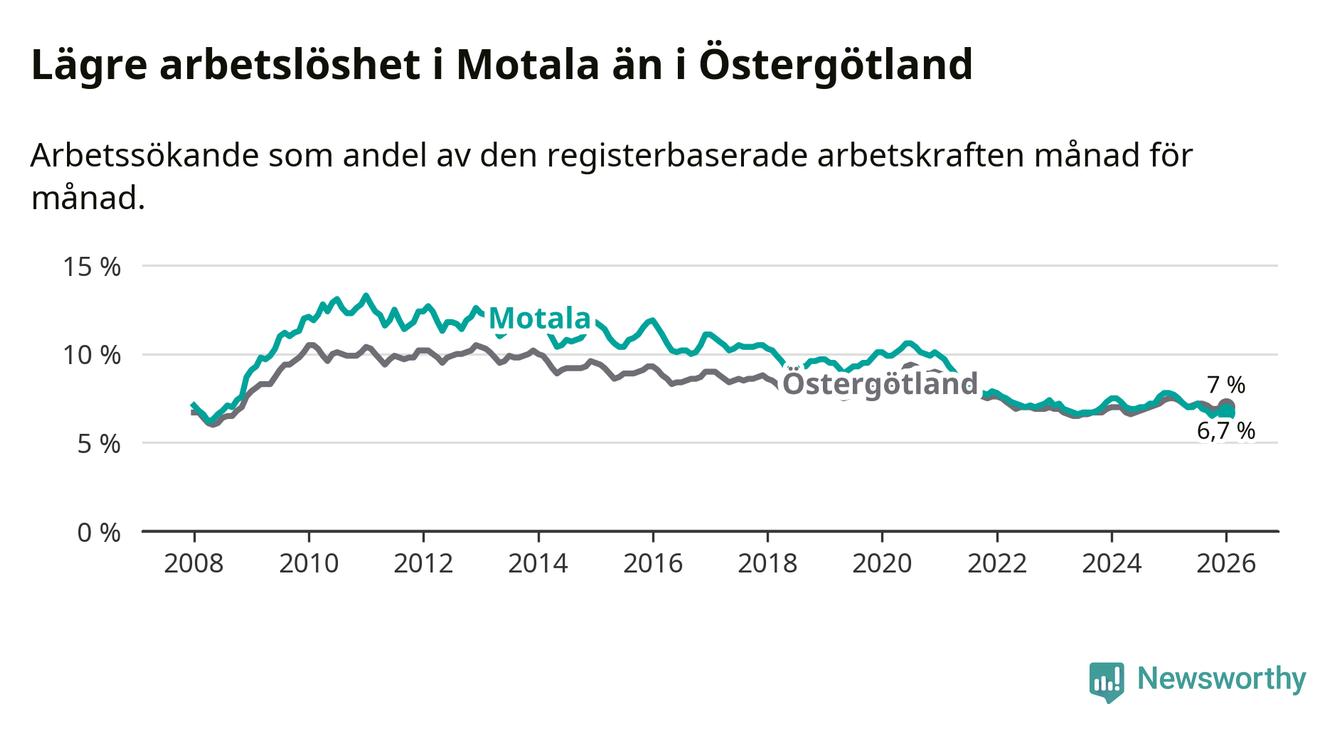 Under januari månad rapporterade Motala kommun en total arbetslöshet på 6,7 procent. Det är en minskning jämfört med samma tidpunkt i fjol (−1,1 procentenheter). Även i Östergötlands län sjunker arbetslösheten .
