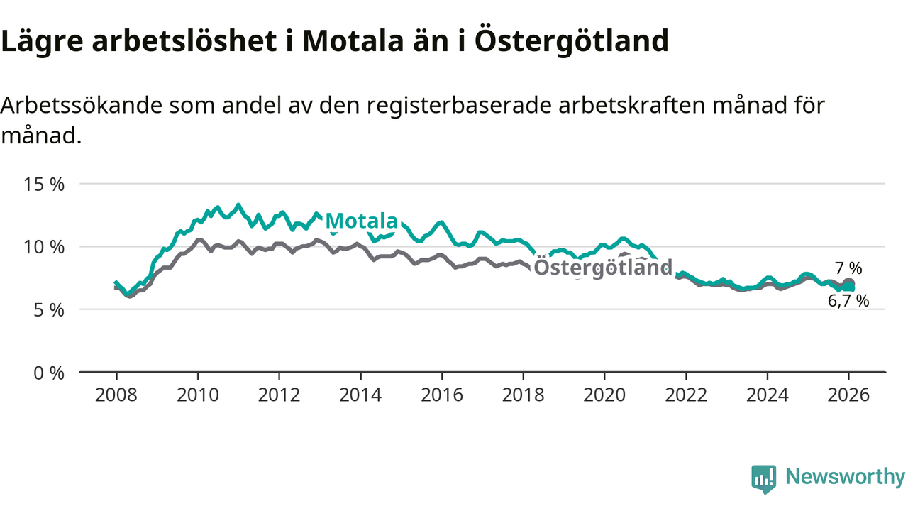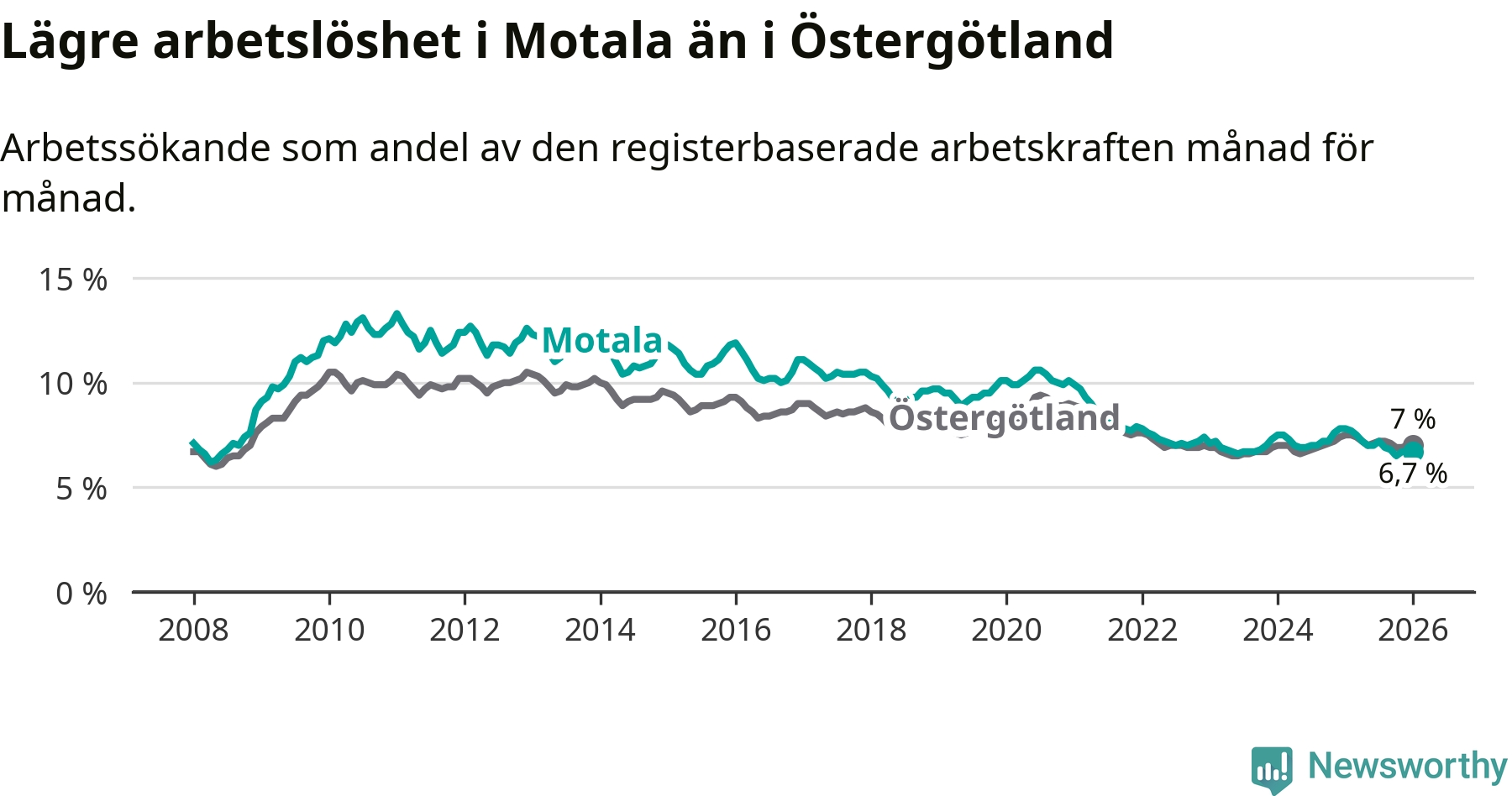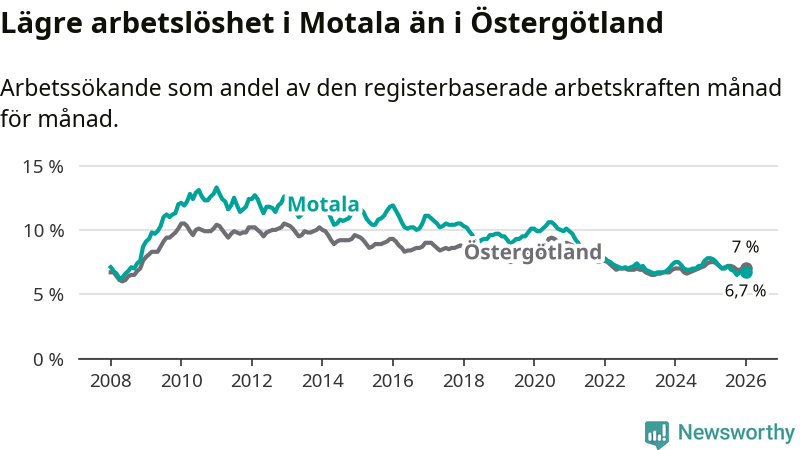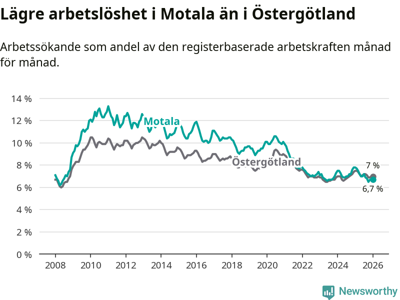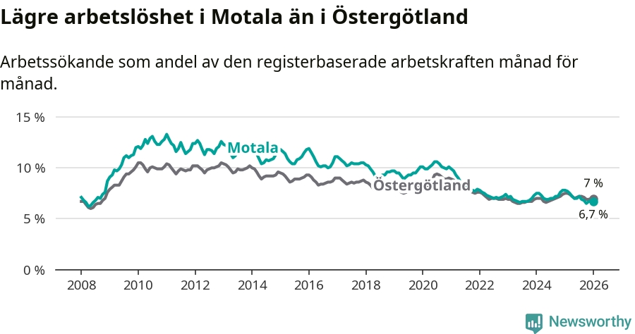 Under januari månad rapporterade Motala kommun en total arbetslöshet på 6,7 procent. Det är en minskning jämfört med samma tidpunkt i fjol (−1,1 procentenheter). Även i Östergötlands län sjunker arbetslösheten .