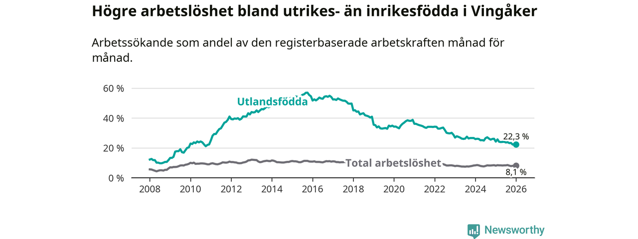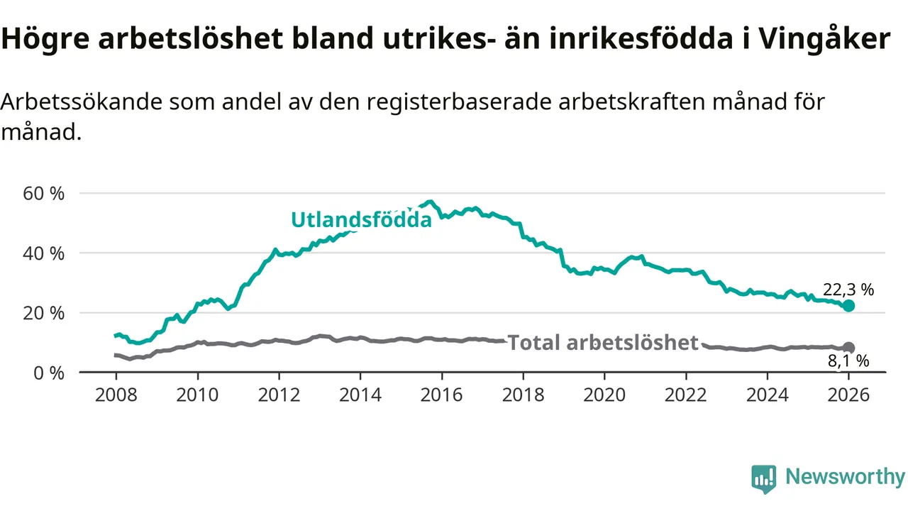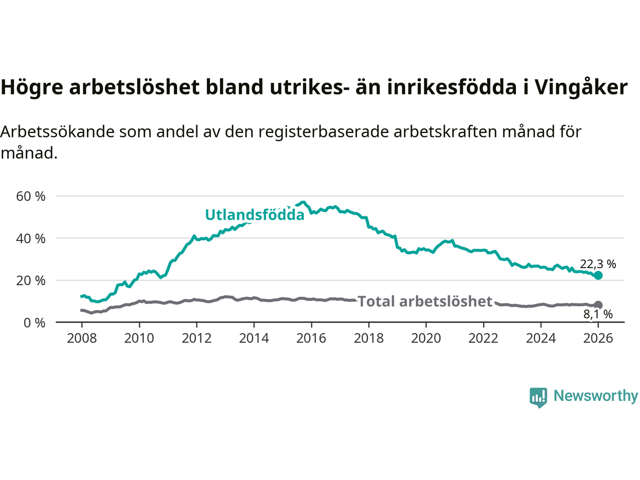 Arbetslösheten bland utlandsfödda var 22,3 procent i Vingåker under januari månad, motsvarande 135 av 605 personer. Det är 1,9 procentenheter färre än vid samma tidpunkt i fjol (−15 om man räknar personer). Därmed är de utlandsföddas arbetslöshet lägre än vid samma tidpunkt i fjol för 18:e månaden i följd. Sedan juli 2024 har arbetslösheten bland utlandsfödda minskat från 26,5 till 22,3 procent.