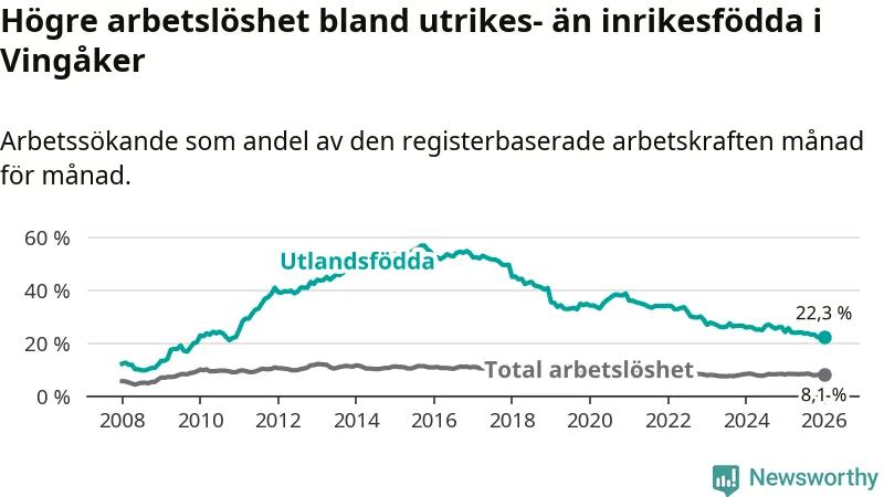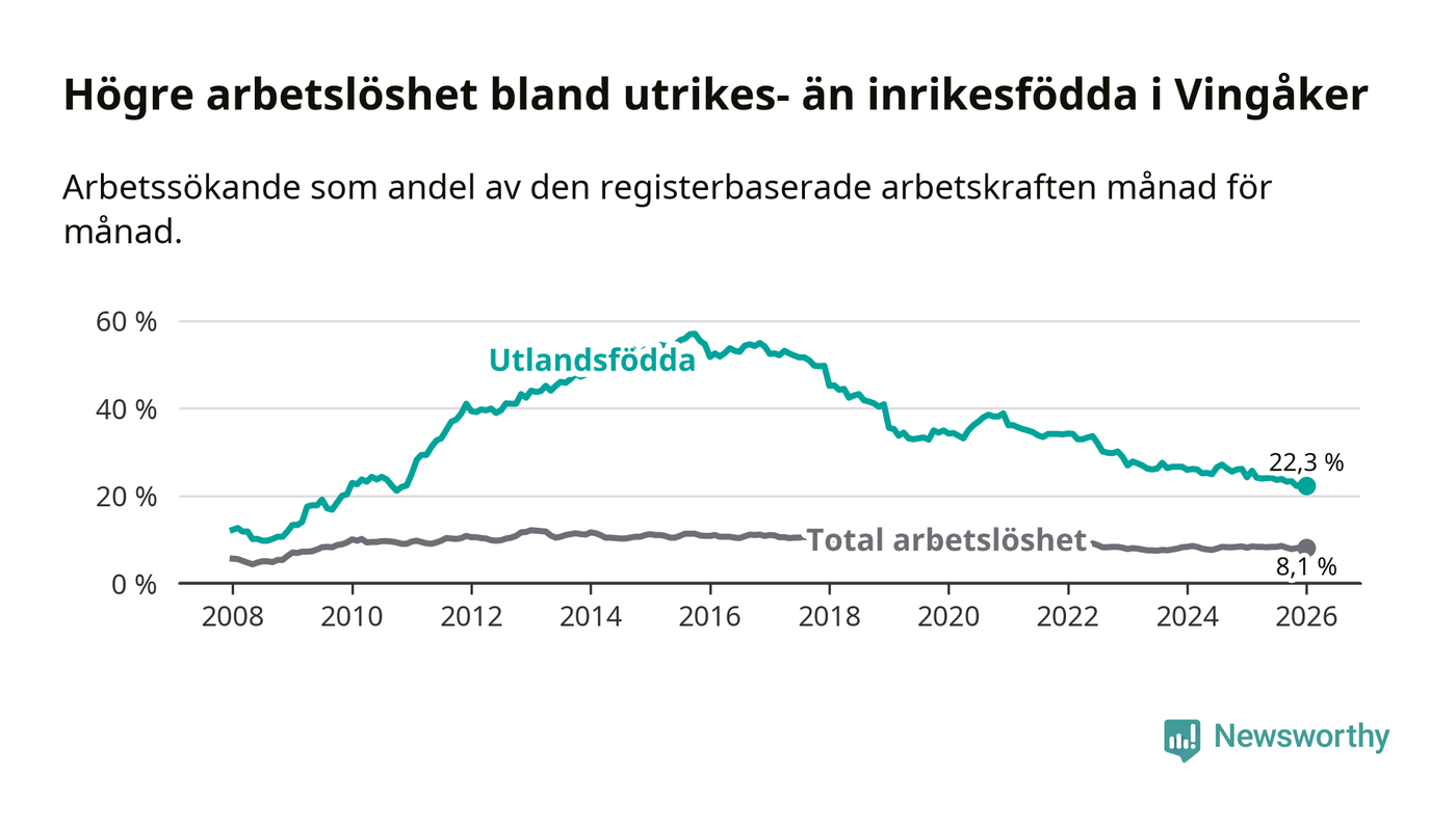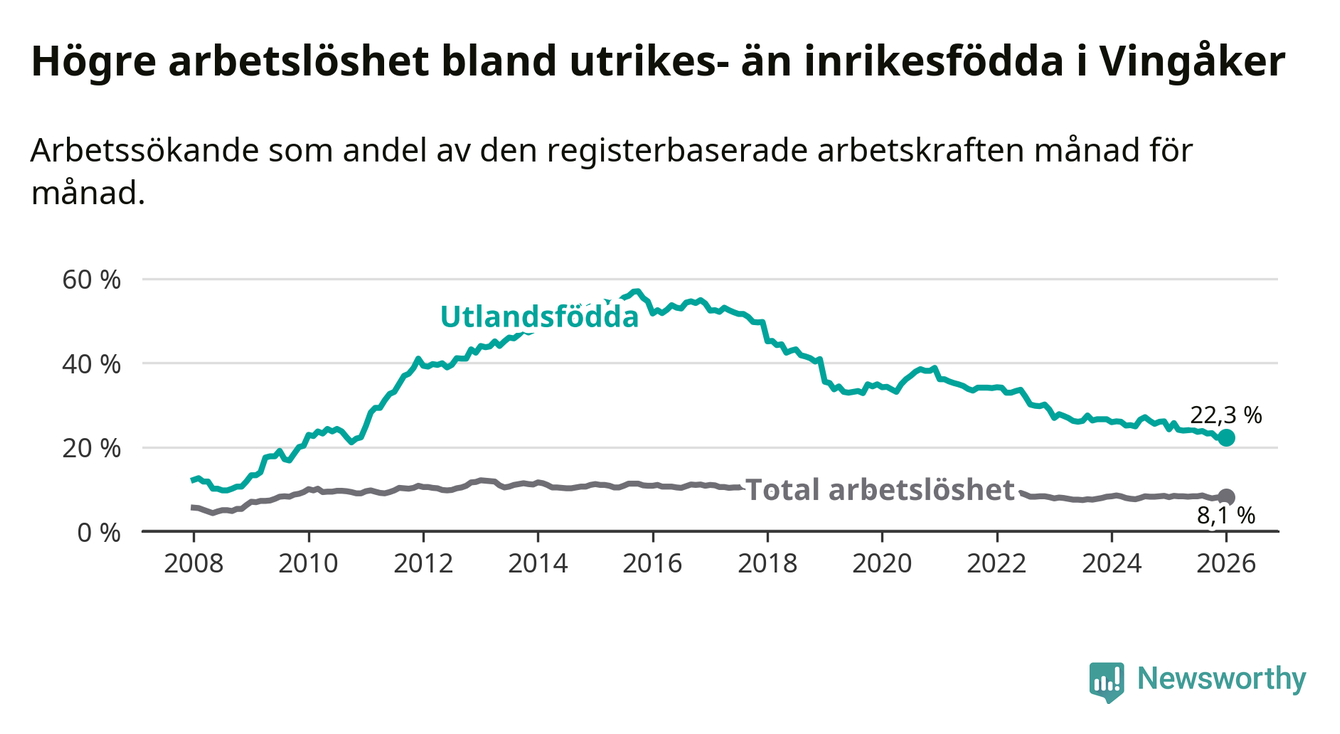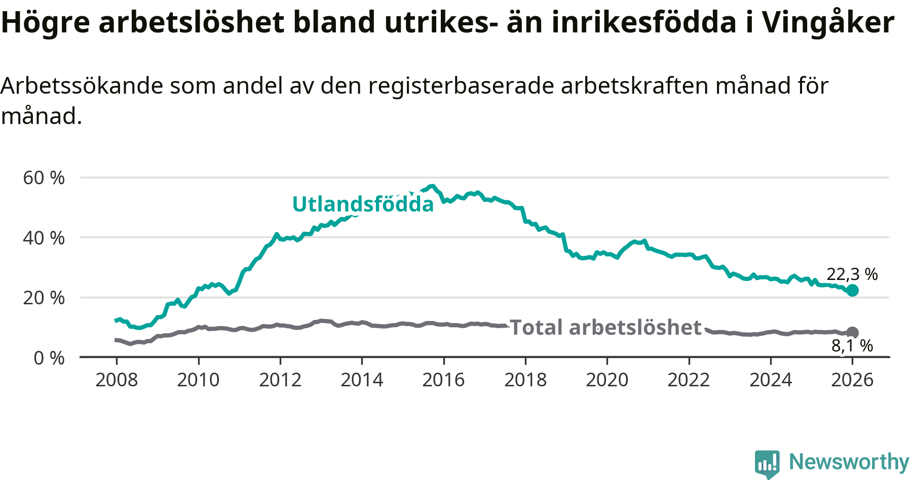 Arbetslösheten bland utlandsfödda var 22,3 procent i Vingåker under januari månad, motsvarande 135 av 605 personer. Det är 1,9 procentenheter färre än vid samma tidpunkt i fjol (−15 om man räknar personer). Därmed är de utlandsföddas arbetslöshet lägre än vid samma tidpunkt i fjol för 18:e månaden i följd. Sedan juli 2024 har arbetslösheten bland utlandsfödda minskat från 26,5 till 22,3 procent.