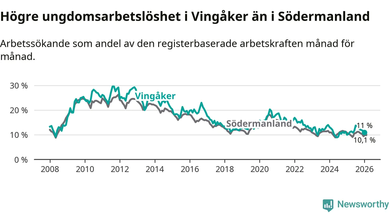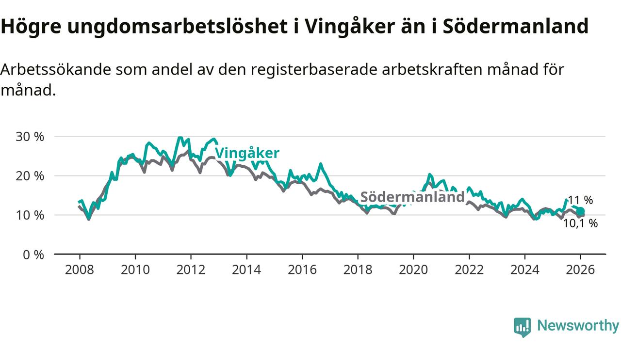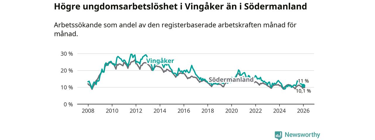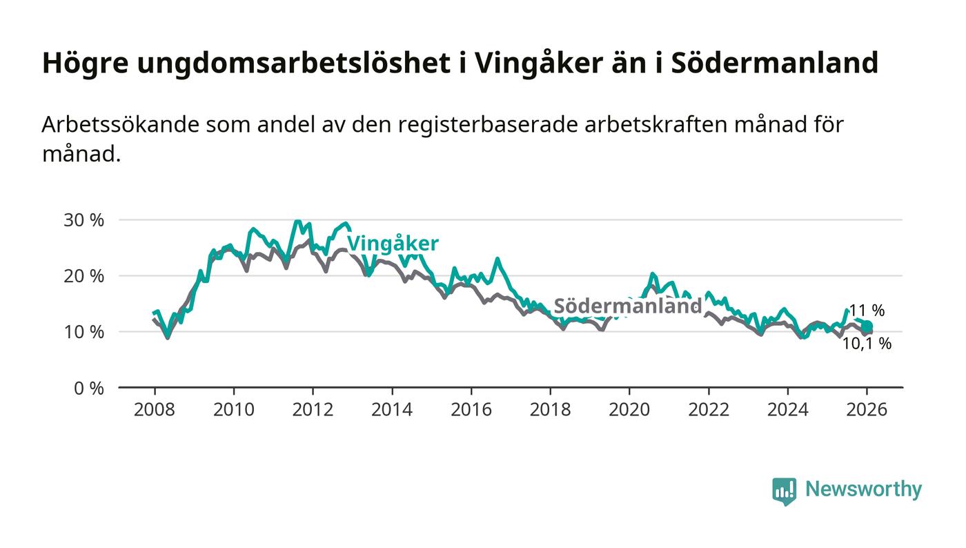 Medan Vingåker har lägre total arbetslöshet än Södermanland, ligger ungdomsarbetslösheten 0,9 procentenheter högre i Vingåker.