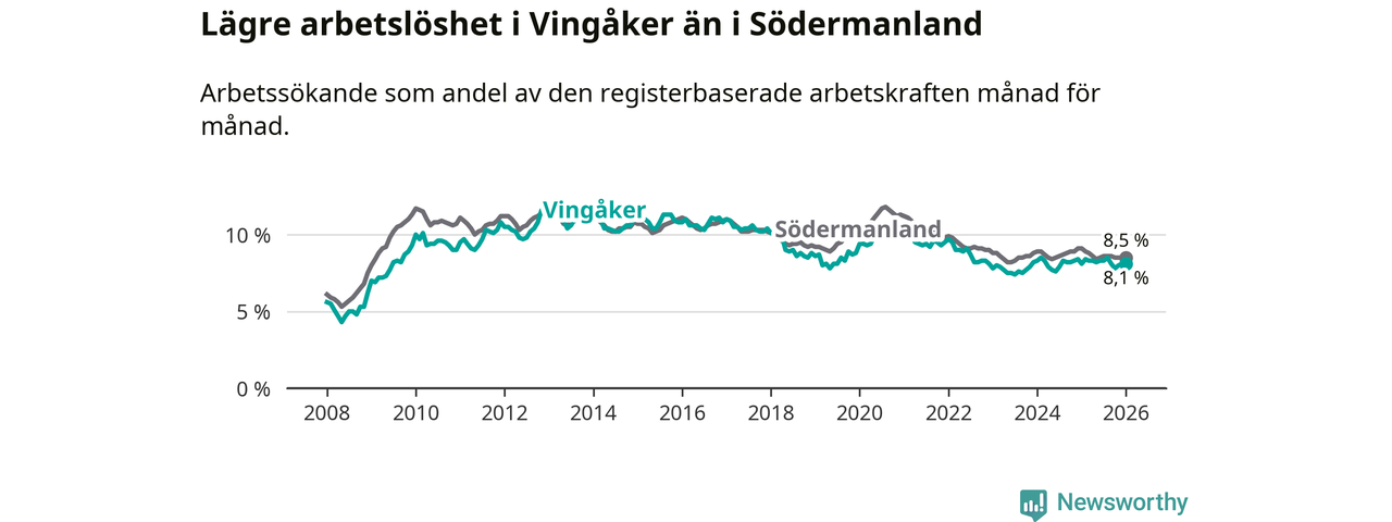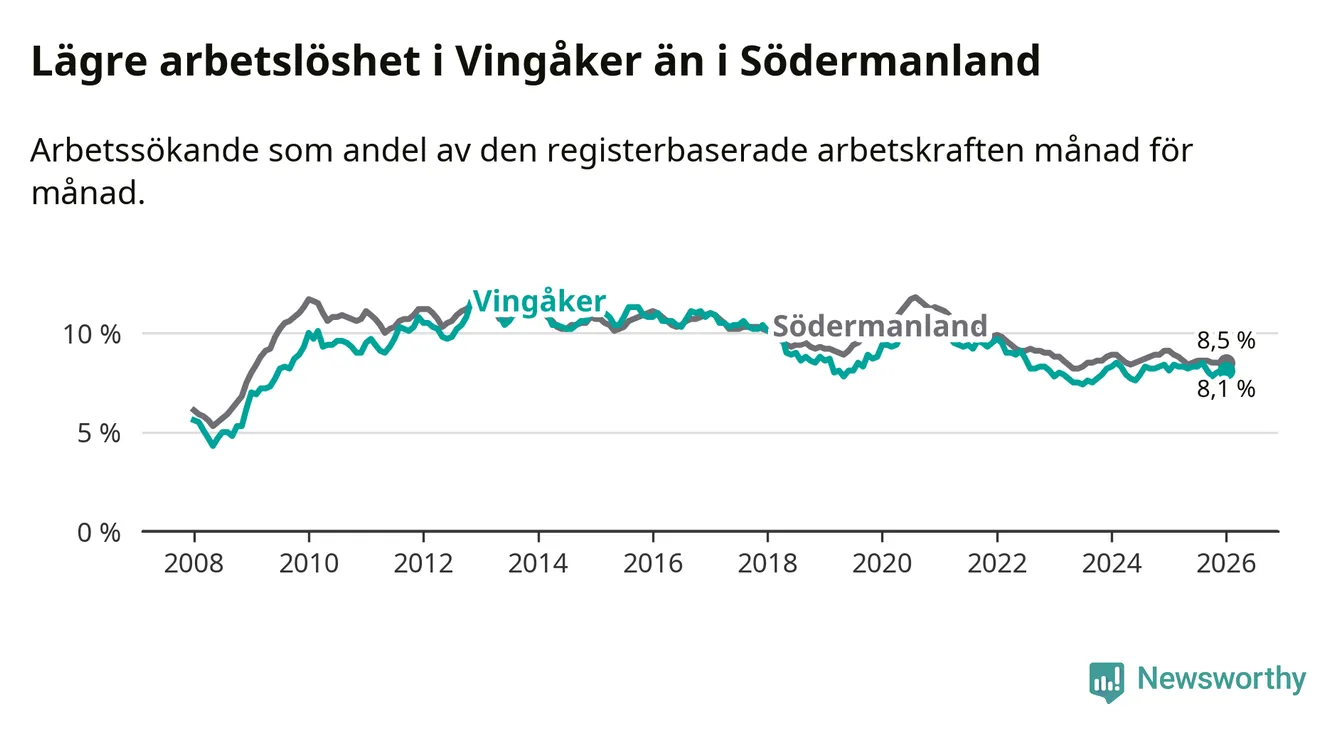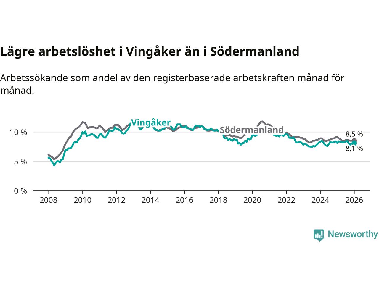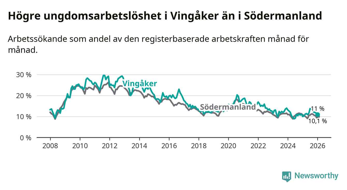 Medan Vingåker har lägre total arbetslöshet än Södermanland, ligger ungdomsarbetslösheten 0,9 procentenheter högre i Vingåker.
