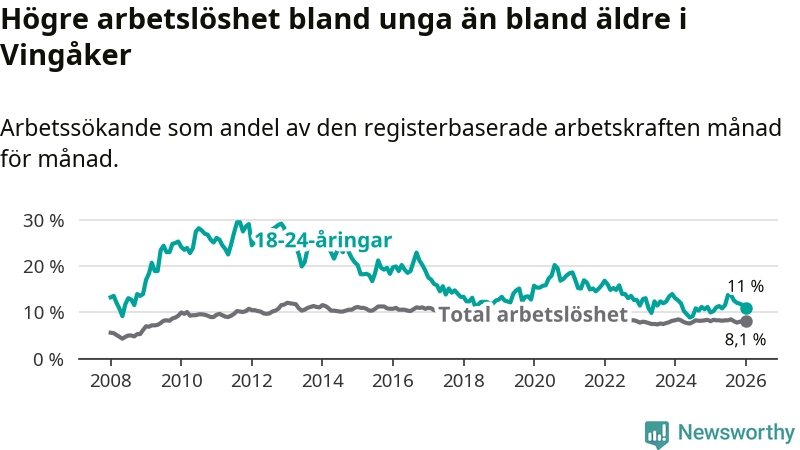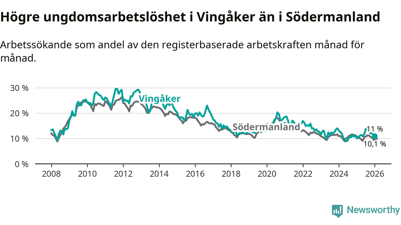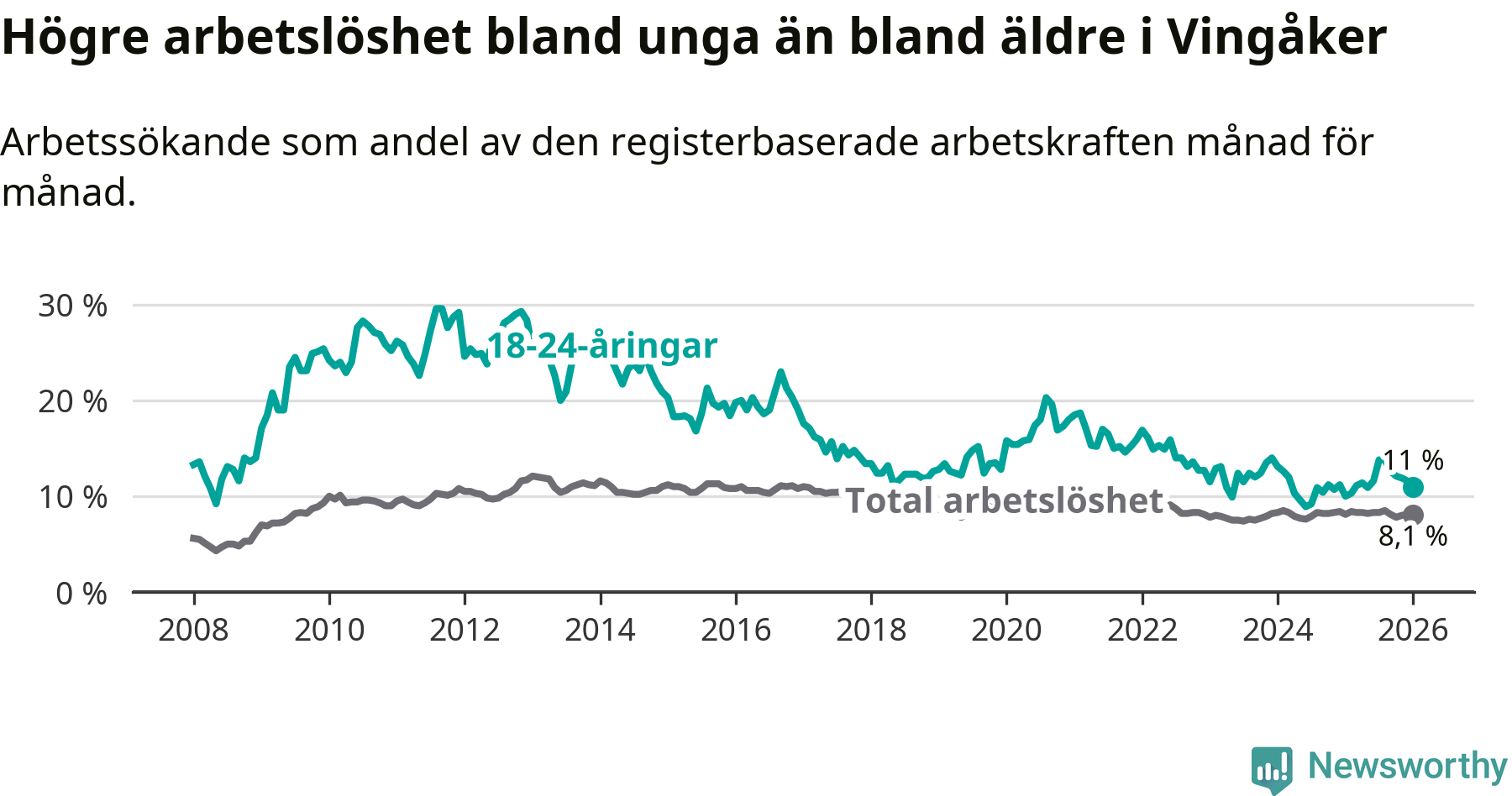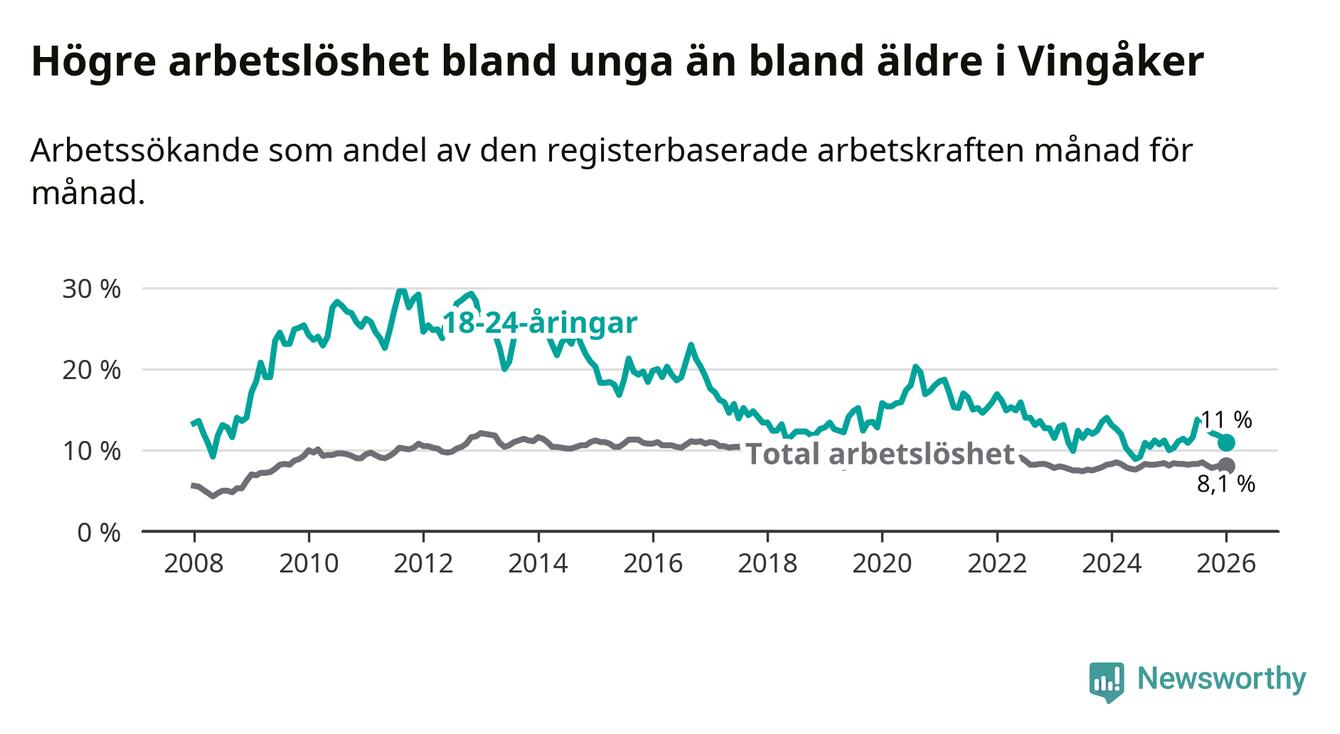 I och med den senaste månadens uppgång har de ungas arbetslöshet i Vingåker stigit tio månader i följd (upp från 11,1 procent i mars 2025 till 11,0 procent nu).