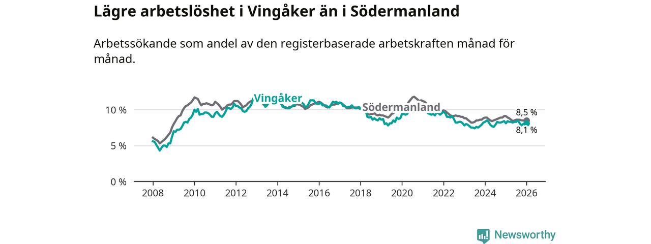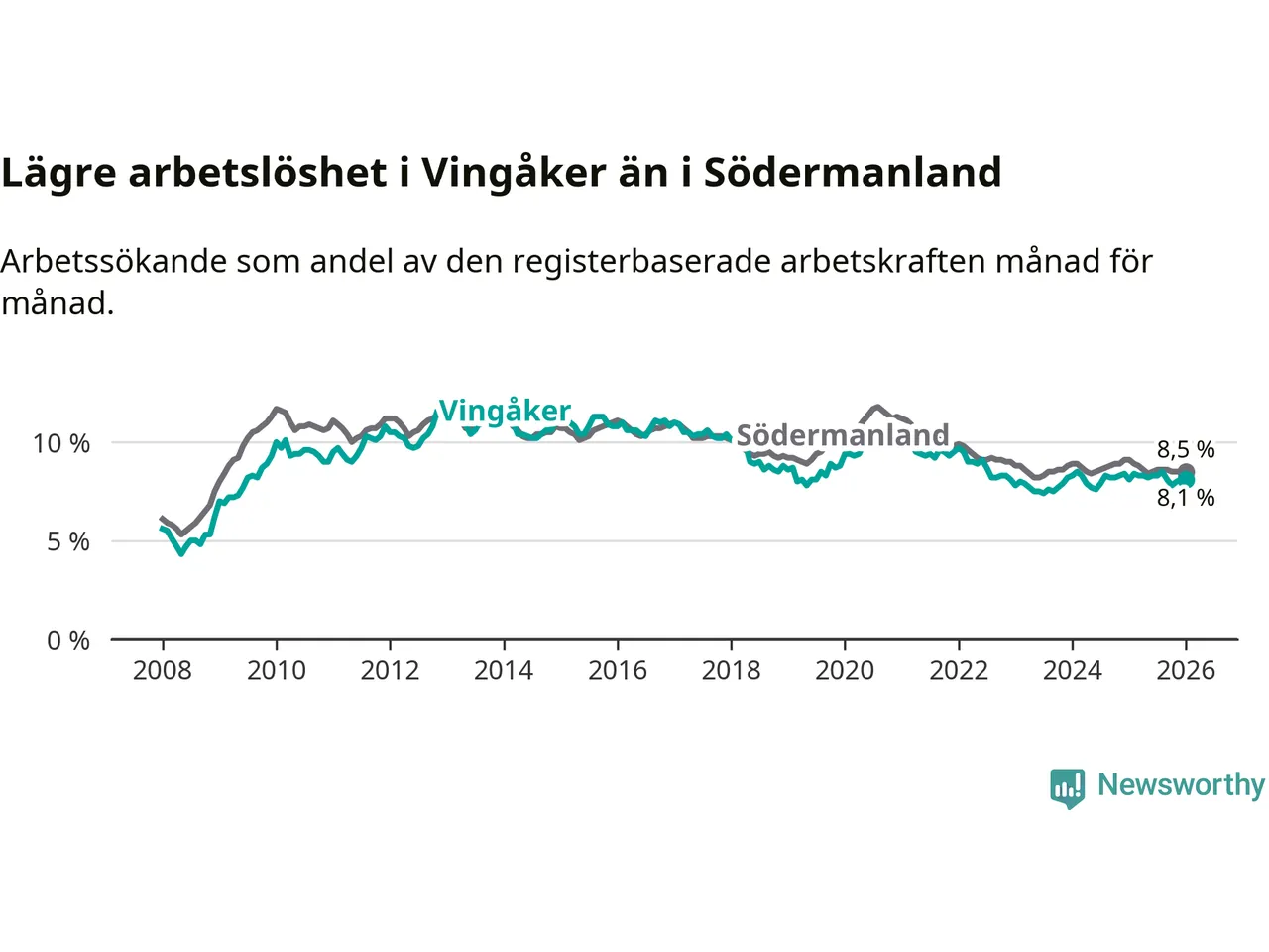Under januari månad rapporterade Vingåkers kommun en total arbetslöshet på 8,1 procent. Det är i samma nivå som i januari i fjol. I Södermanlands län däremot sjunker arbetslösheten