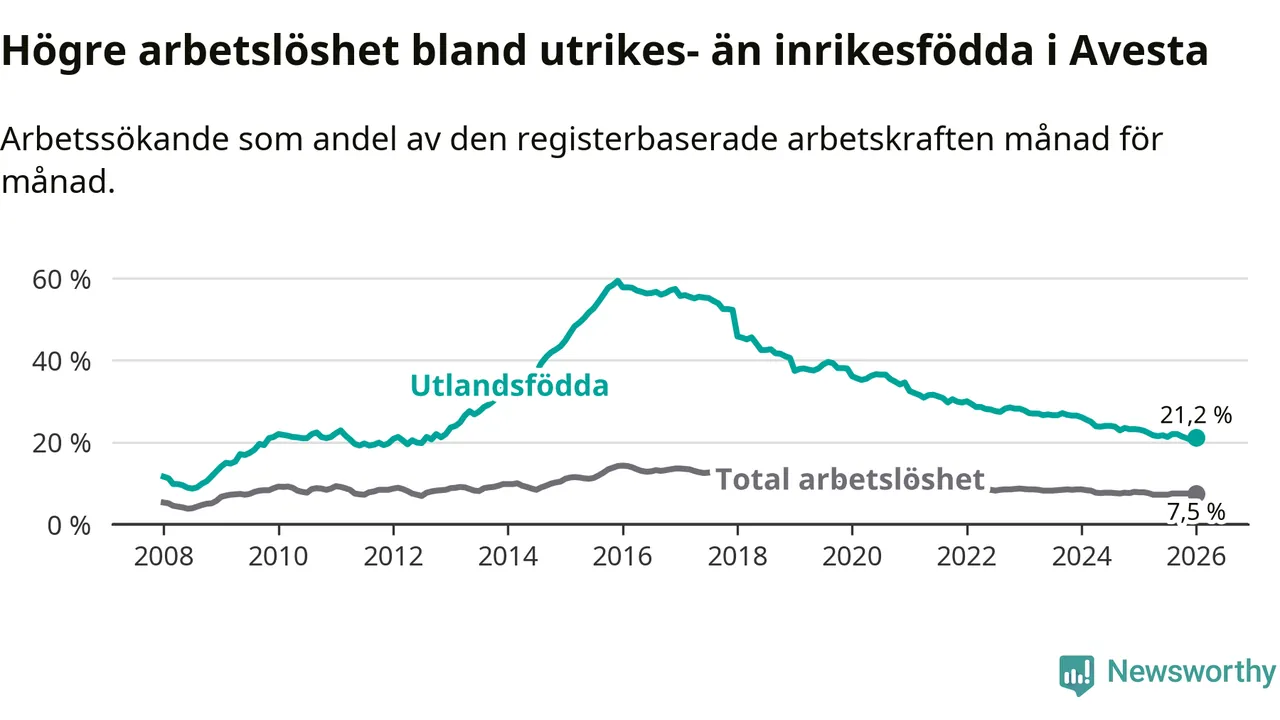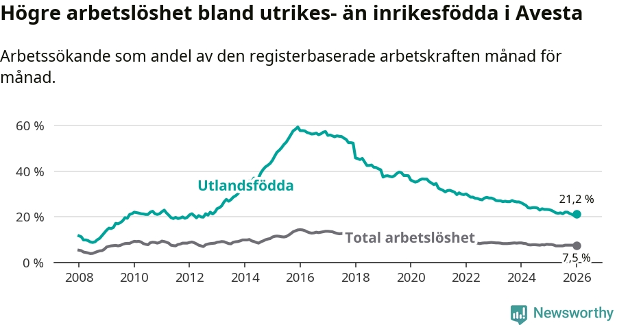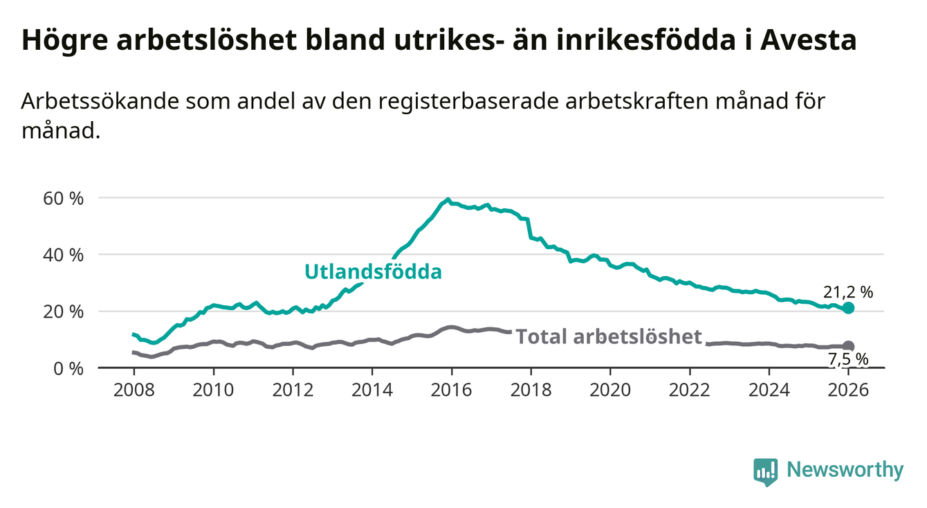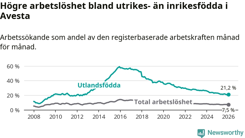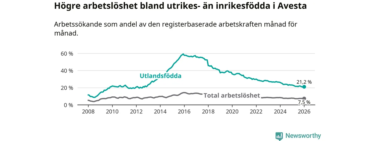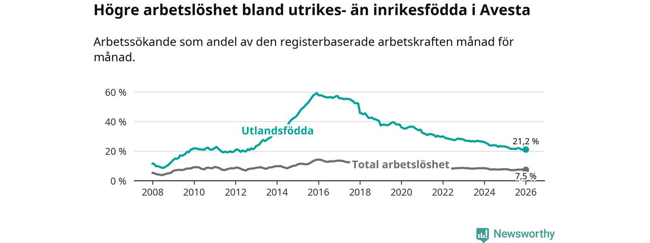 Arbetslösheten bland utlandsfödda var 21,2 procent i Avesta under januari månad, motsvarande 425 av 2 005 personer. Det är 1,9 procentenheter färre än vid samma tidpunkt i fjol (−46 om man räknar personer). Därmed har de utlandsföddas arbetslöshet varit lägre än vid samma tidpunkt i fjol i över nio år i sträck. Sedan september 2016 har arbetslösheten bland utlandsfödda minskat från 56,0 till 21,2 procent.