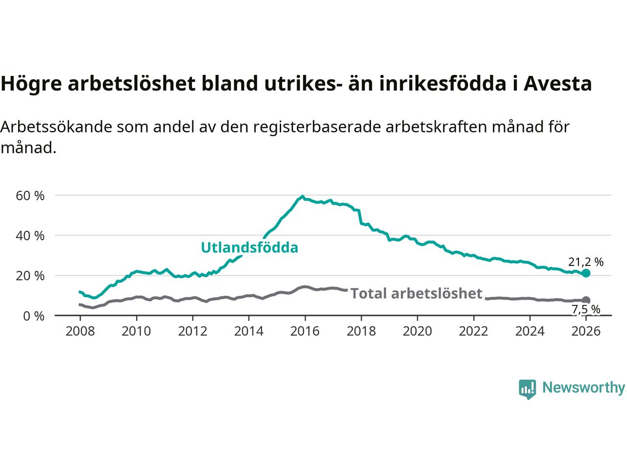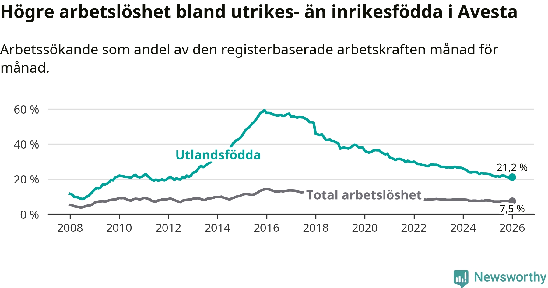 Läs mer om arbetslösheten bland utlandsfödda längre ner i den här texten.