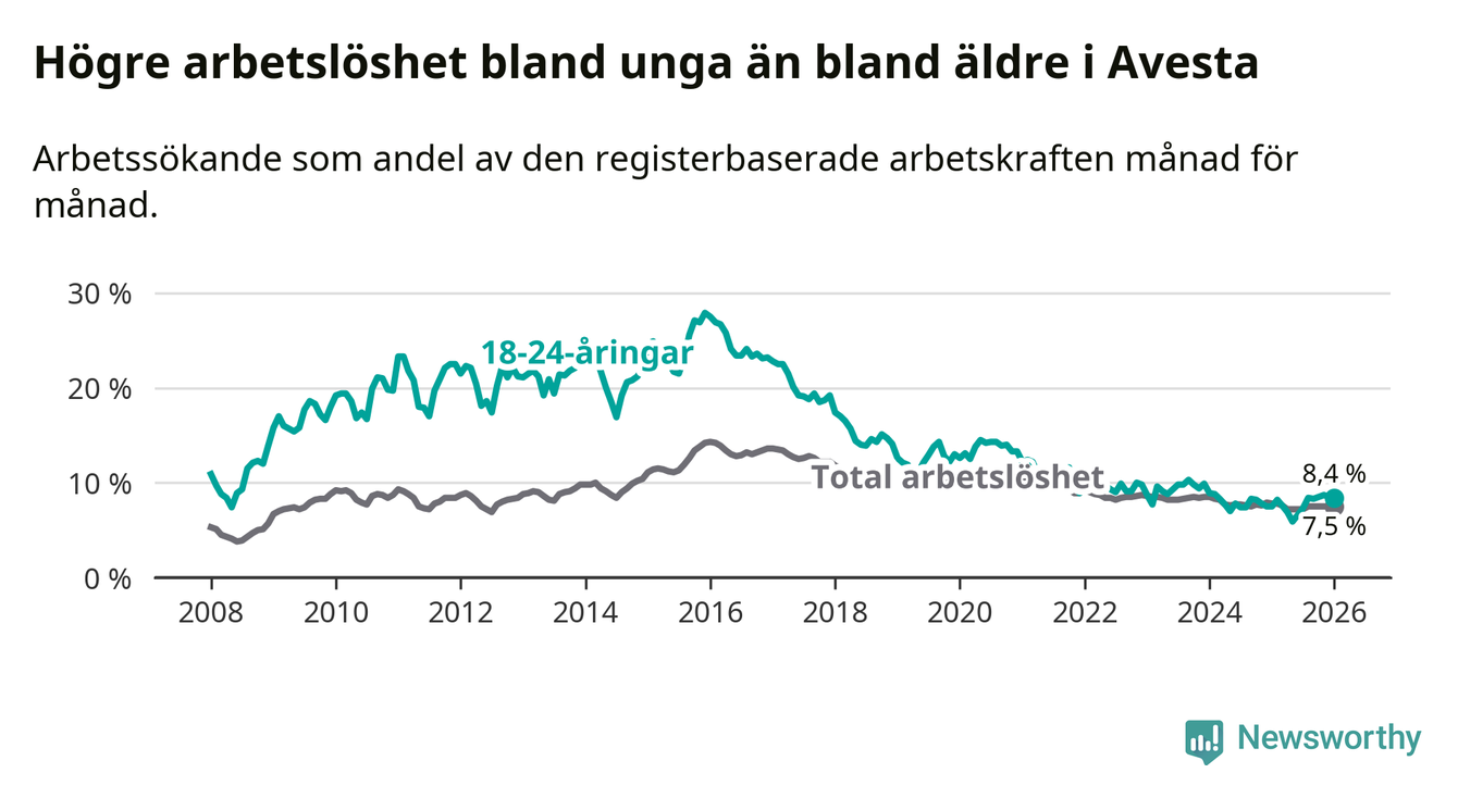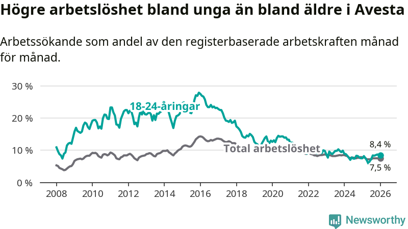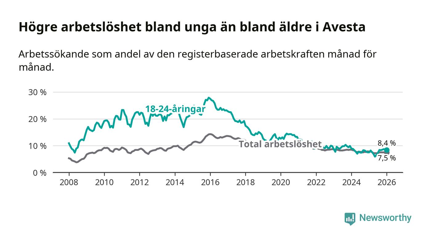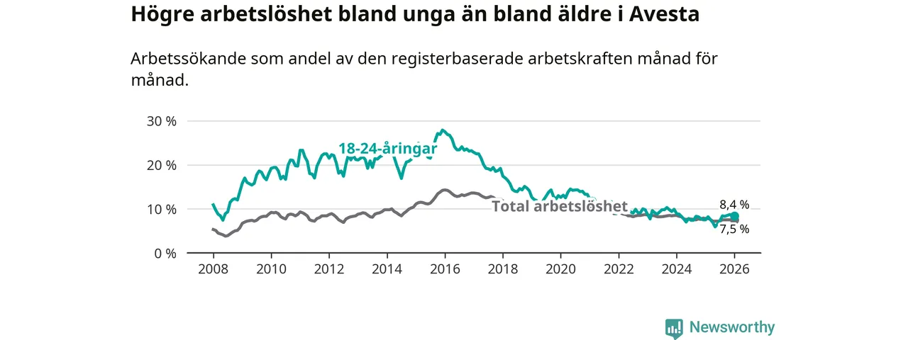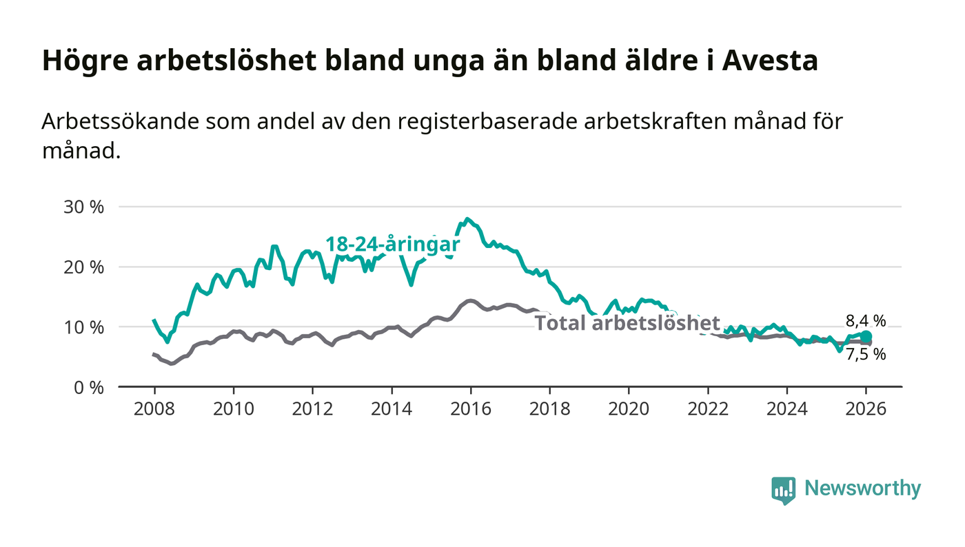Till skillnad från den totala arbetslösheten stiger arbetslösheten bland unga (+0,9 procentenheter). I januari var 8,4 procent av 18–24-åringarna inskrivna som arbetssökande (motsvarande 81 personer). Mäter vi antalet inskrivna ser vi en ökning med nio personer på ett års sikt.