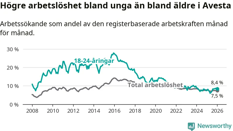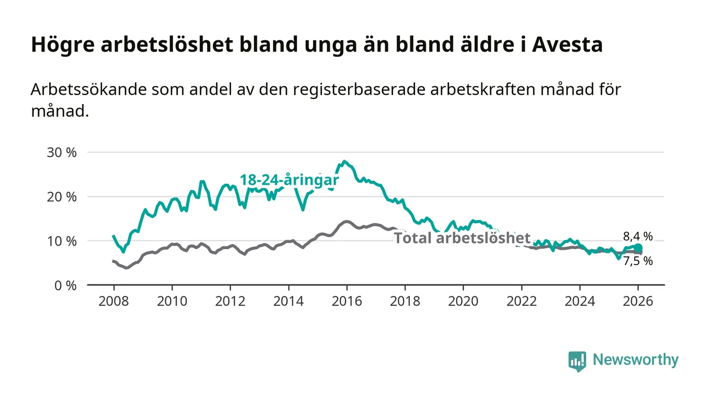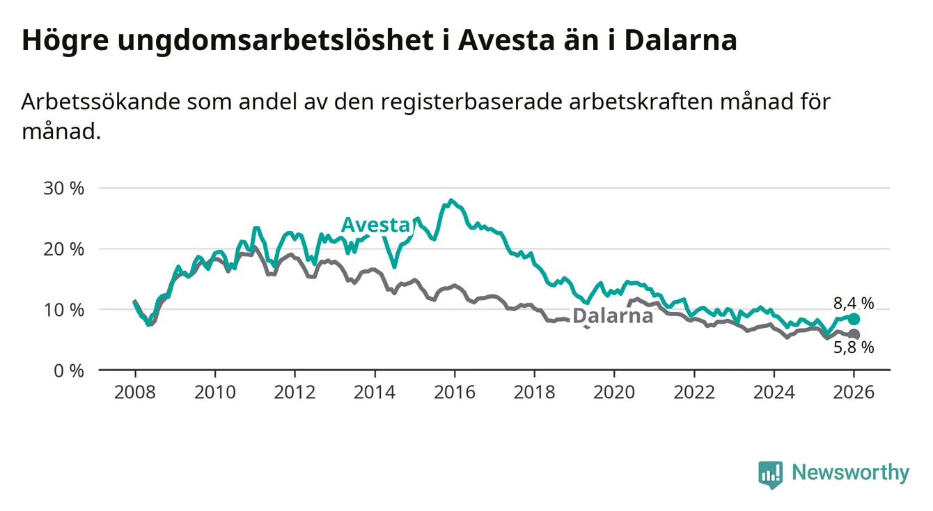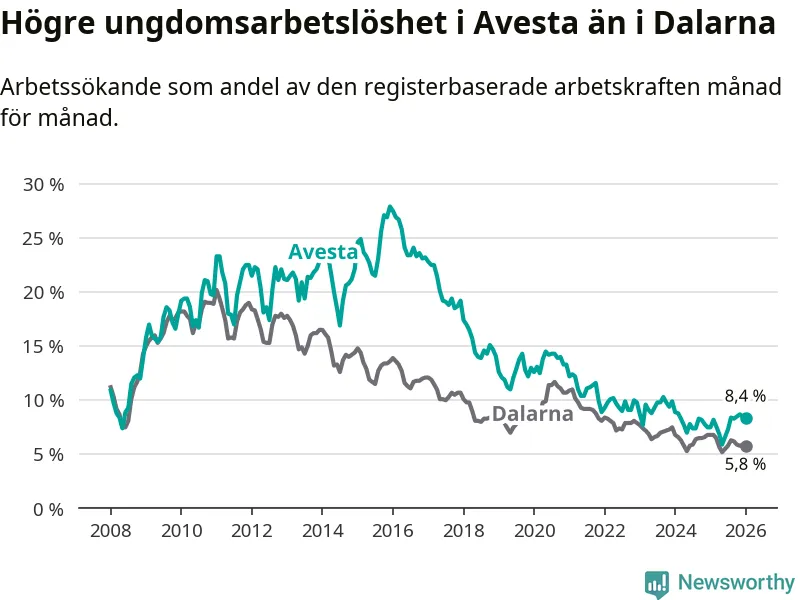 Precis som den totala arbetslösheten ligger ungdomsarbetslösheten i Avesta högre än i Dalarna som helhet. Skillnaden mellan kommunen och länet är 2,6 procentenheter.