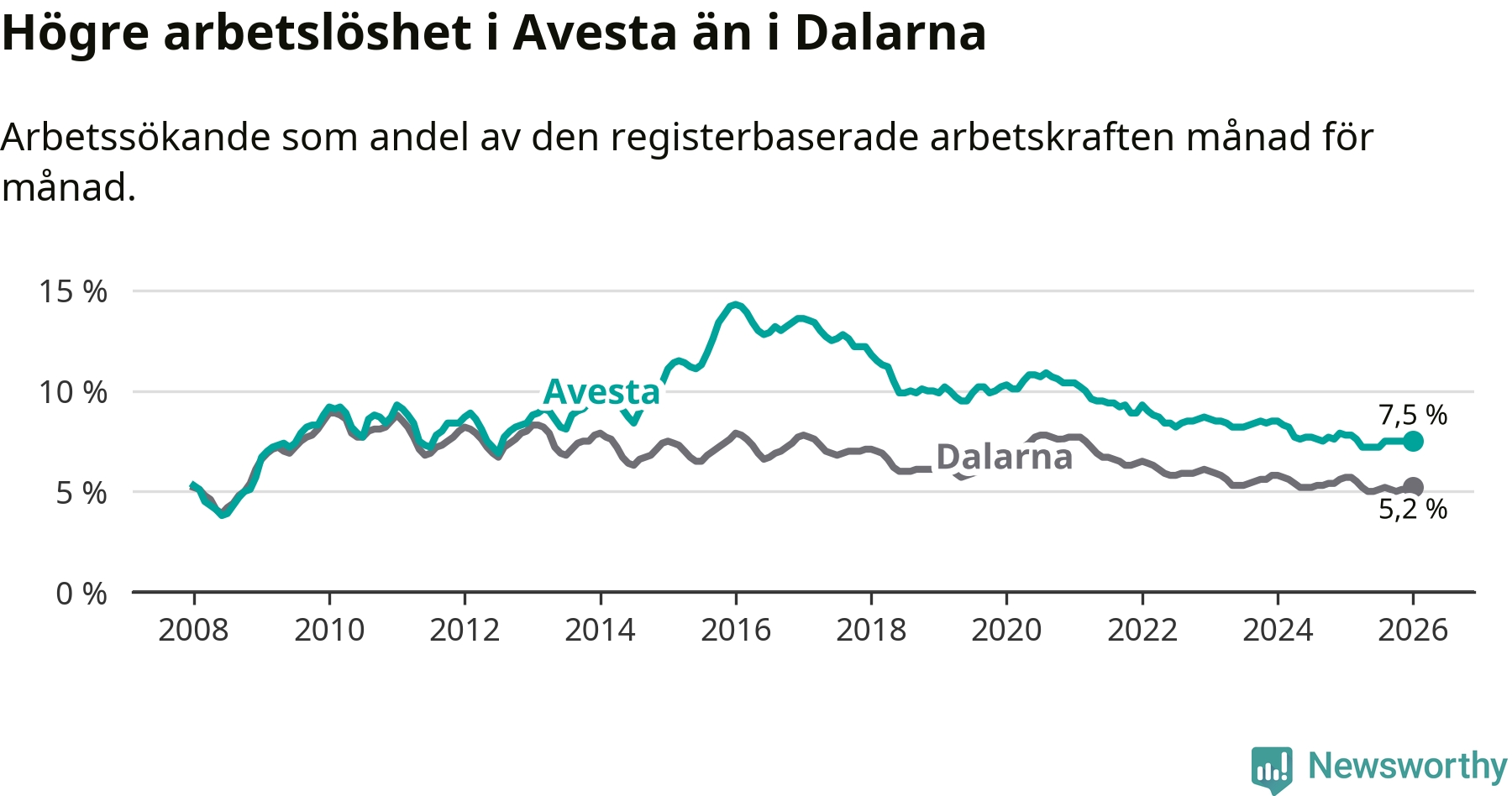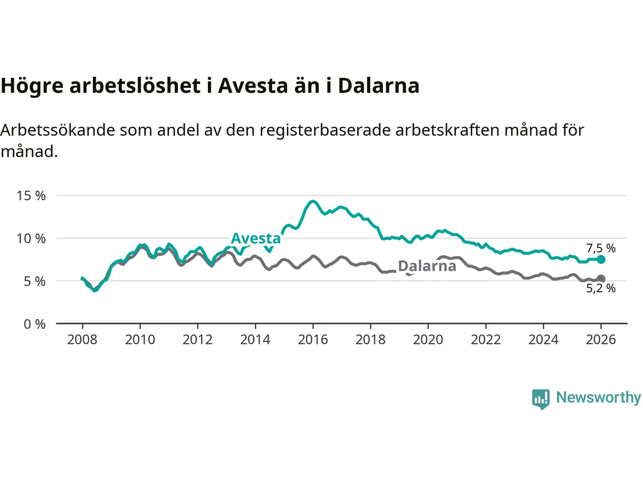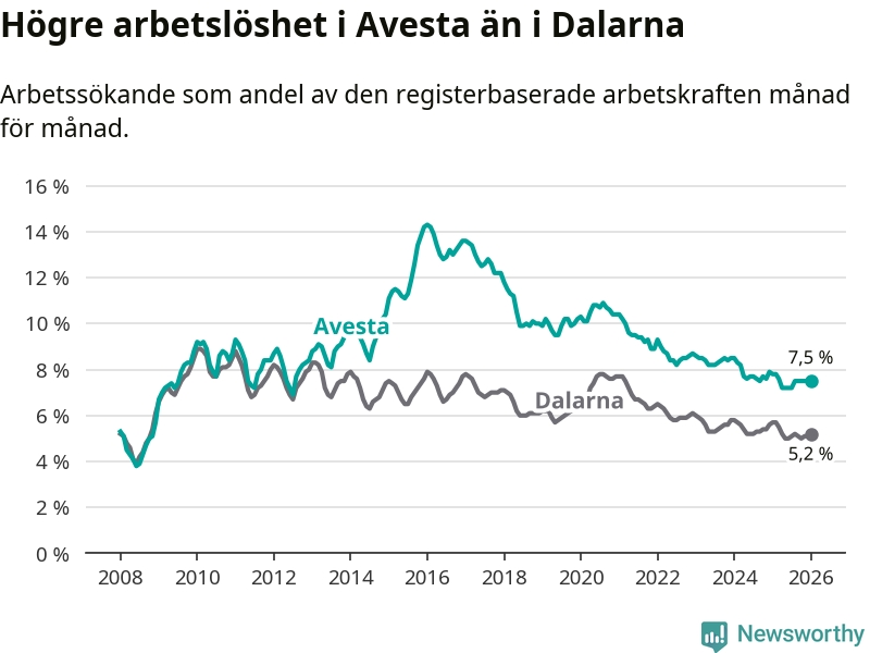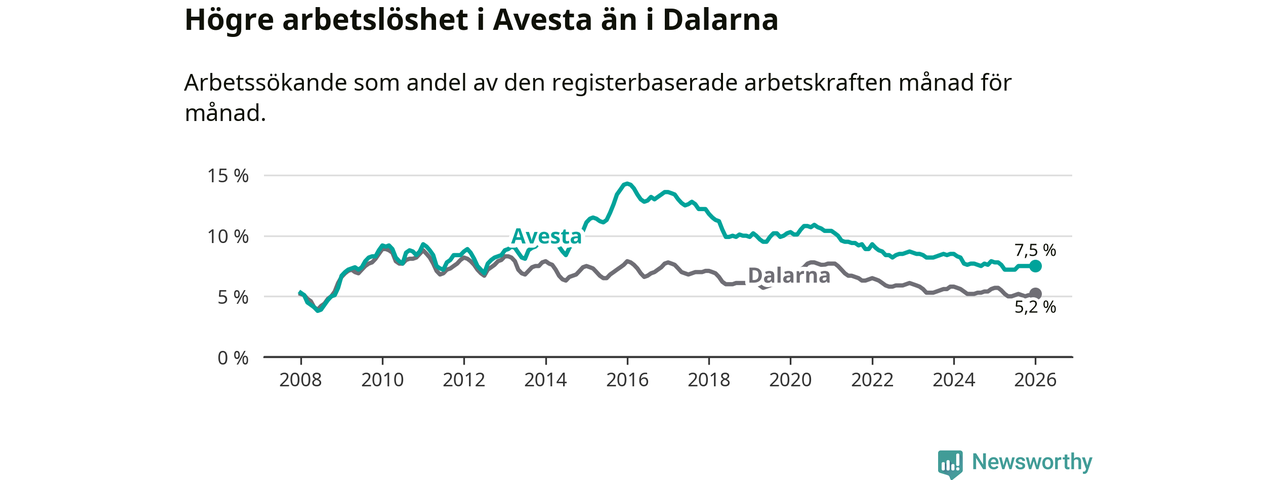 Under januari månad rapporterade Avesta kommun en total arbetslöshet på 7,5 procent. Det är en minskning jämfört med samma tidpunkt i fjol (−0,3 procentenheter). Även i Dalarnas län sjunker arbetslösheten .