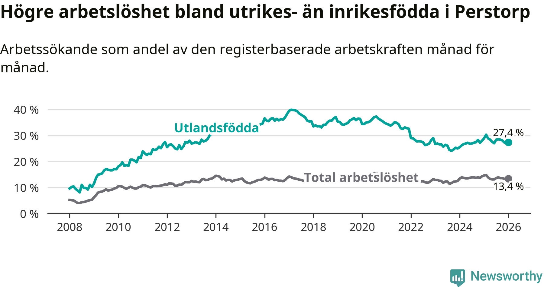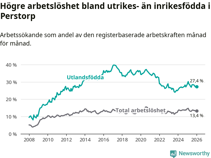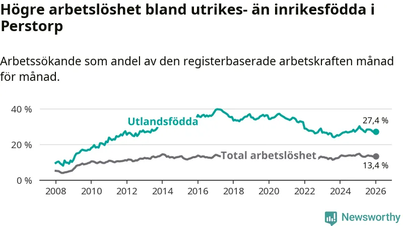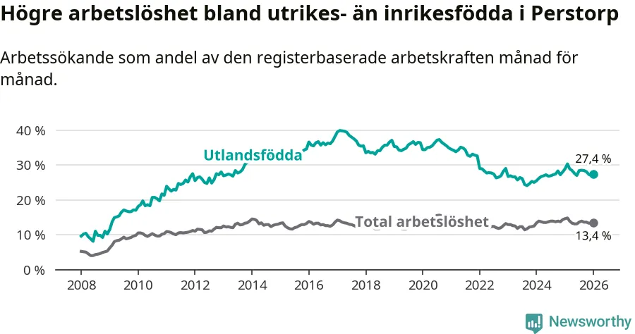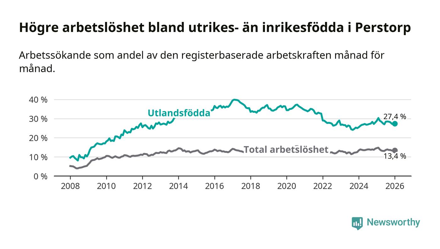 Arbetslösheten bland utlandsfödda var 27,4 procent i Perstorp under januari månad, motsvarande 278 av 1 015 personer. Det är 1,5 procentenheter färre än vid samma tidpunkt i fjol (−9 om man räknar personer).