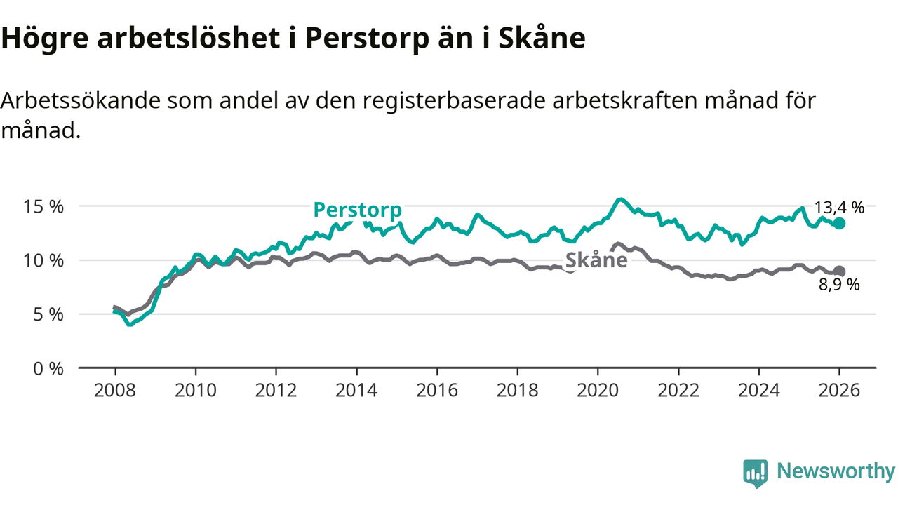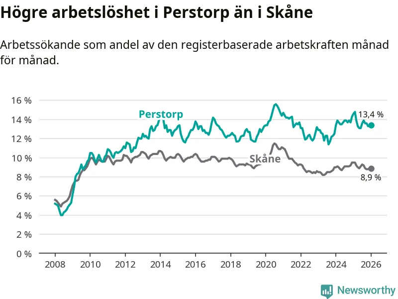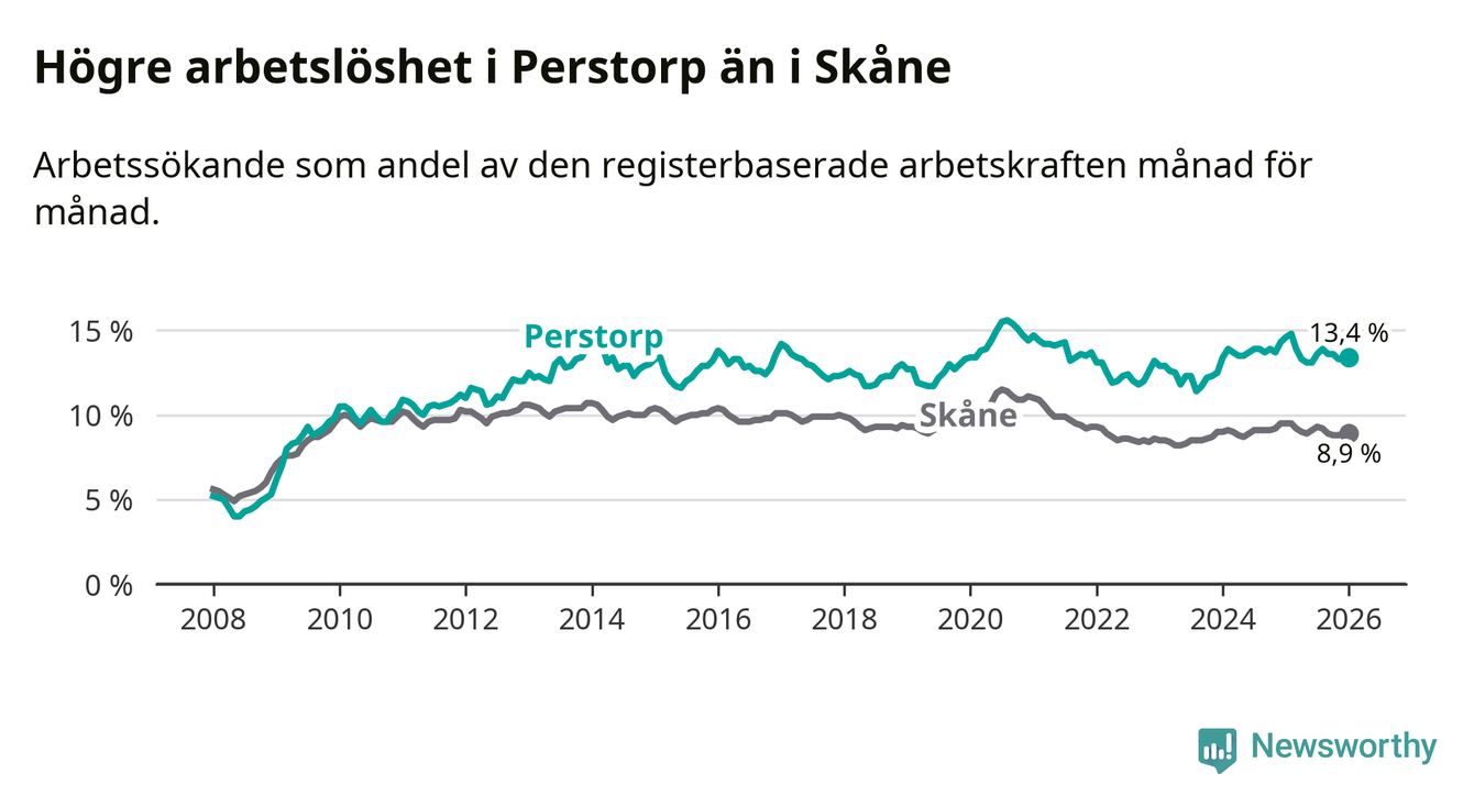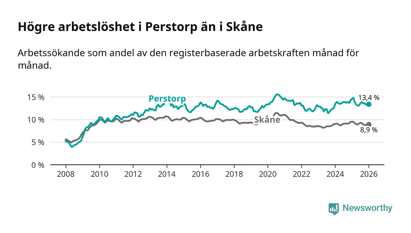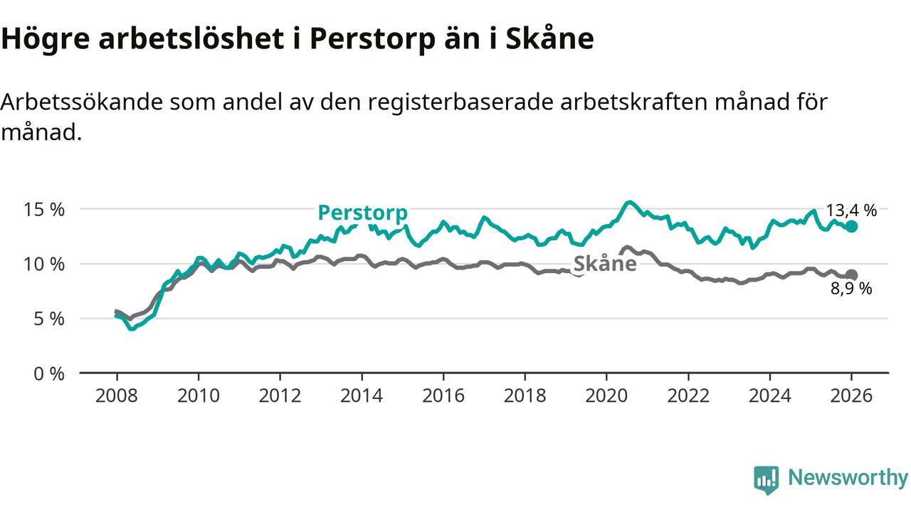 Under januari månad rapporterade Perstorps kommun en total arbetslöshet på 13,4 procent. Det är en minskning jämfört med samma tidpunkt i fjol (−1,2 procentenheter). Även i Skåne län sjunker arbetslösheten .