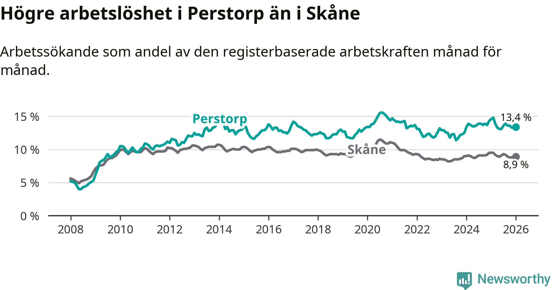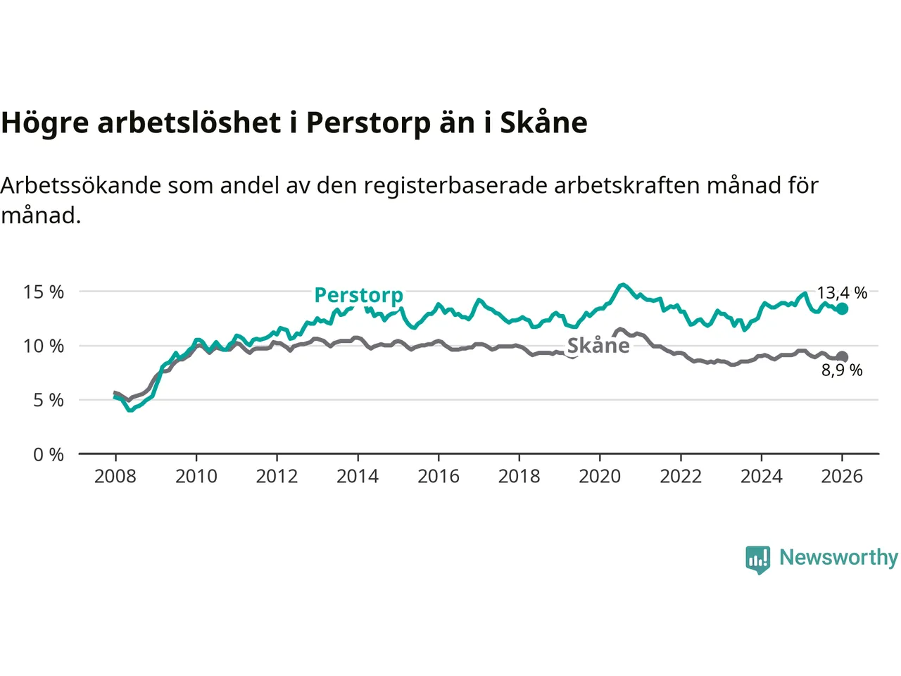 Även om arbetslösheten i Perstorp alltså minskar, så ligger den fortfarande över snittet i hela Skåne län (13,4 procent i kommunen, jämfört med 8,9 procent i hela länet). Perstorp har därmed även den högsta arbetslöshetsnivån i inte bara länet, utan även hela Sverige. Lomma har den lägsta (3,9 procent). För att Perstorp skulle komma ner i samma arbetslöshetsnivå som Lomma skulle 307 personer behöva sysselsättas.