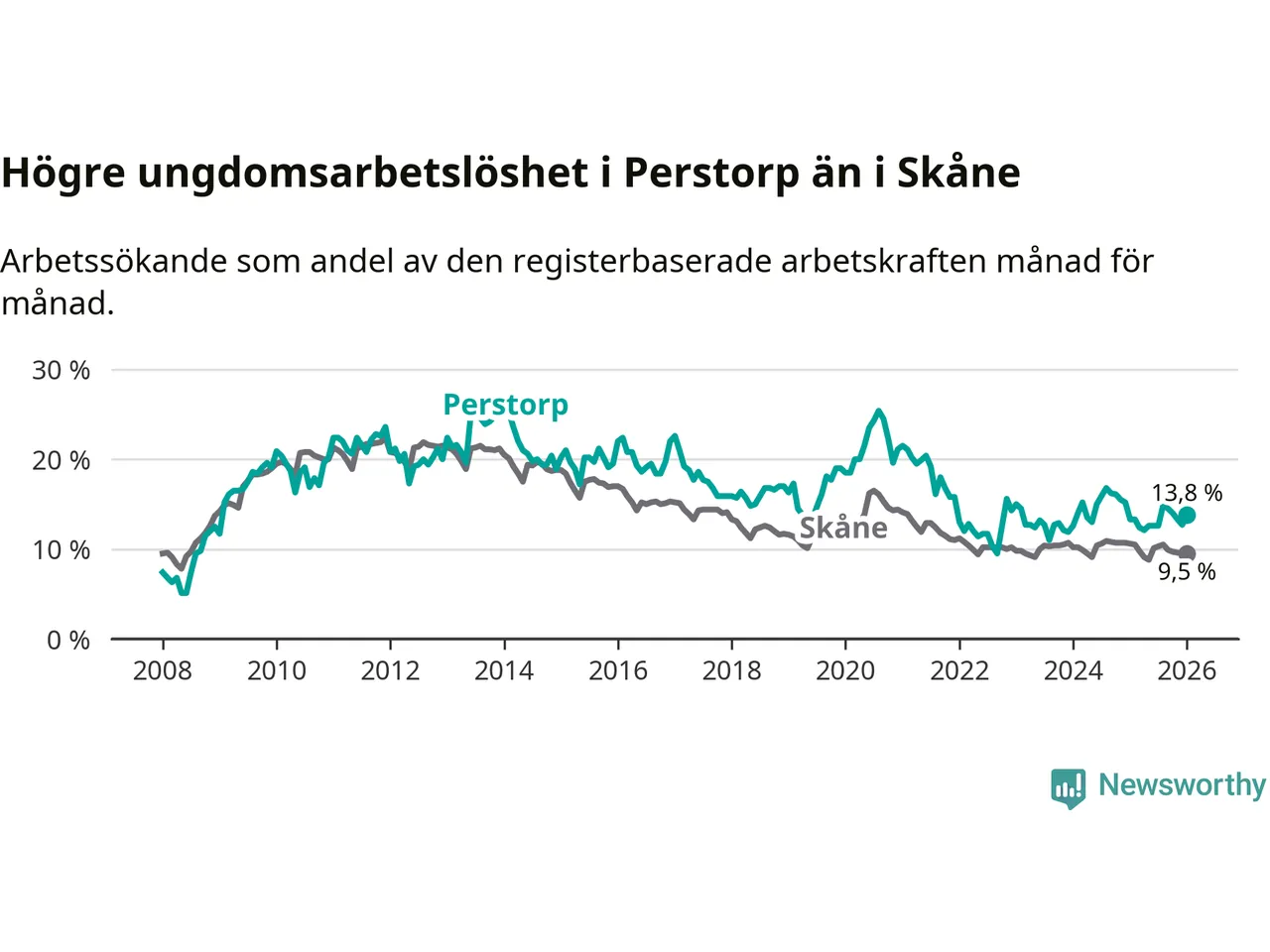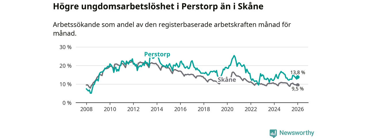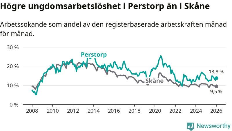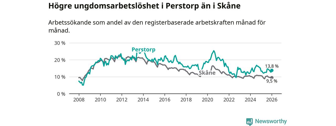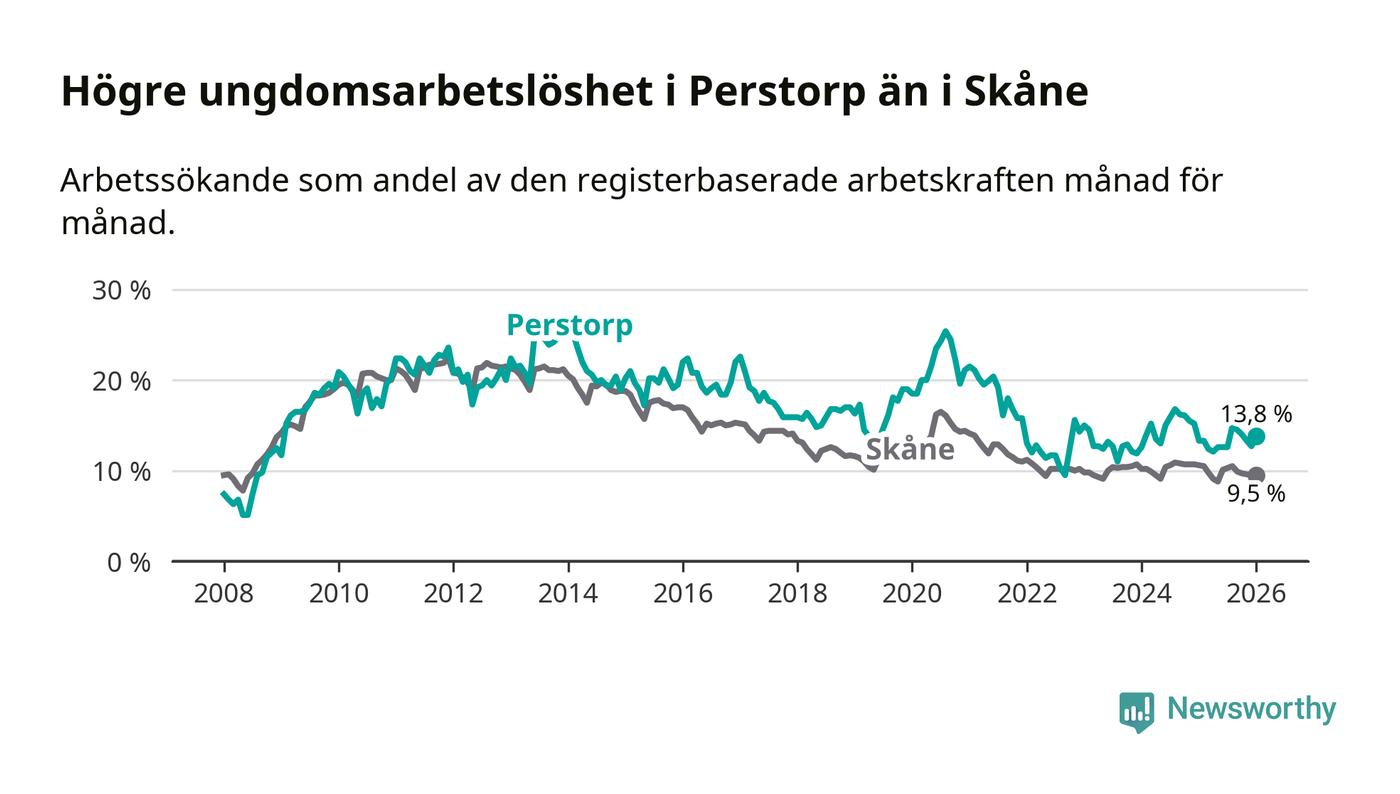 Precis som den totala arbetslösheten ligger ungdomsarbetslösheten i Perstorp högre än i Skåne som helhet. Skillnaden mellan kommunen och länet är 4,3 procentenheter.