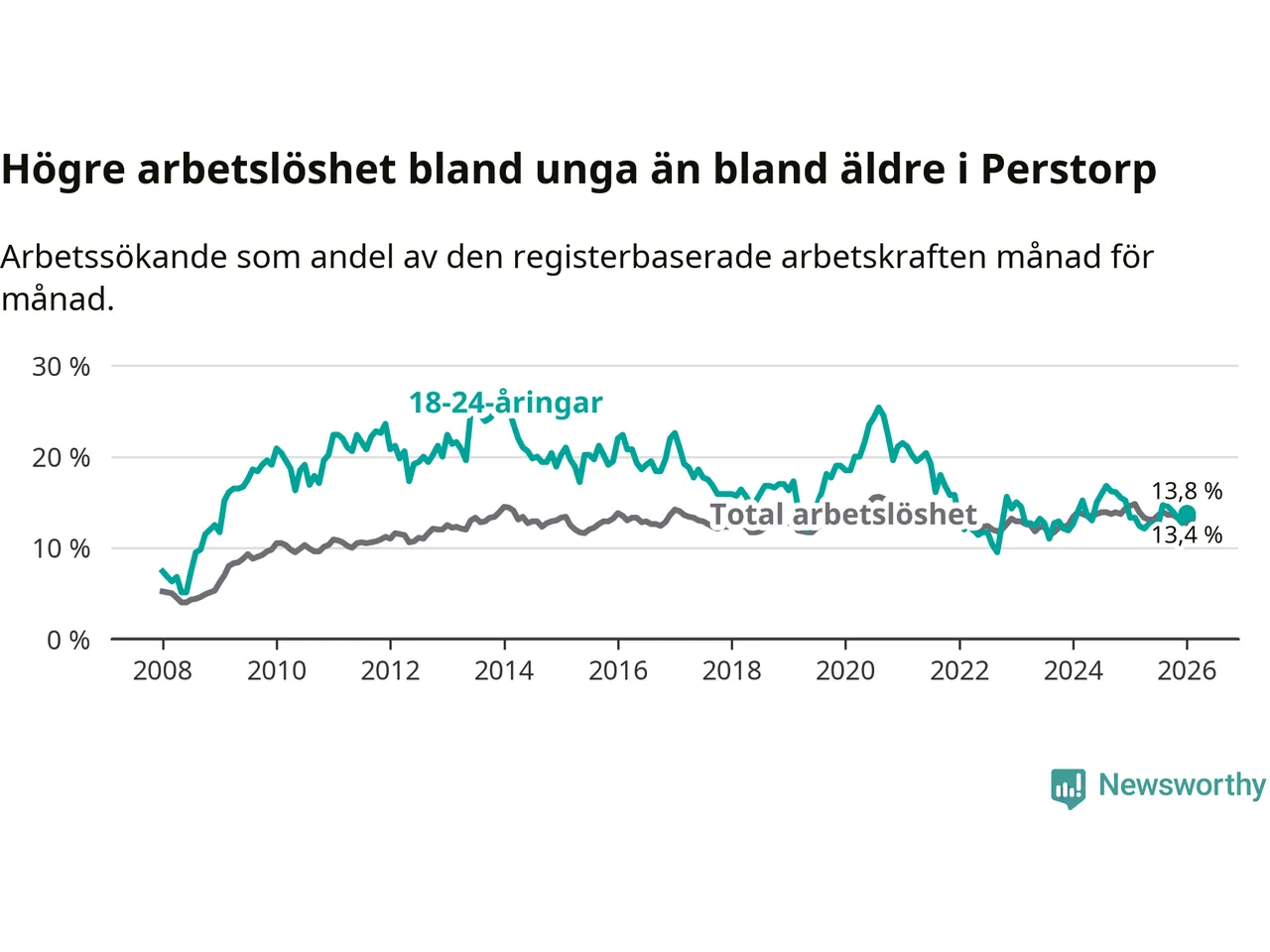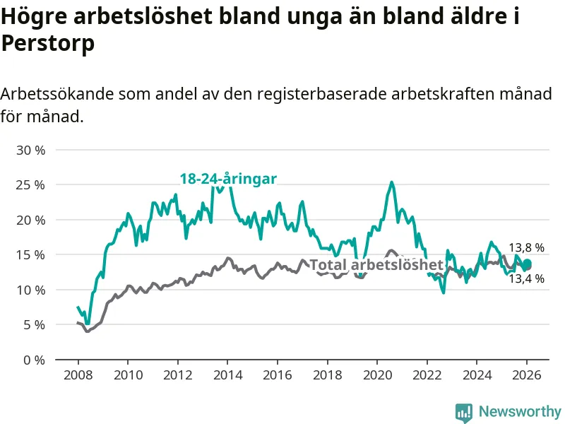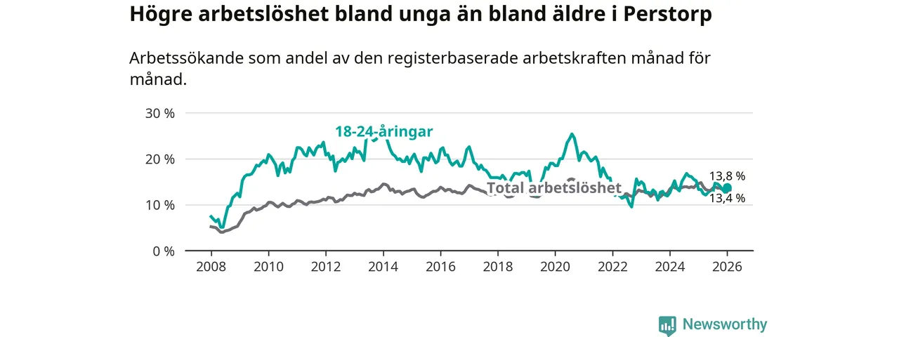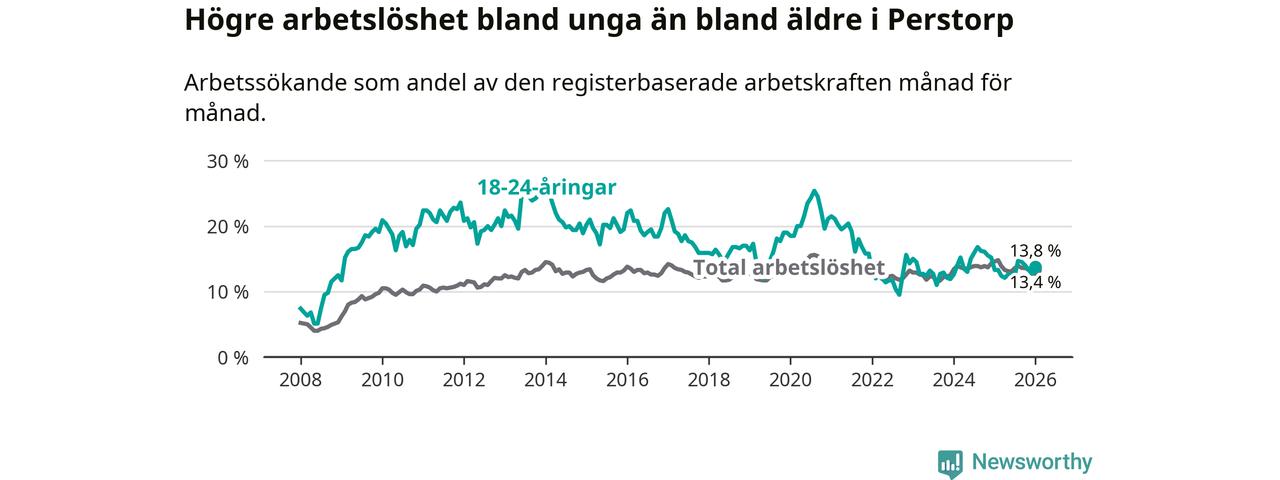 Till skillnad från den totala arbetslösheten stiger arbetslösheten bland unga (+0,5 procentenheter). I januari var 13,8 procent av 18–24-åringarna inskrivna som arbetssökande (motsvarande 48 personer). Mäter vi antalet inskrivna ser vi en ökning med två personer på ett års sikt.
