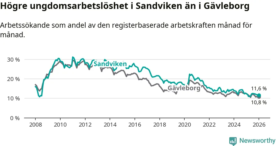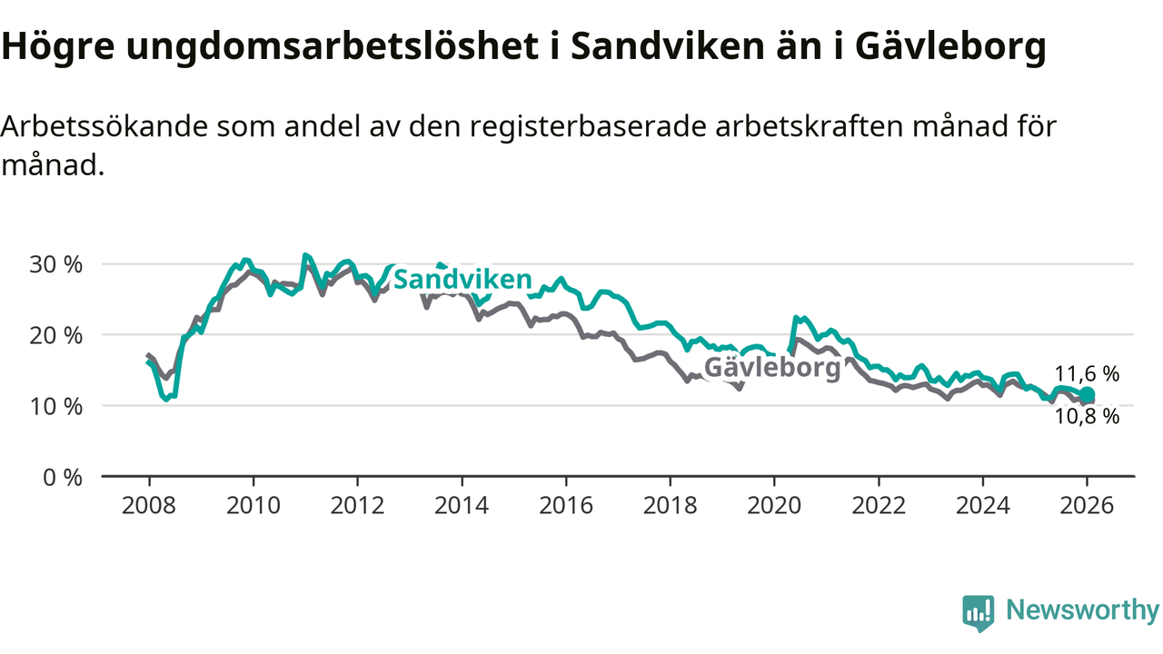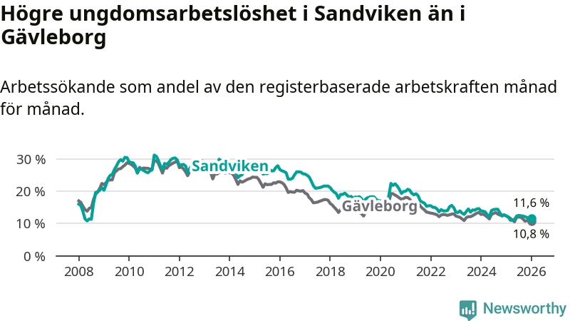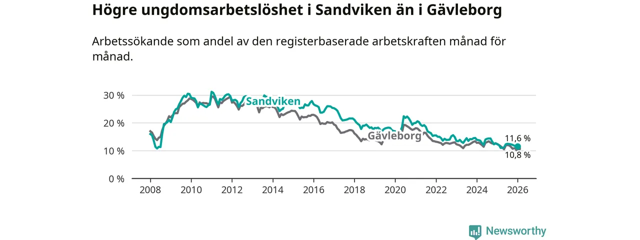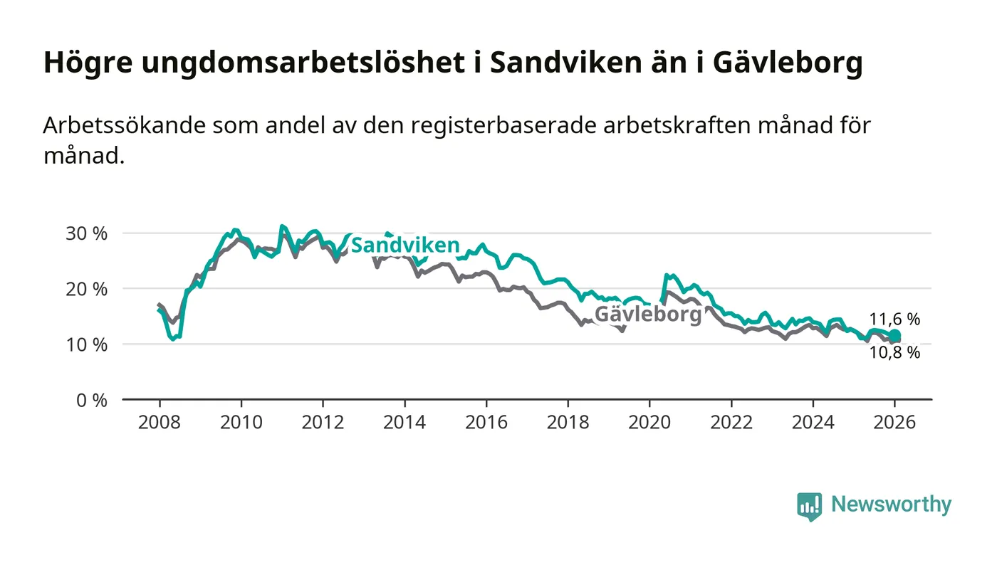 Precis som den totala arbetslösheten ligger ungdomsarbetslösheten i Sandviken högre än i Gävleborg som helhet. Skillnaden mellan kommunen och länet är 0,8 procentenheter.