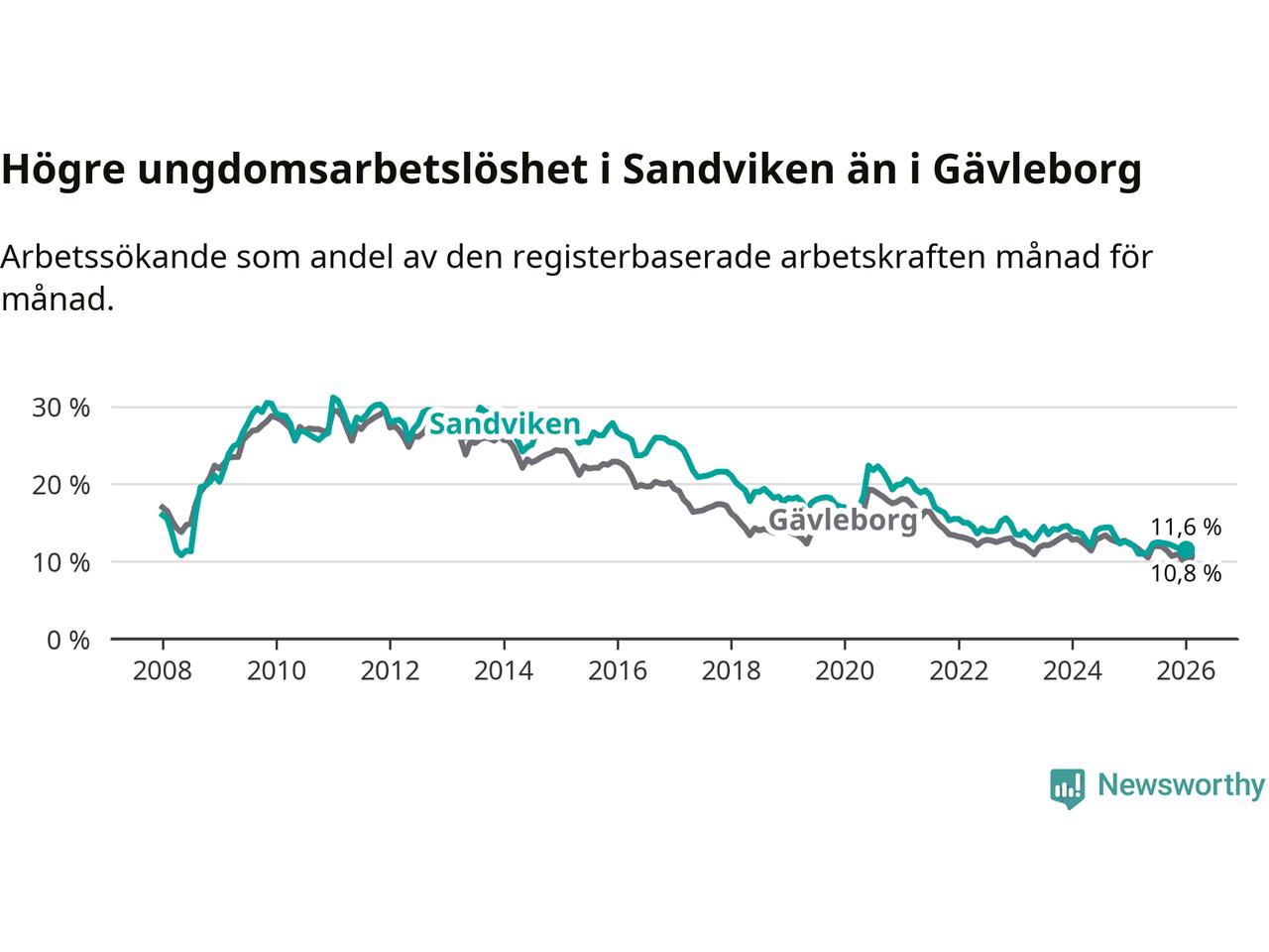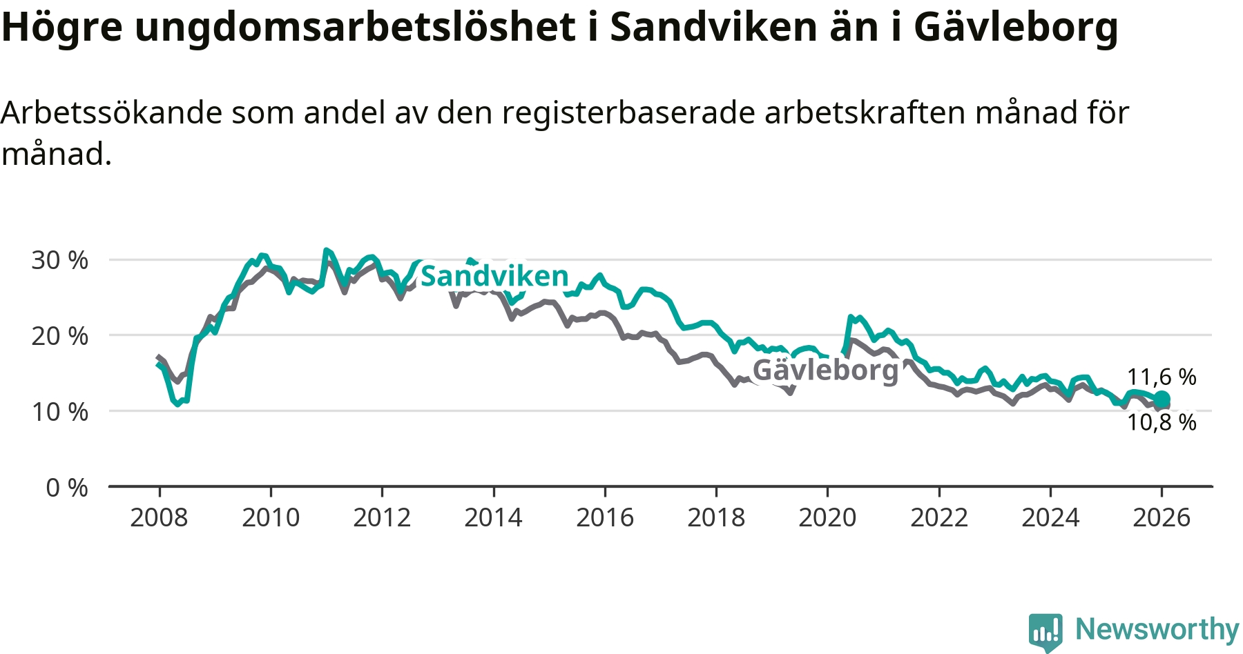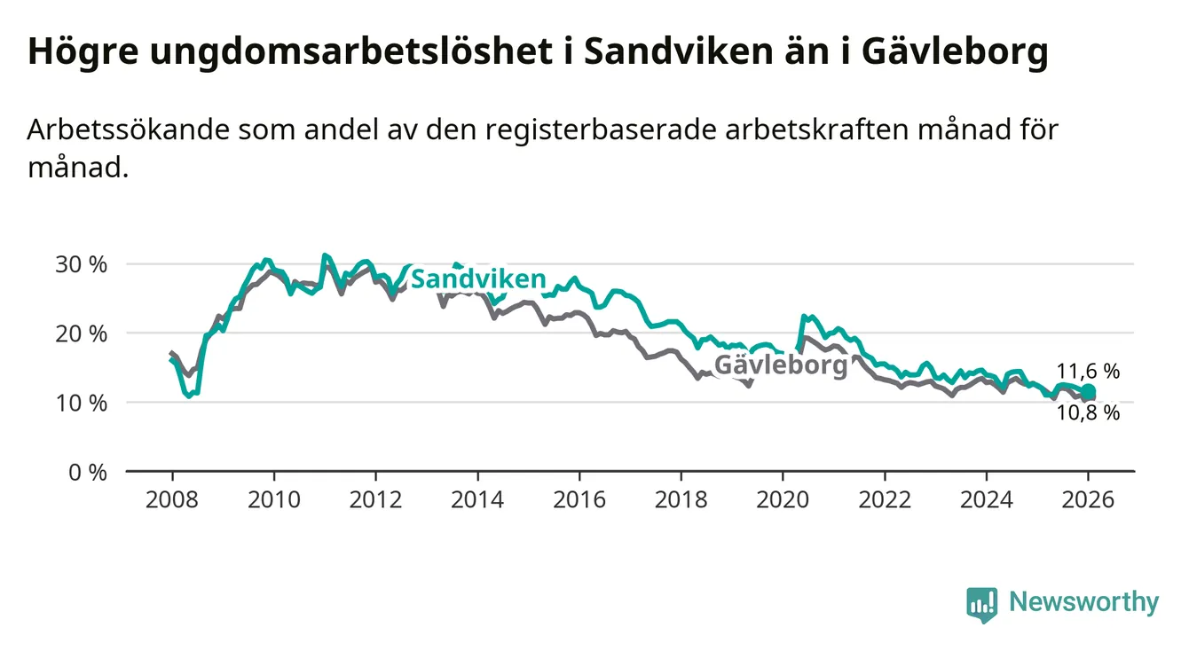 Precis som den totala arbetslösheten ligger ungdomsarbetslösheten i Sandviken högre än i Gävleborg som helhet. Skillnaden mellan kommunen och länet är 0,8 procentenheter.