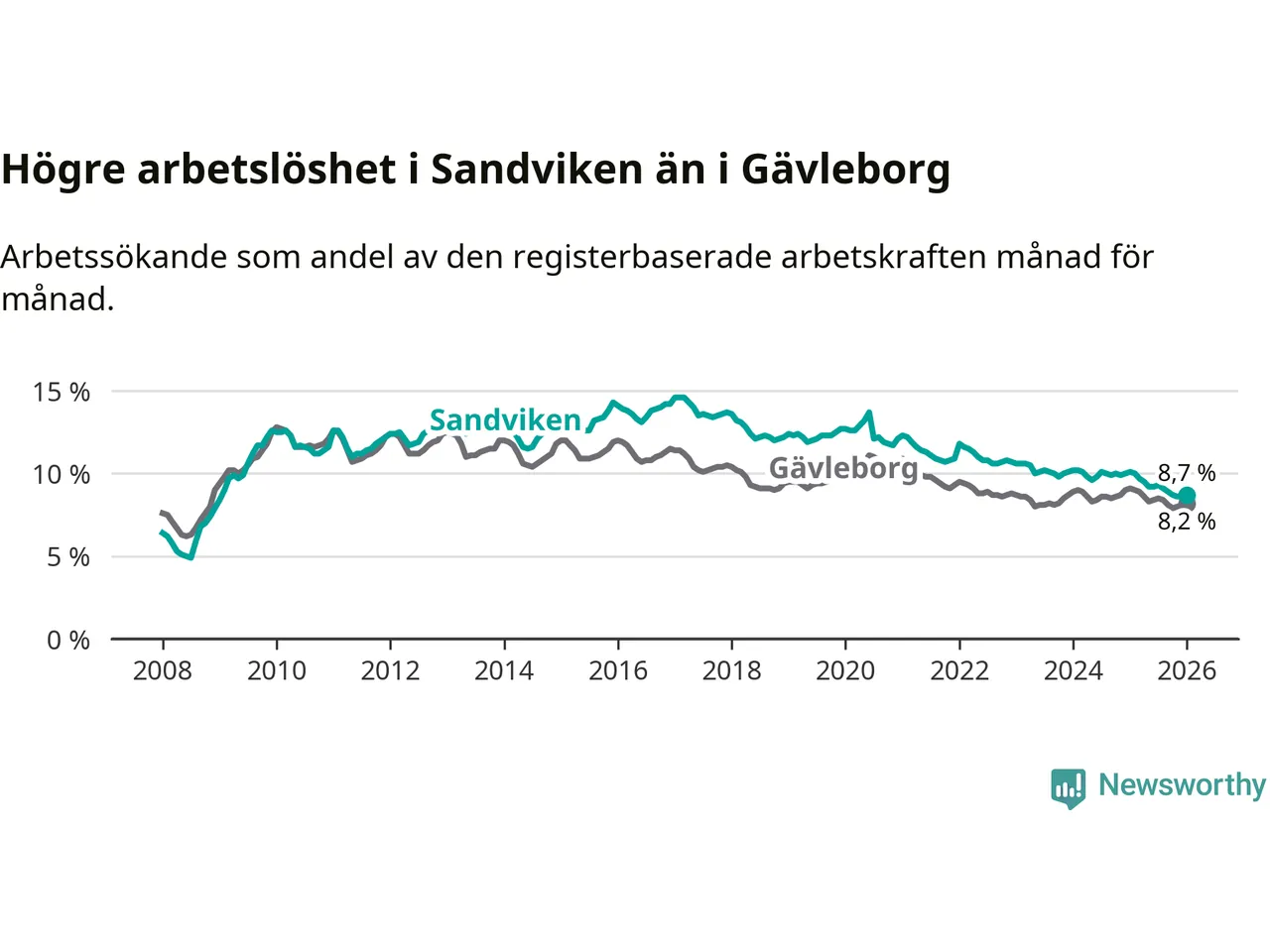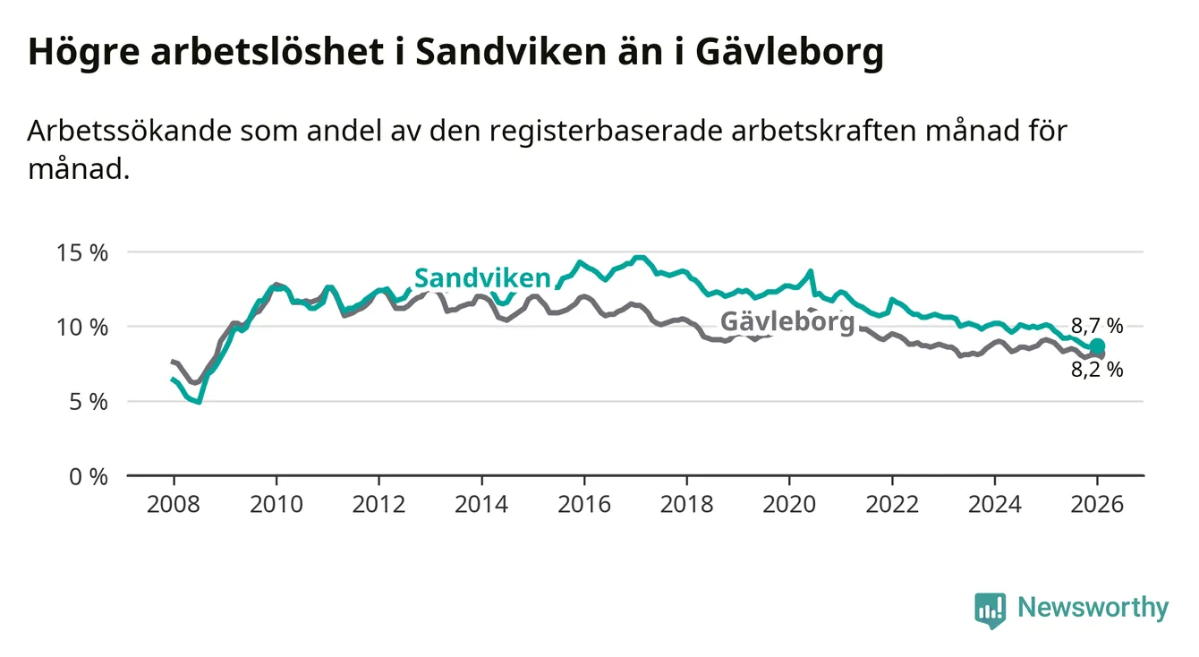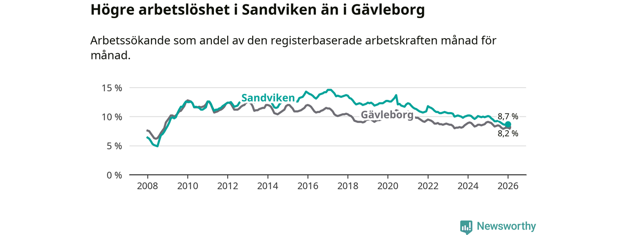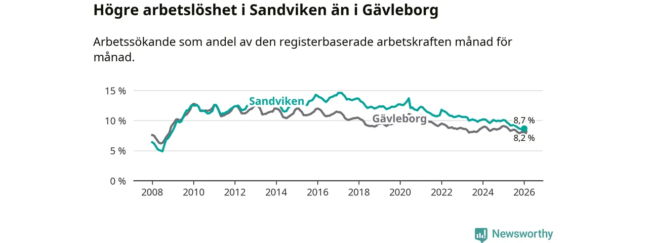 Det är 15:e månaden i följd som arbetslösheten i Sandviken är lägre än den var under samma tidpunkt året innan. Sedan oktober 2024 har arbetslösheten gått ner från 10,0 till 8,7 procent.