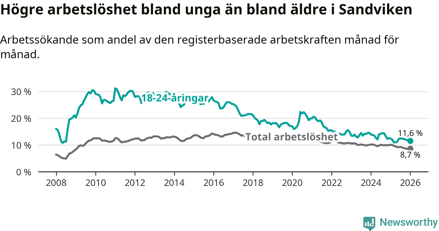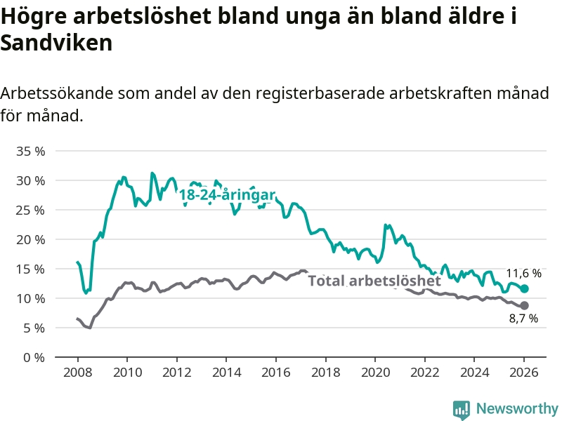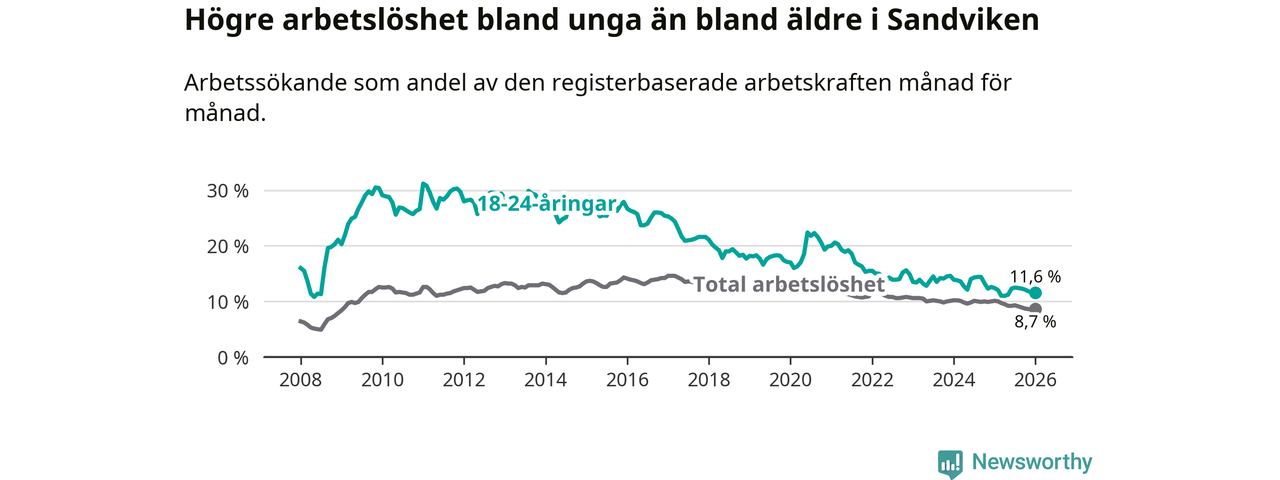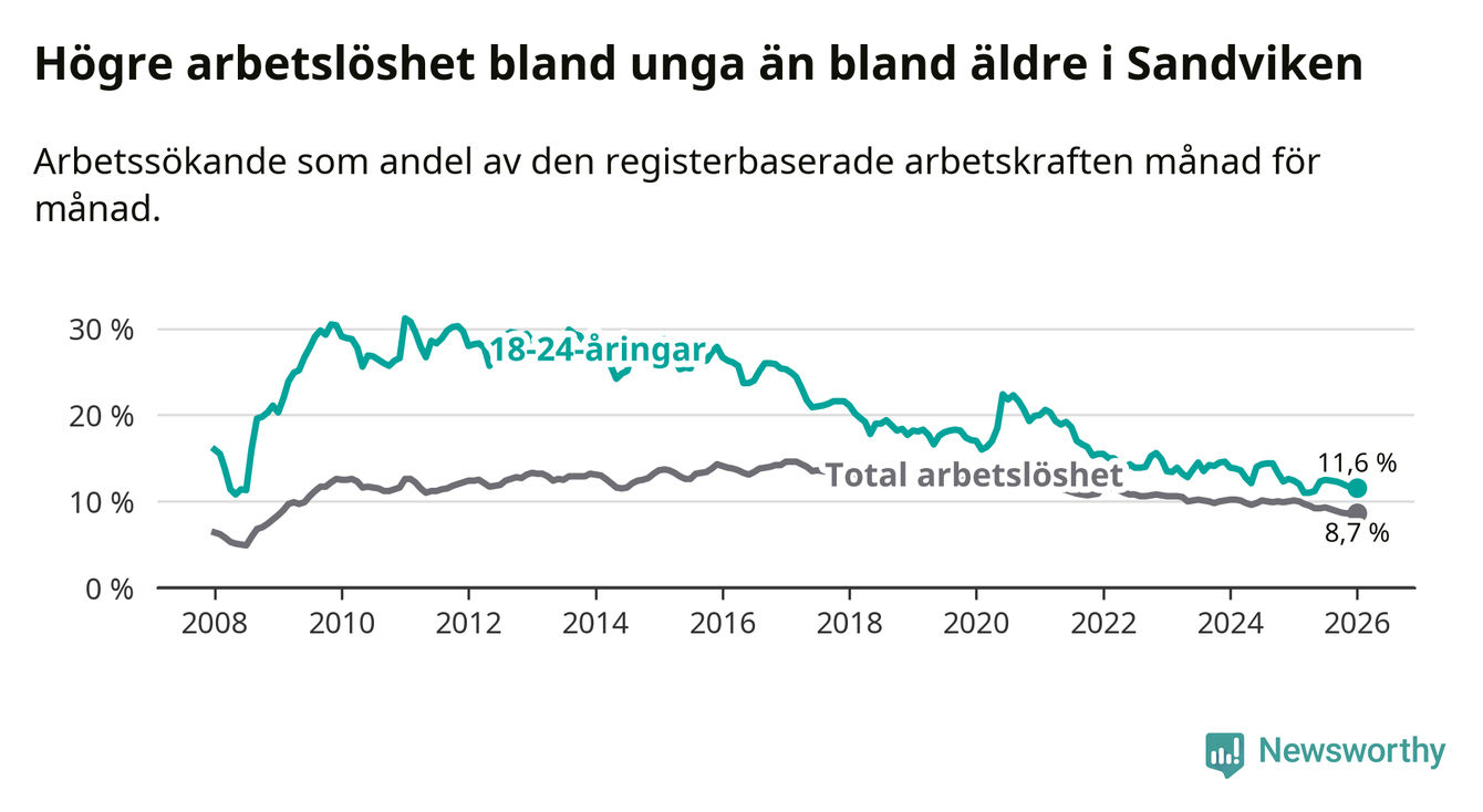 I och med den senaste månadens nedgång har de ungas arbetslöshet i Sandviken sjunkit 16 månader i följd (ner från 14,4 procent i september 2024 till 11,6 procent nu).