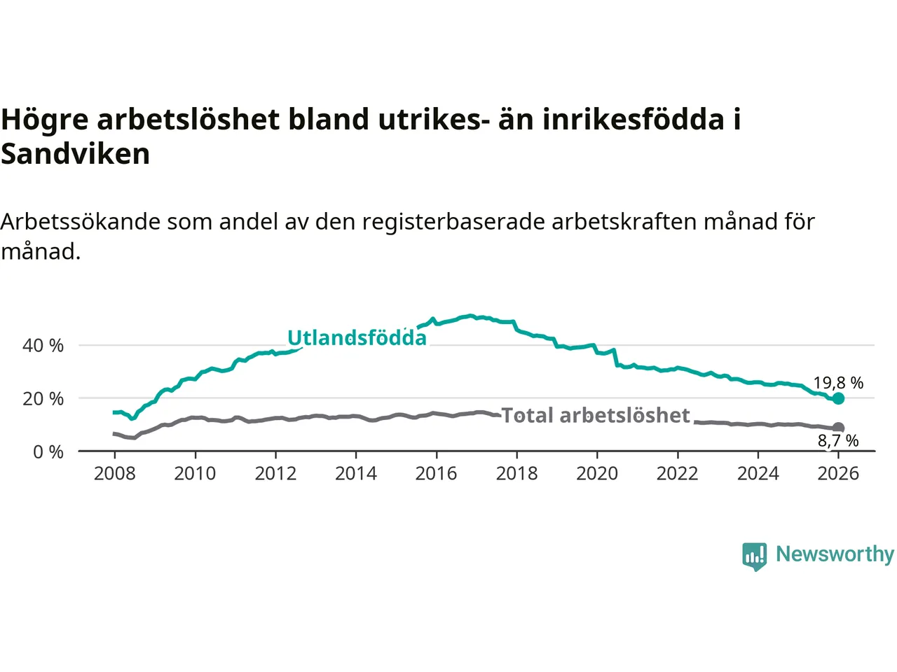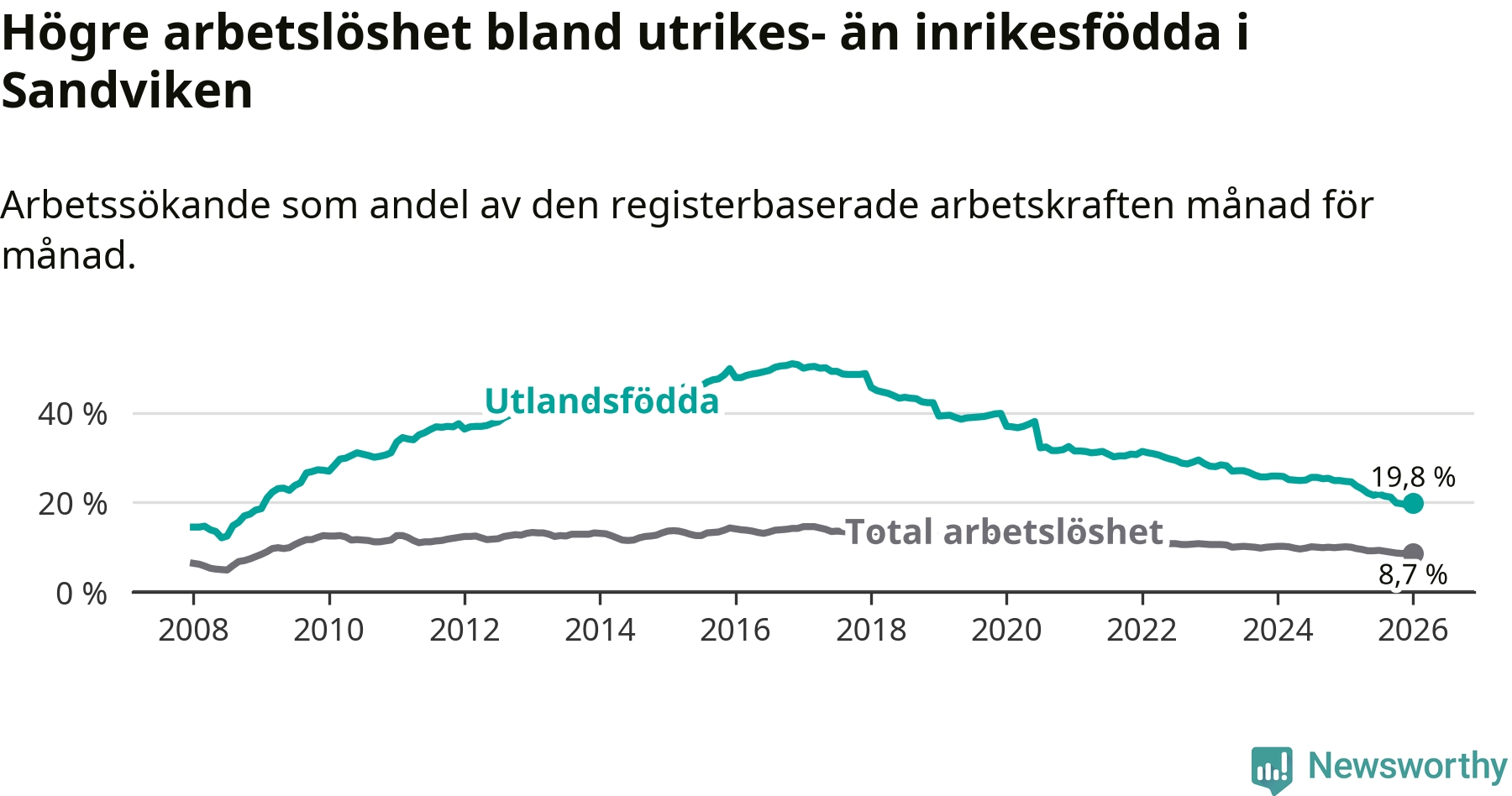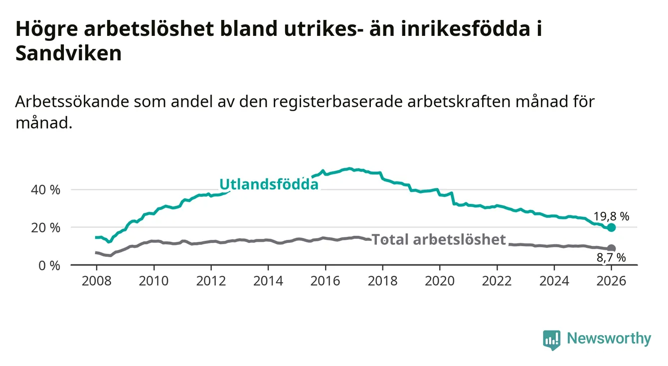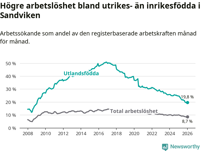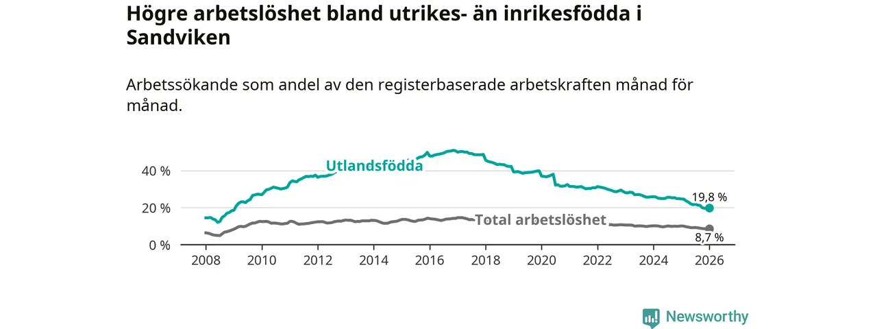 Arbetslösheten bland utlandsfödda var 19,8 procent i Sandviken under januari månad, motsvarande 812 av 4 101 personer. Det är 4,9 procentenheter färre än vid samma tidpunkt i fjol (−187 om man räknar personer). Därmed har de utlandsföddas arbetslöshet varit lägre än vid samma tidpunkt i fjol i över åtta år i sträck. Sedan juni 2017 har arbetslösheten bland utlandsfödda minskat från 49,3 till 19,8 procent.