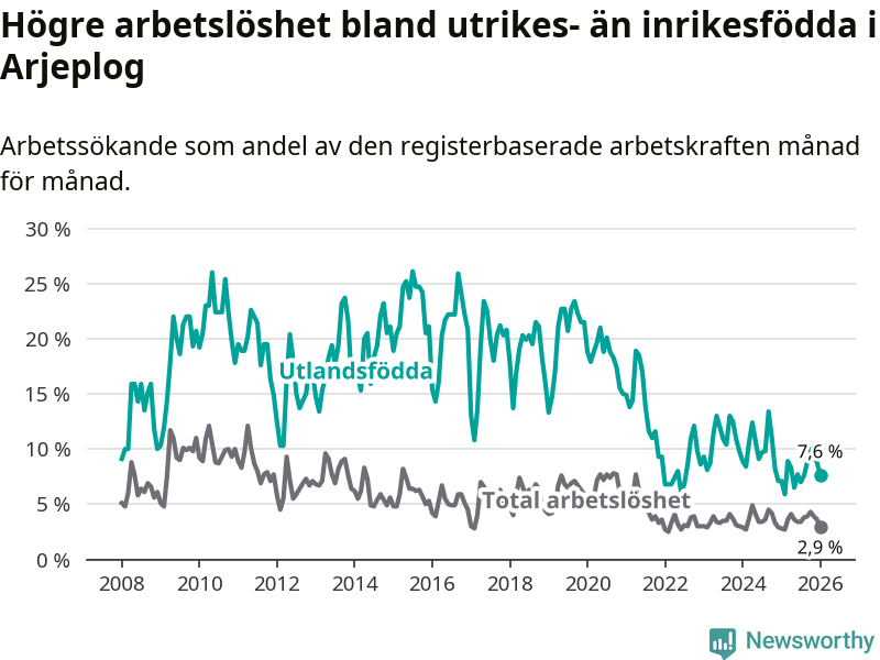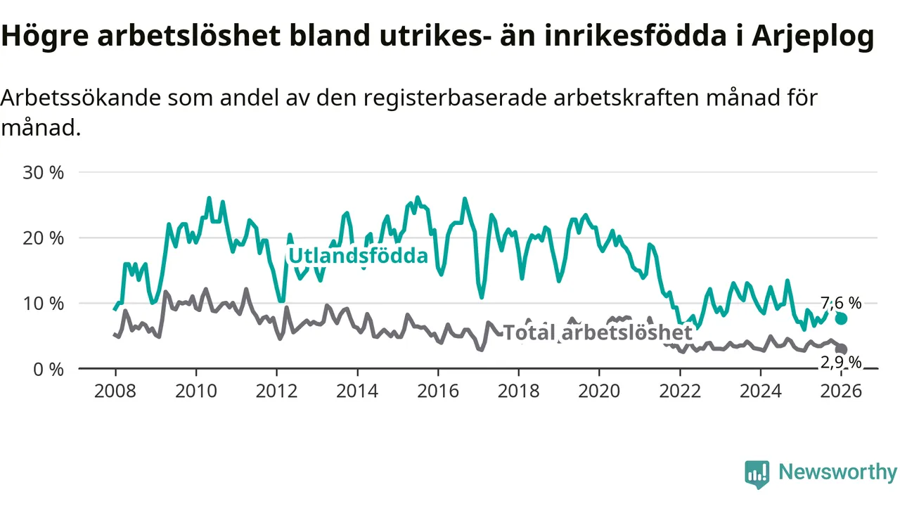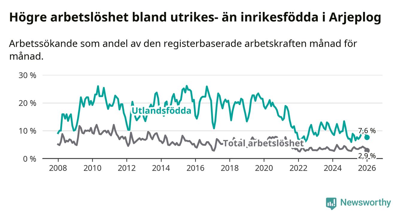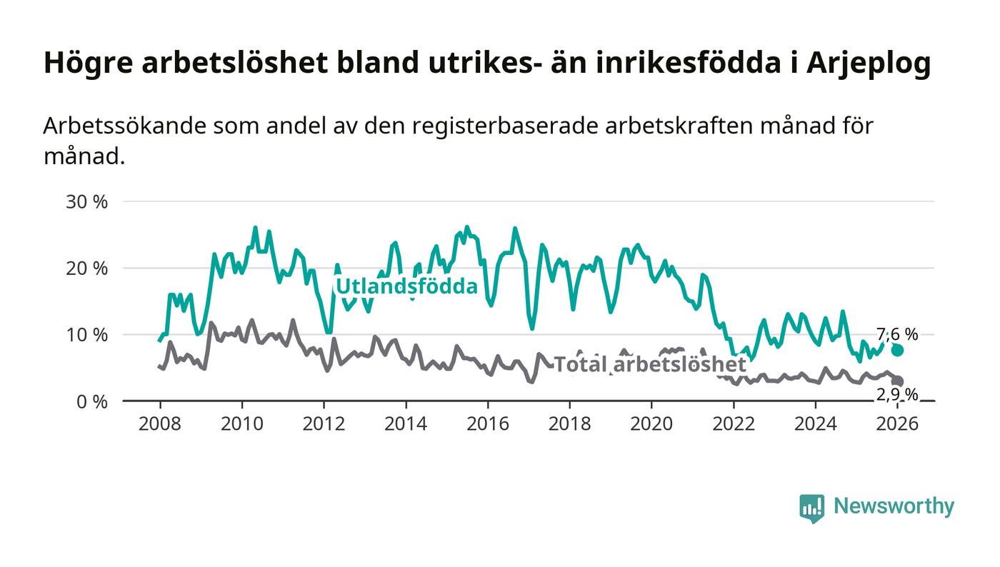 Arbetslösheten bland utlandsfödda var 7,6 procent i Arjeplog under januari månad, motsvarande 13 av 171 personer. Det är 0,5 procentenheter fler än vid samma tidpunkt i fjol (+1 om man räknar personer).