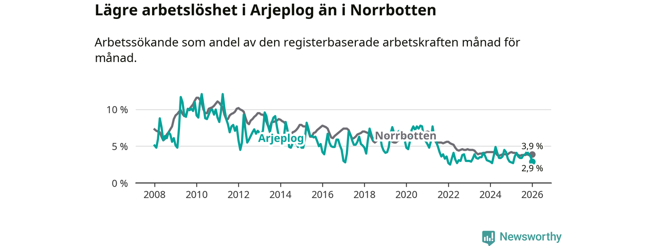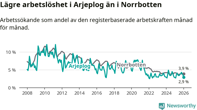 Arjeplog går därmed mot strömmen i förhållande till andra kommuner i Norrbottens län. I de flesta andra kommuner i länet går arbetslösheten nedåt. Störst är minskningen i Pajala, där arbetslösheten sjunker med 1,3 procentenheter. I tabellen längre ner ser du utvecklingen i samtliga kommuner i länet.