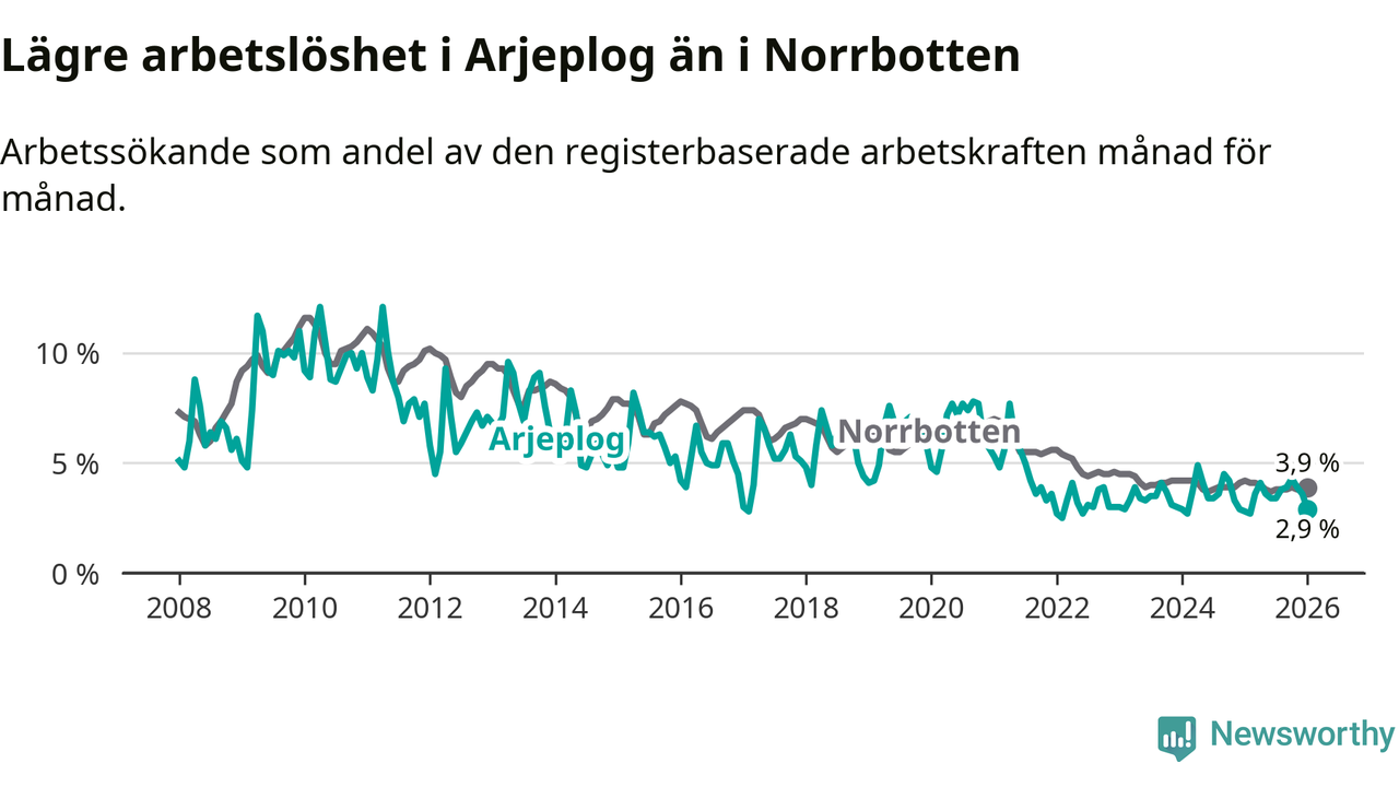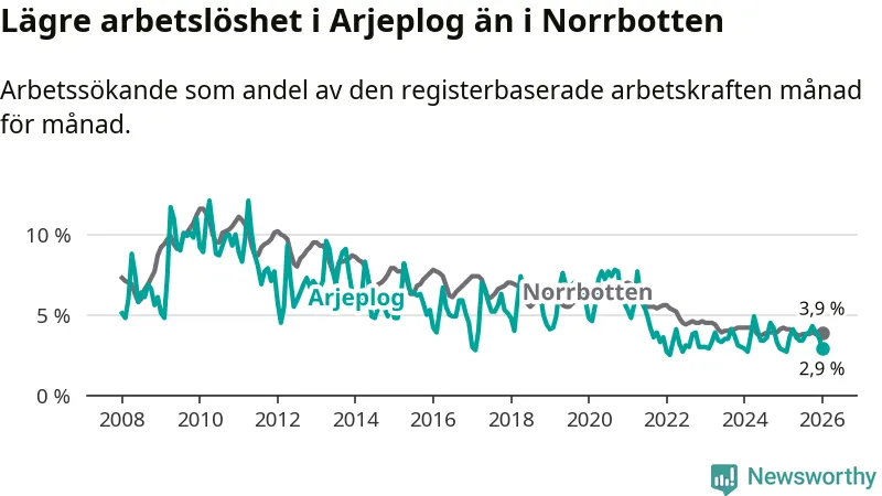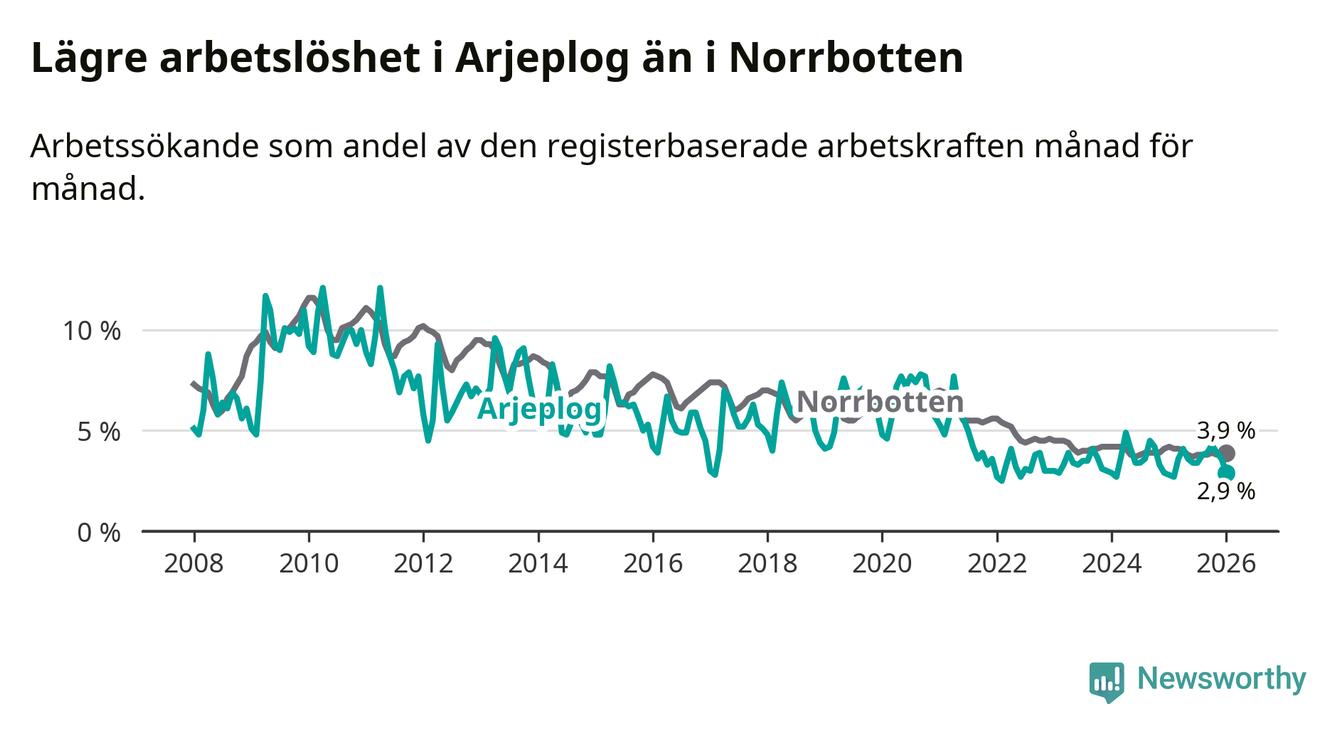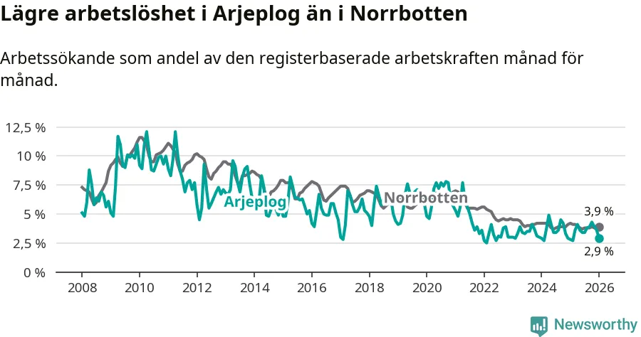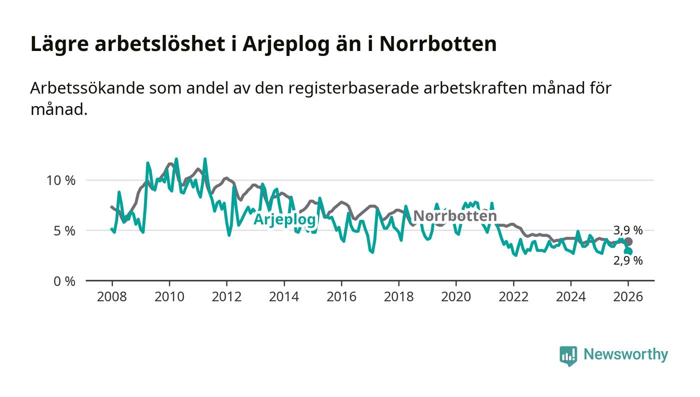 Även om arbetslösheten i Arjeplog alltså ökar, så ligger den fortfarande under snittet i hela Norrbottens län (2,9 procent i kommunen, jämfört med 3,9 procent i hela länet). Gällivare och Kiruna har den lägsta arbetslösheten i länet (2,4 procent), medan Haparanda har den högsta (7,1 procent).