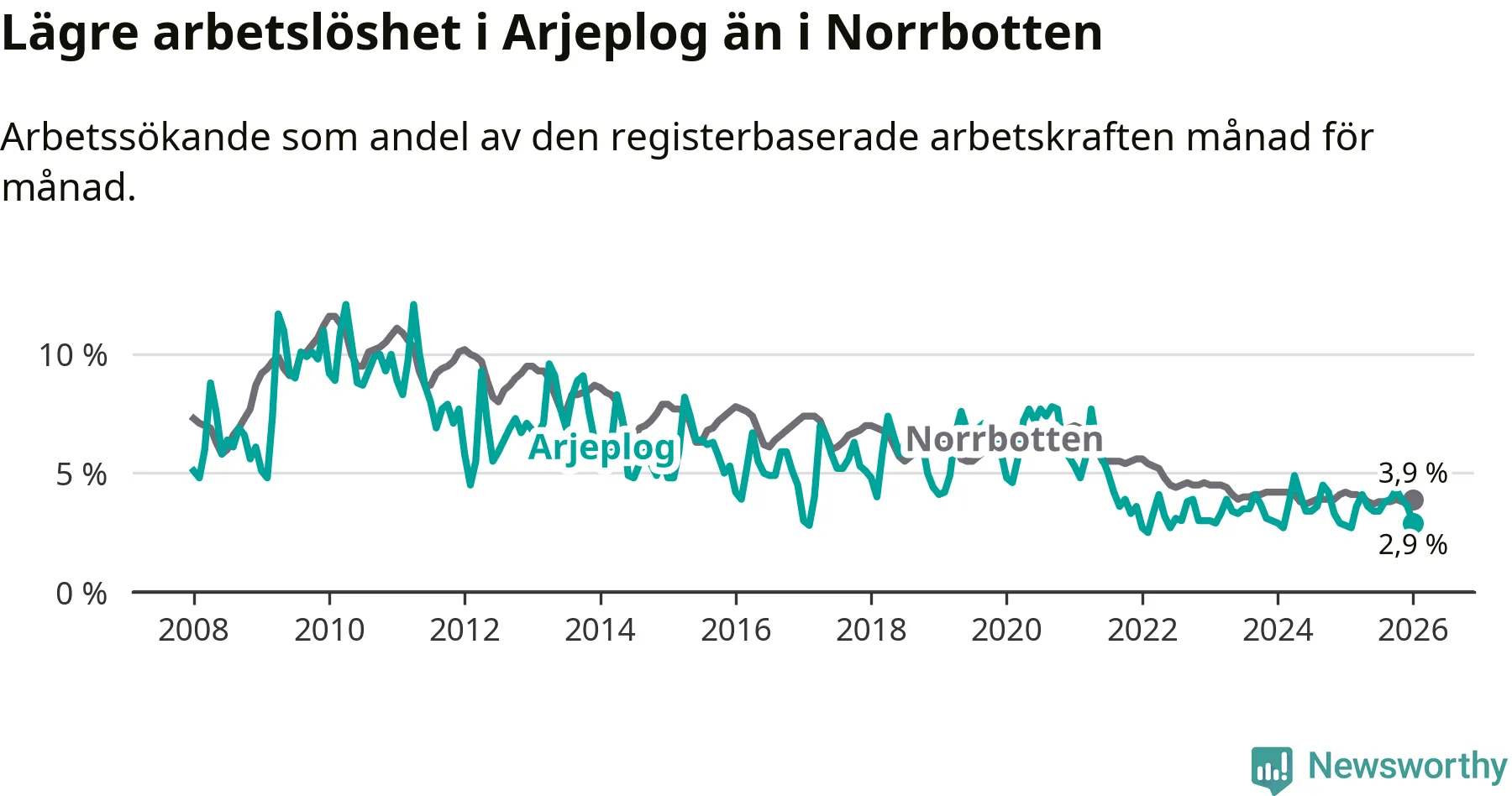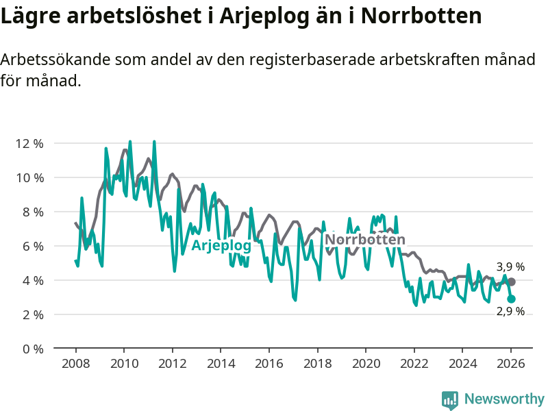 Graf: Arbetslöshet i Arjeplogs kommun och Norrbottens län
