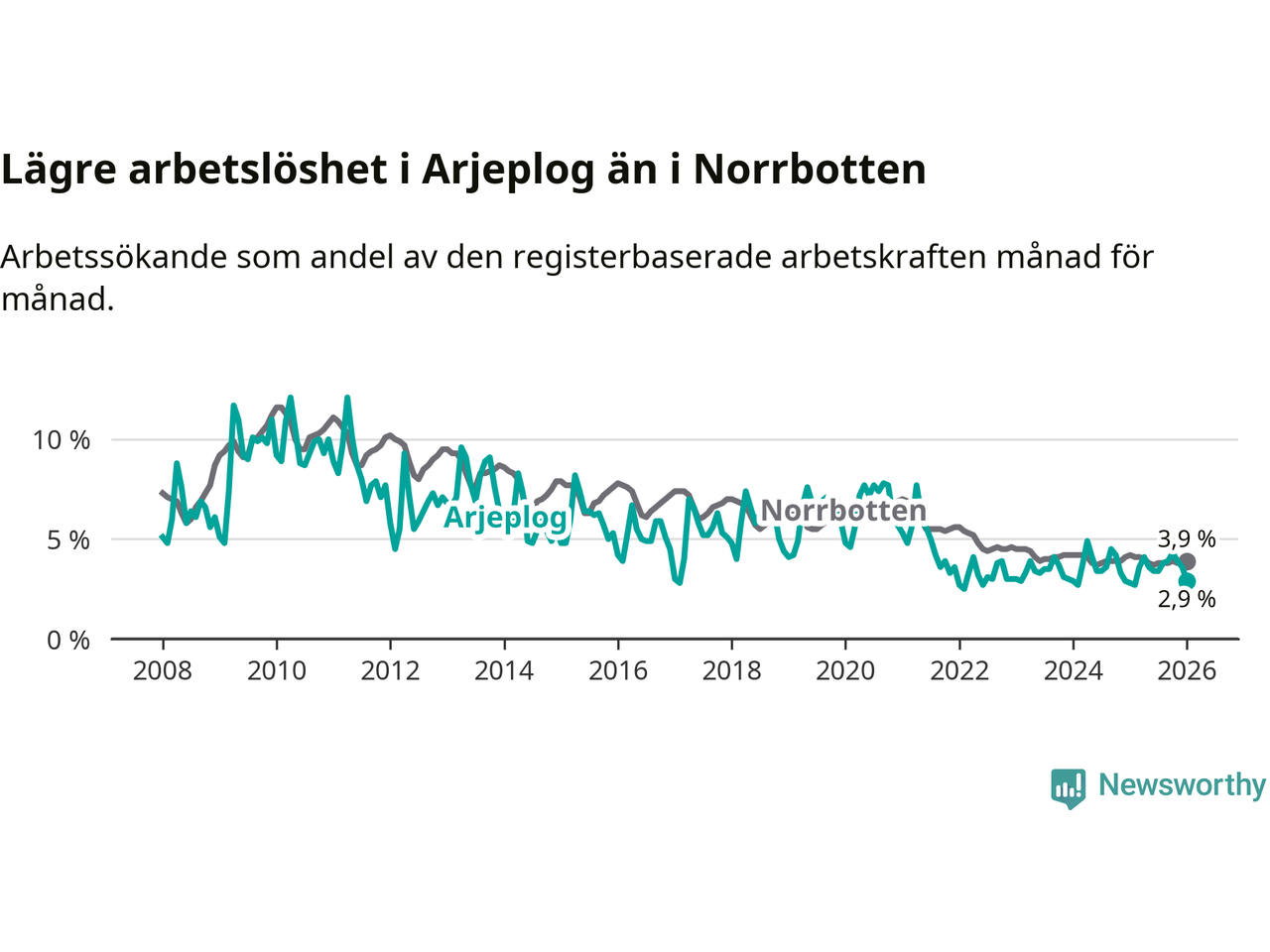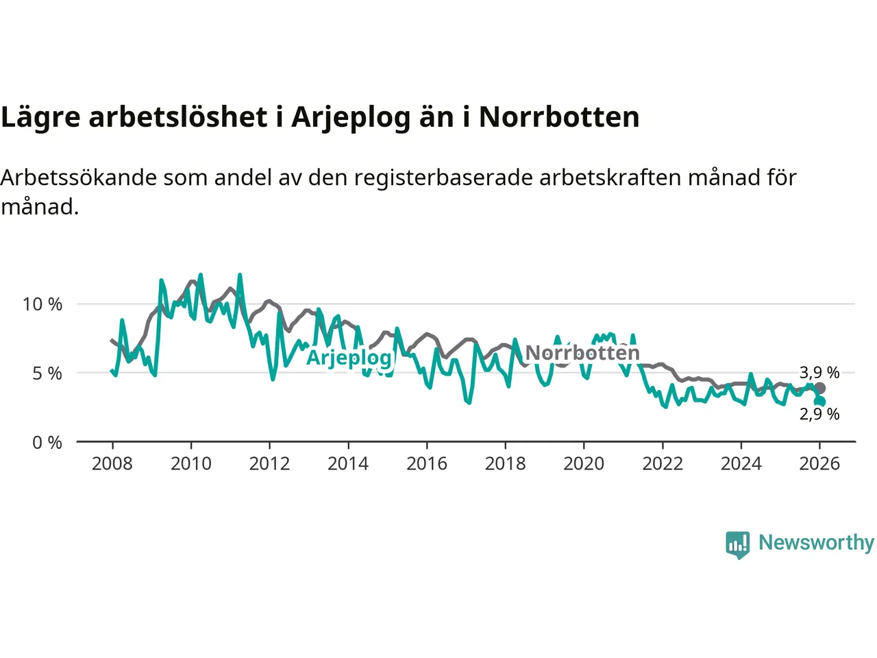 Perstorp är den kommun som har högst arbetslöshet just nu (13,4 procent) i landet som helhet, medan Gällivare, Kiruna och Sorsele har den lägsta (2,4 procent). Arjeplogs arbetslöshet sticker ut som den fjärde lägsta i hela landet.
