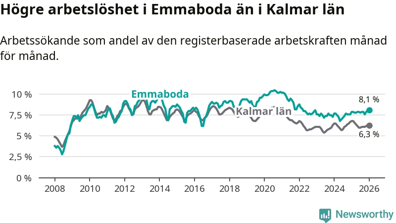 Emmaboda hade redan tidigare högre arbetslöshet än snittet i hela Kalmar län och nu växer klyftan (8,1 procent i kommunen, jämfört med 6,3 procent i hela länet). Mörbylånga har den lägsta arbetslösheten i länet (3,8 procent), medan Högsby har den högsta (8,3 procent). För att Emmaboda skulle komma ner i samma arbetslöshetsnivå som Mörbylånga skulle 171 personer behöva sysselsättas.