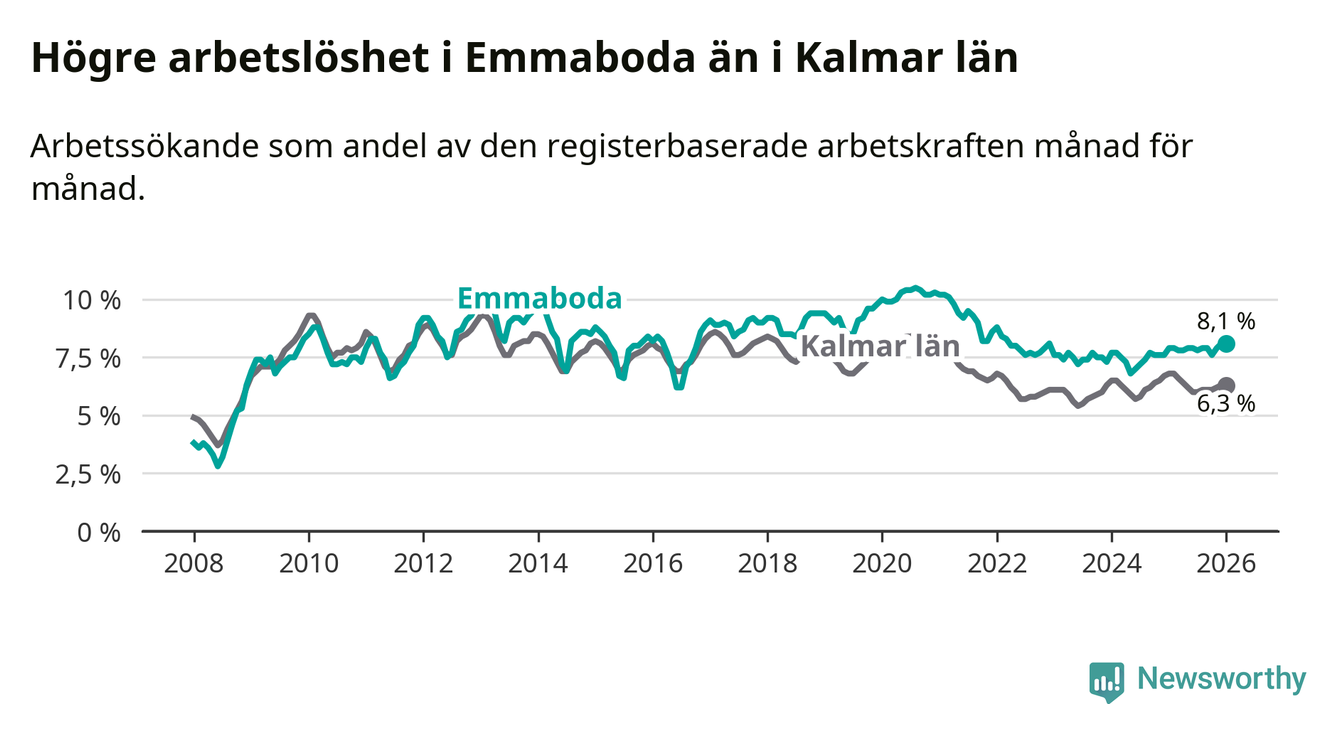 Under januari månad rapporterade Emmaboda kommun en total arbetslöshet på 8,1 procent. Det är en ökning jämfört med samma tidpunkt i fjol (+0,2 procentenheter). I Kalmar län däremot sjunker arbetslösheten .