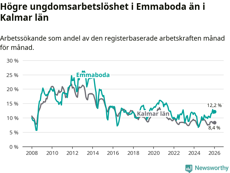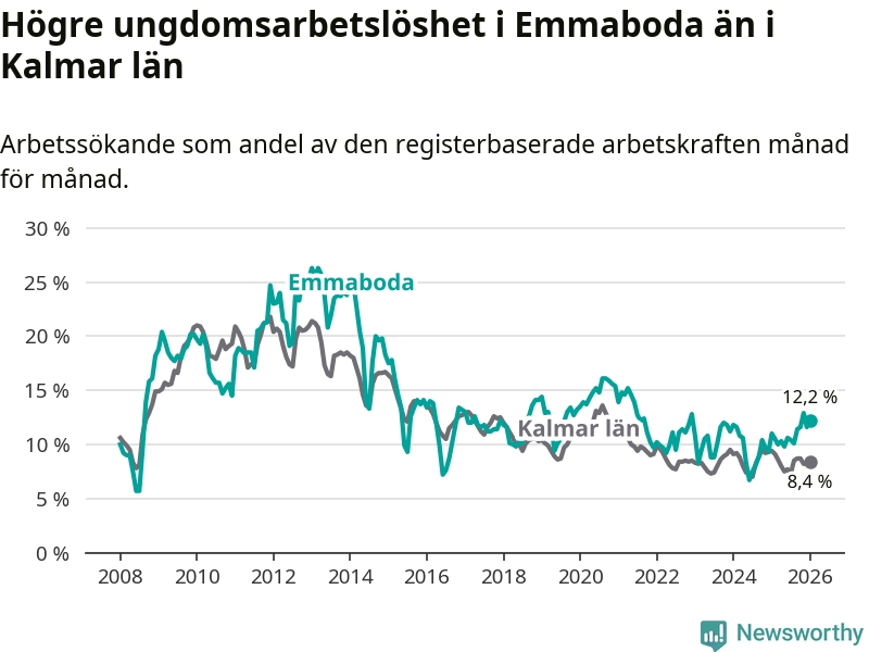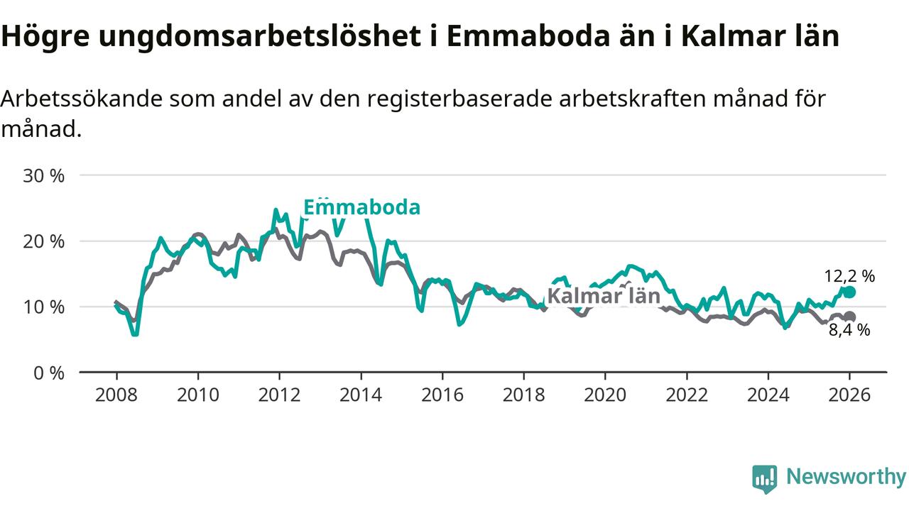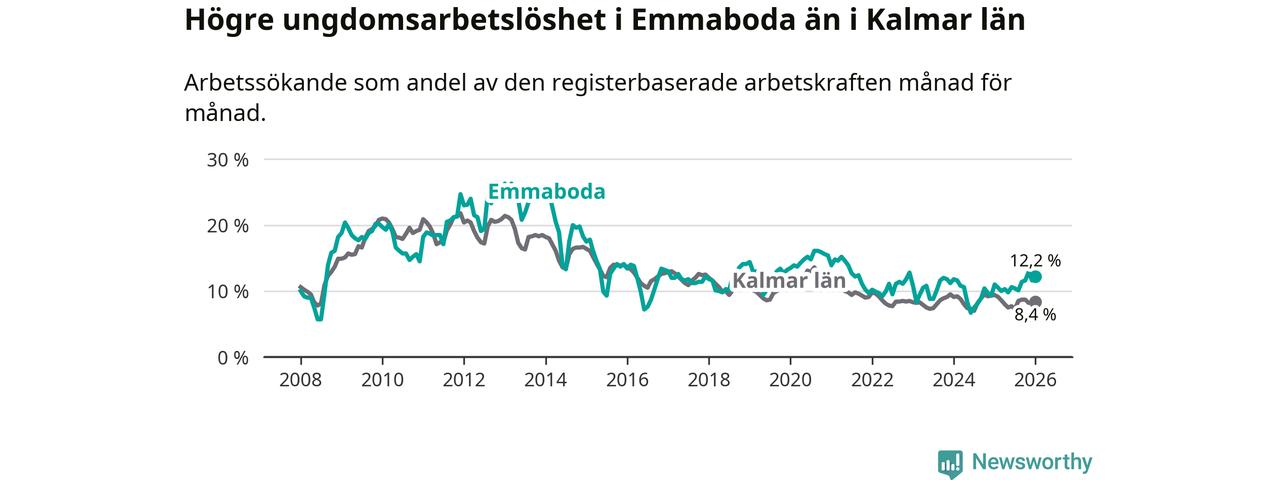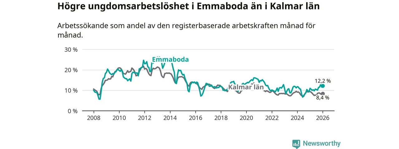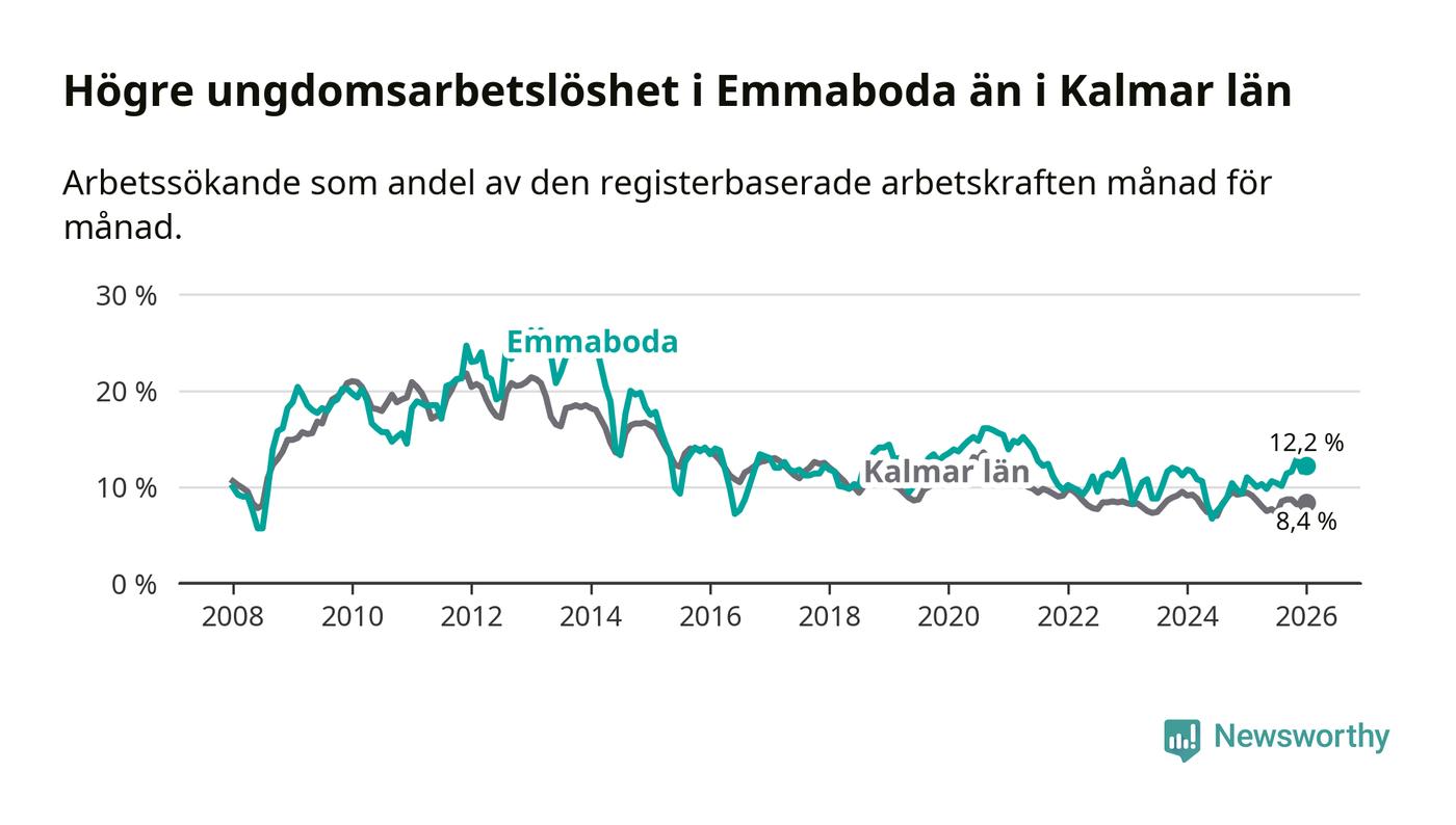Precis som den totala arbetslösheten ligger ungdomsarbetslösheten i Emmaboda högre än i Kalmar län som helhet. Skillnaden mellan kommunen och länet är 3,8 procentenheter.