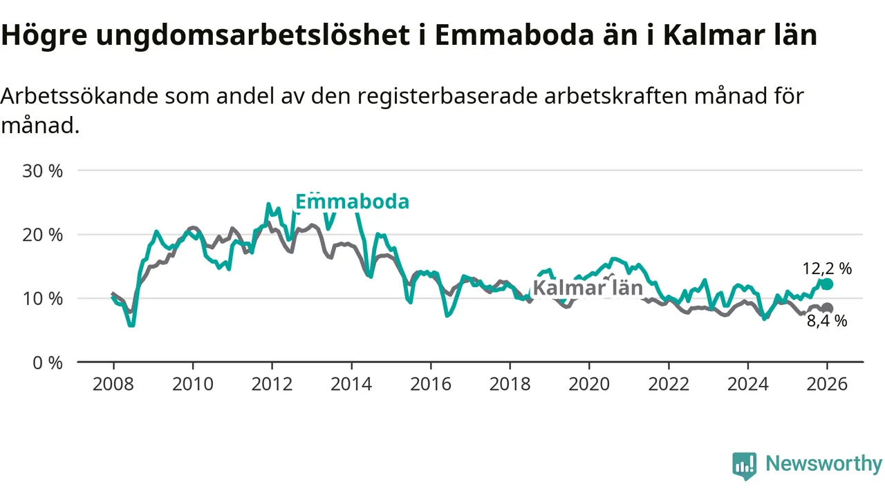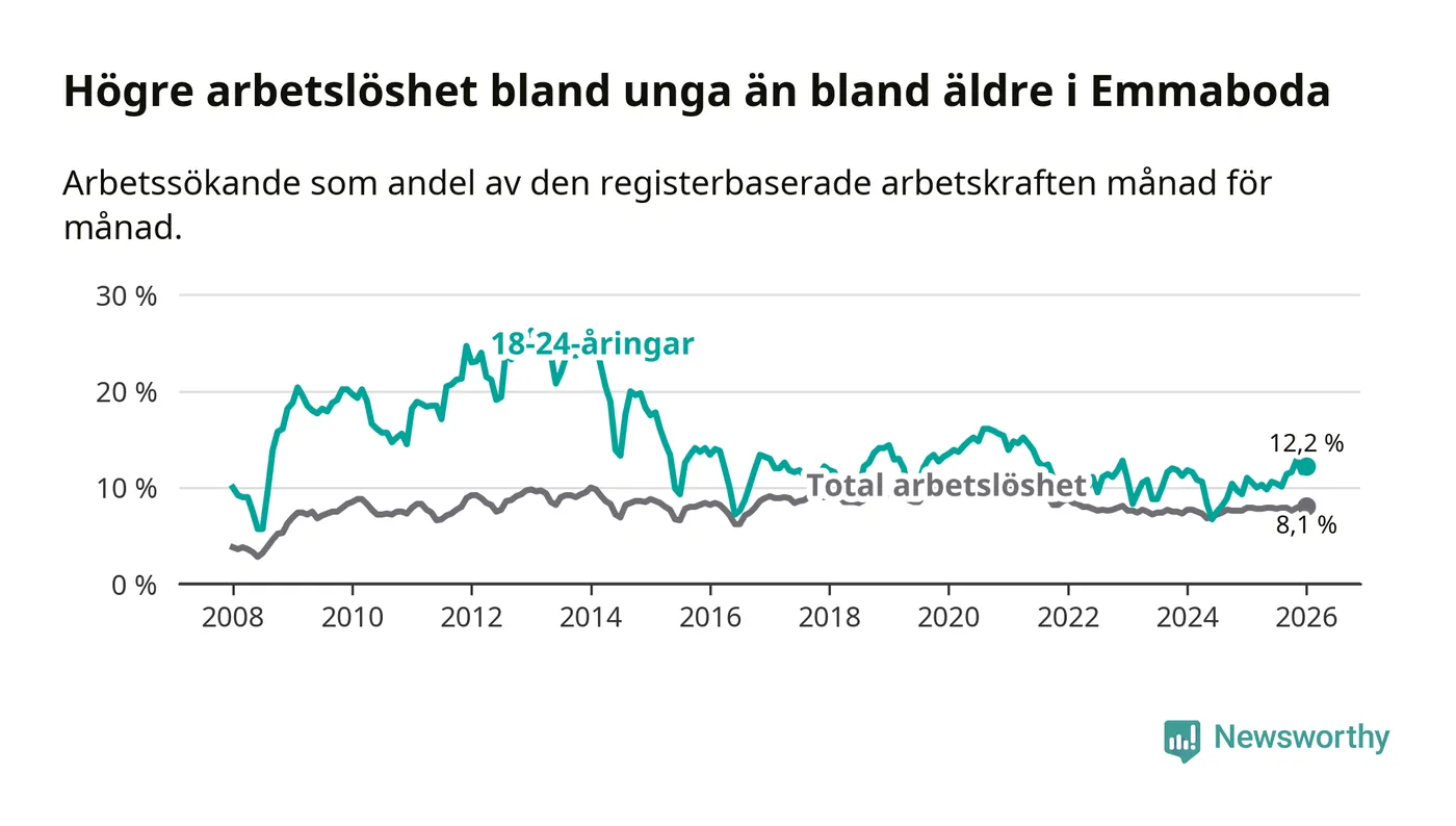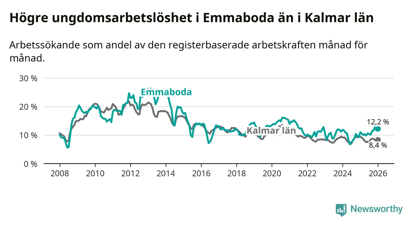 I och med den senaste månadens uppgång har de ungas arbetslöshet i Emmaboda stigit nio månader i följd (upp från 10,3 procent i april 2025 till 12,2 procent nu).