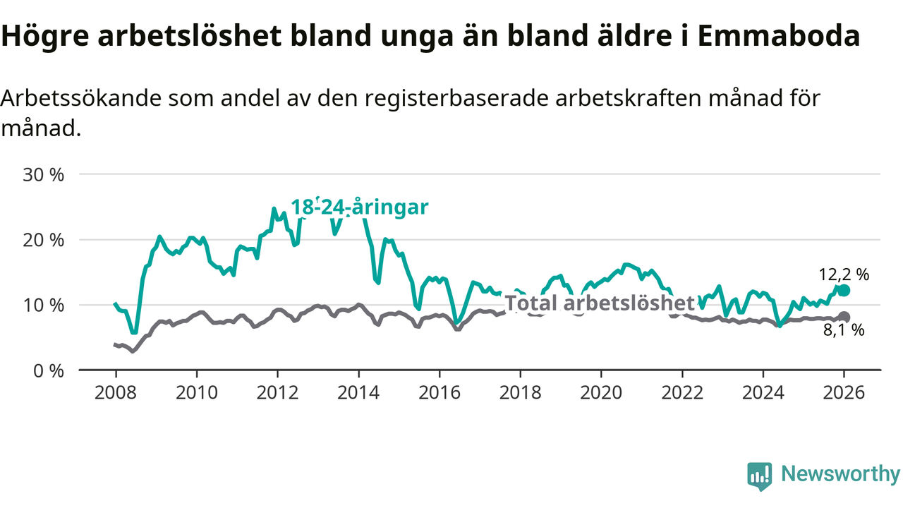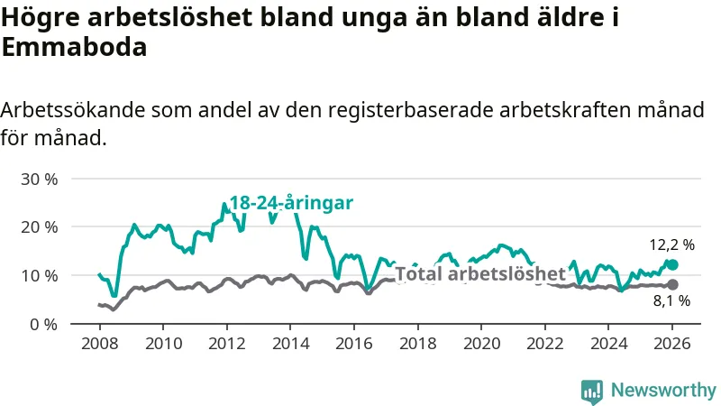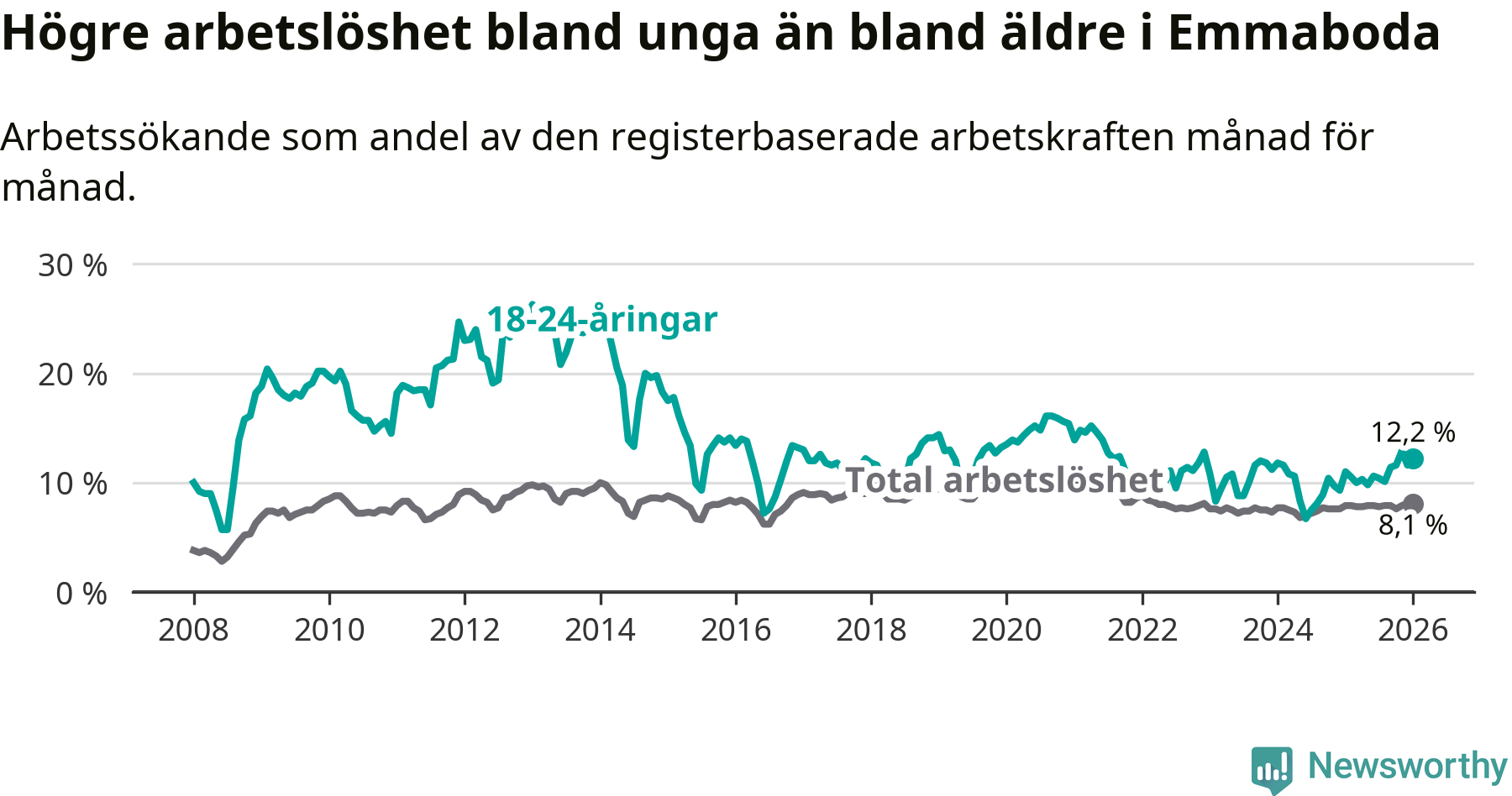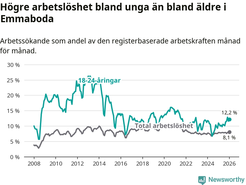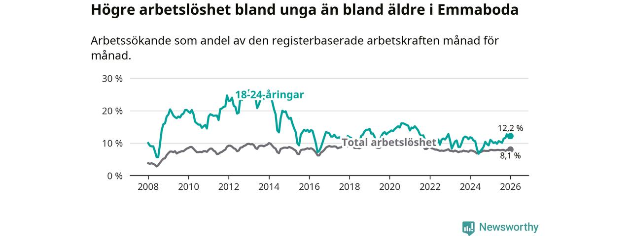 I och med den senaste månadens uppgång har de ungas arbetslöshet i Emmaboda stigit nio månader i följd (upp från 10,3 procent i april 2025 till 12,2 procent nu).