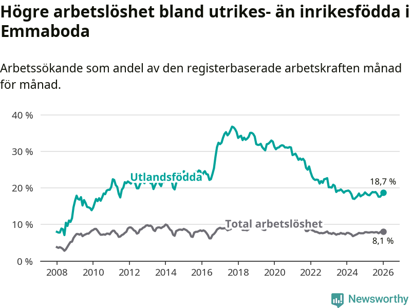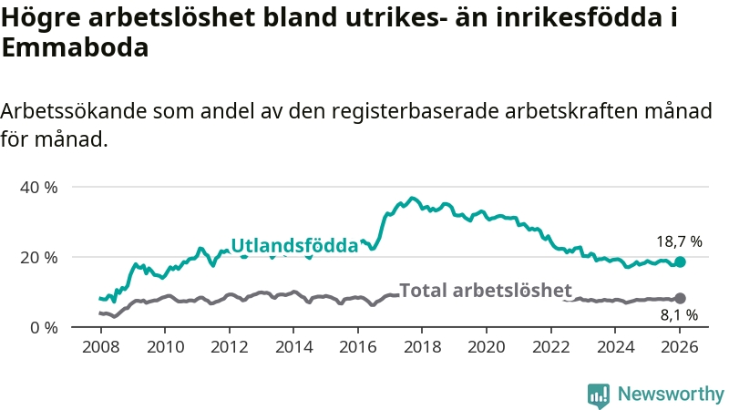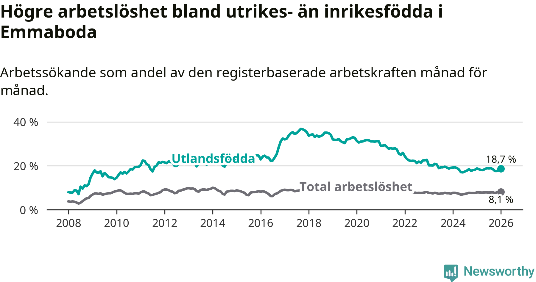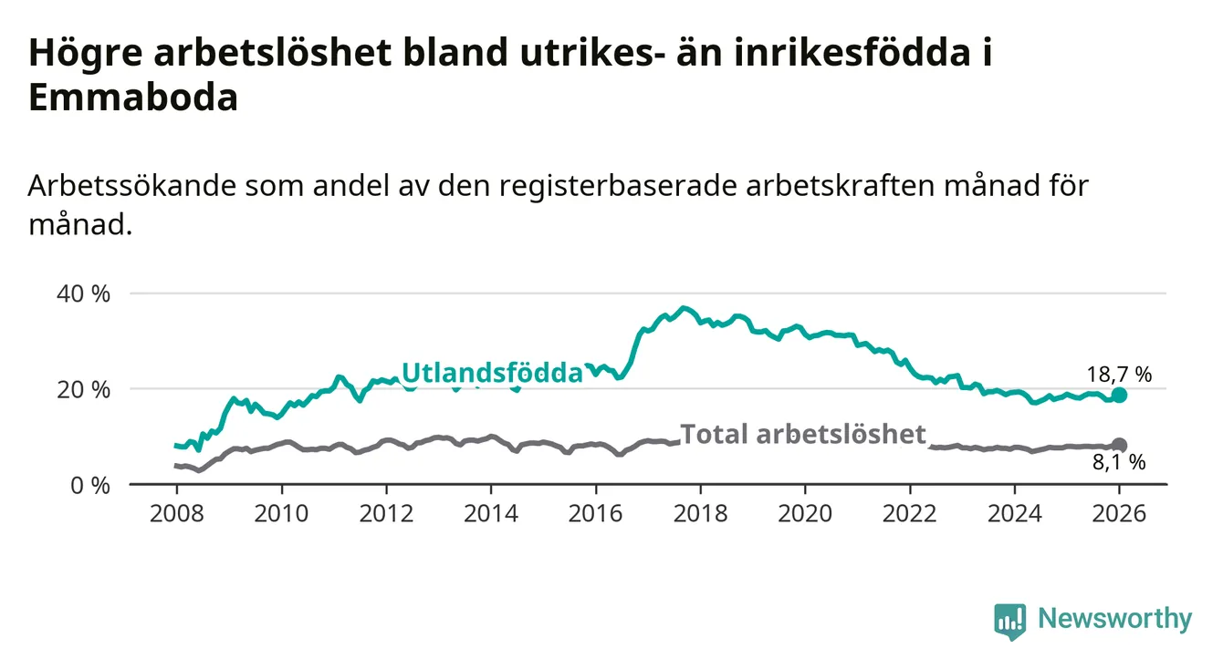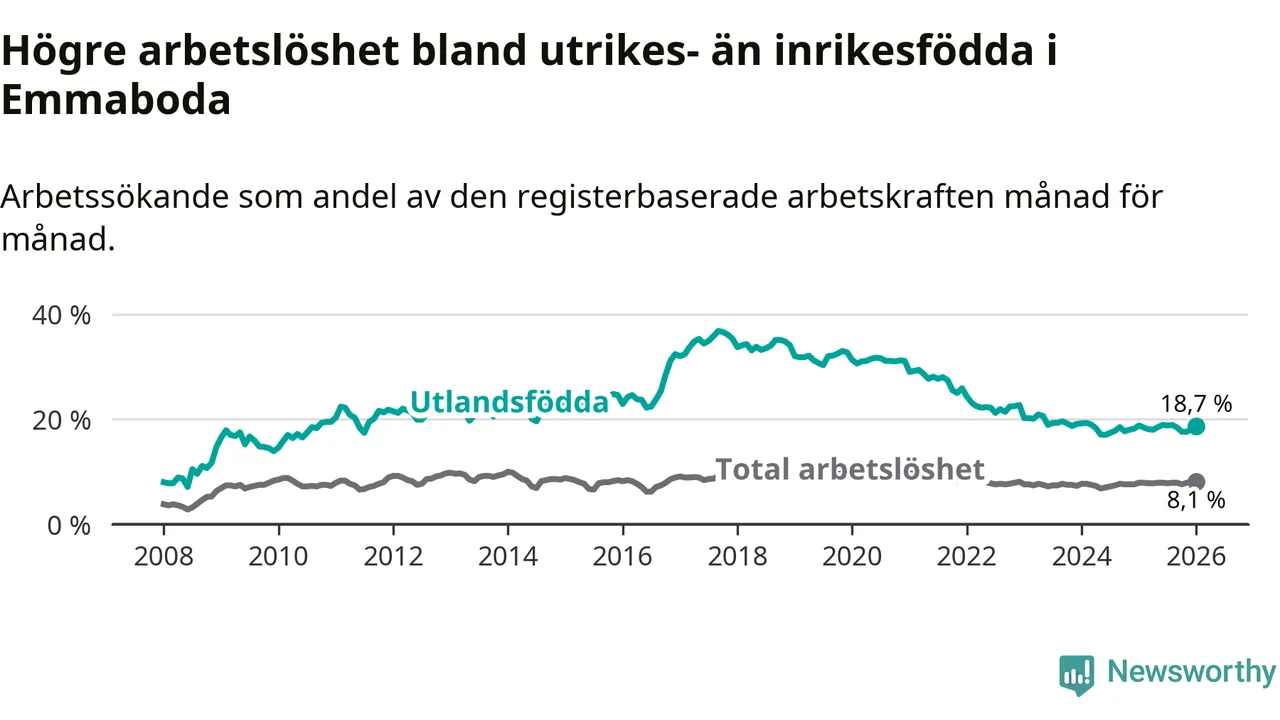 Arbetslösheten bland utlandsfödda var 18,7 procent i Emmaboda under januari månad, motsvarande 174 av 930 personer. Det är 0,1 procentenheter färre än vid samma tidpunkt i fjol (−1 om man räknar personer).