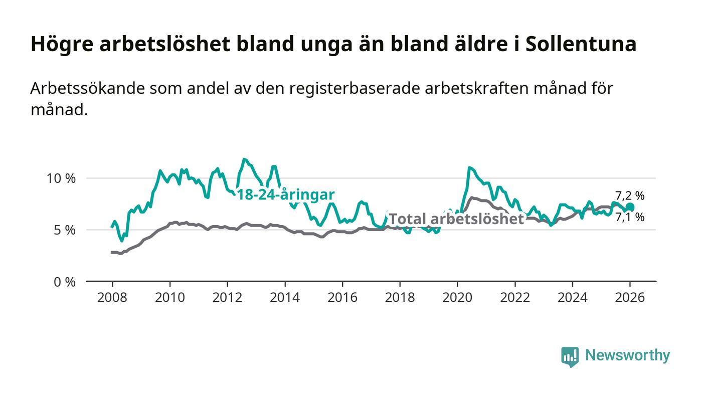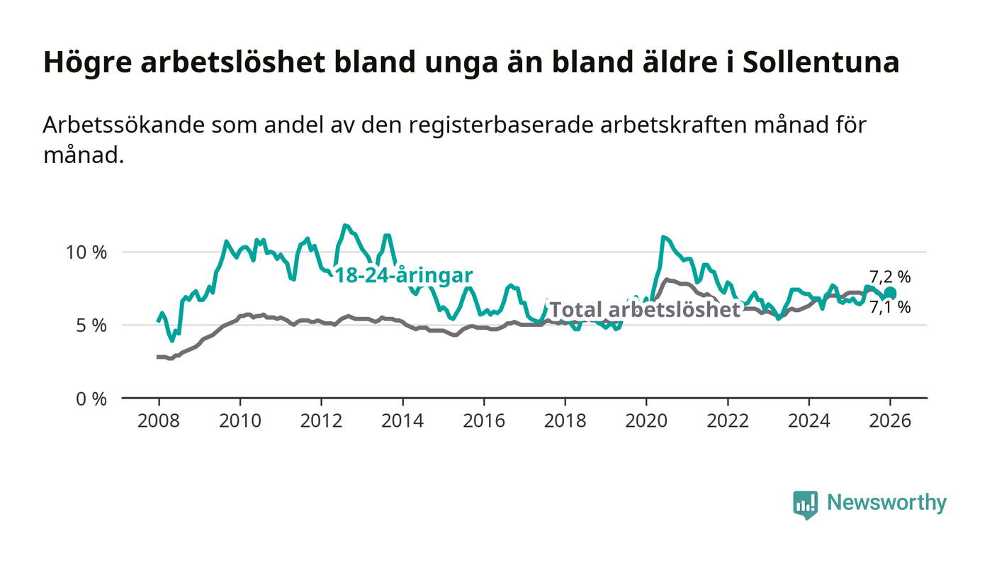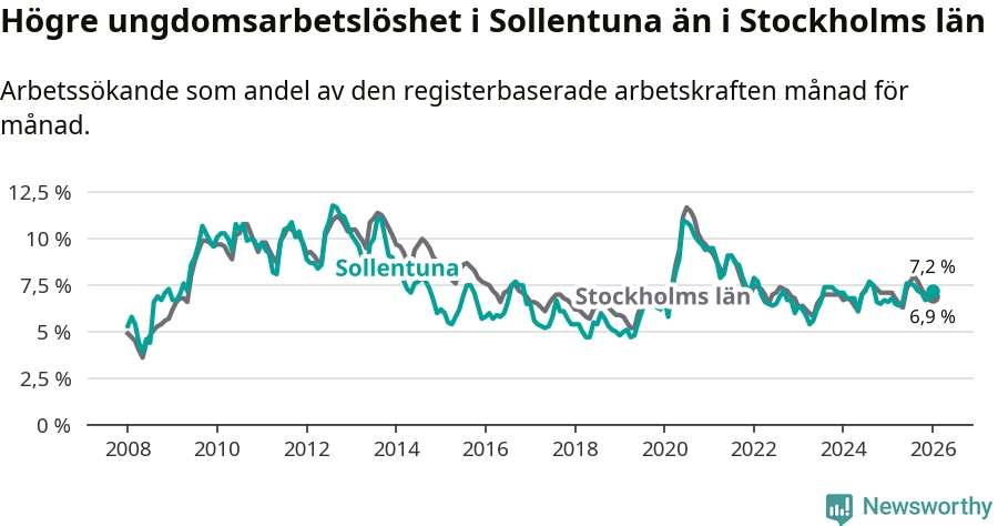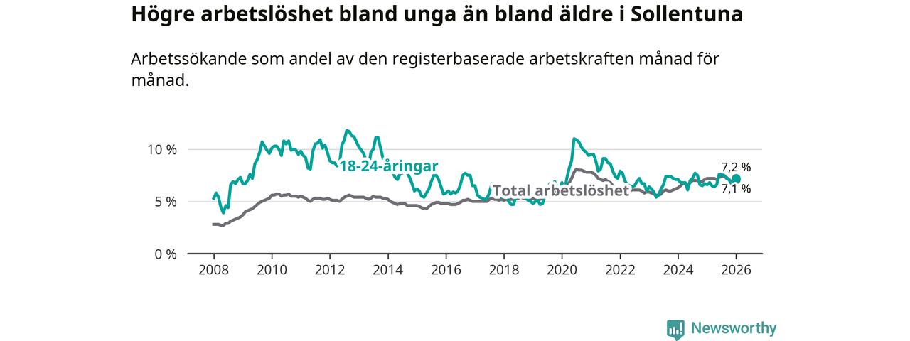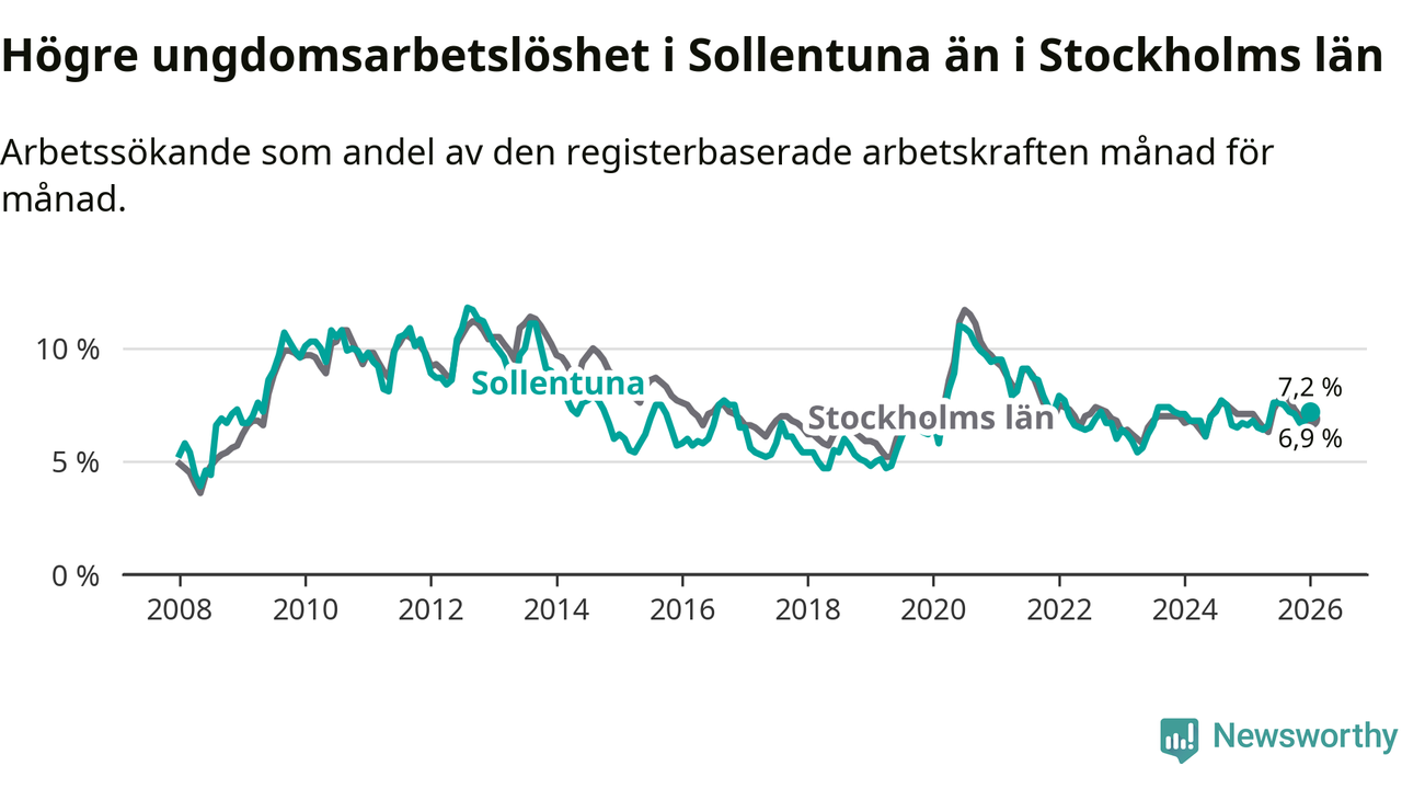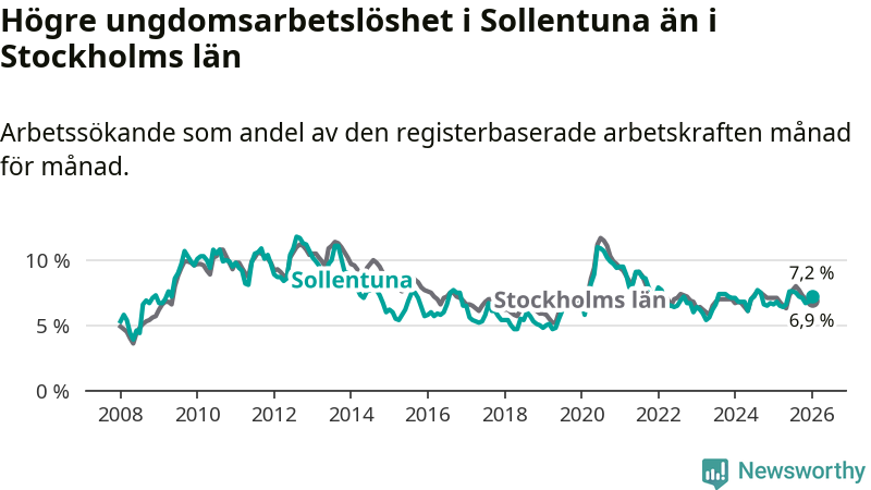 Medan Sollentuna har ungefär samma total arbetslöshet som Stockholms län, ligger ungdomsarbetslösheten 0,3 procentenheter högre i Sollentuna.
