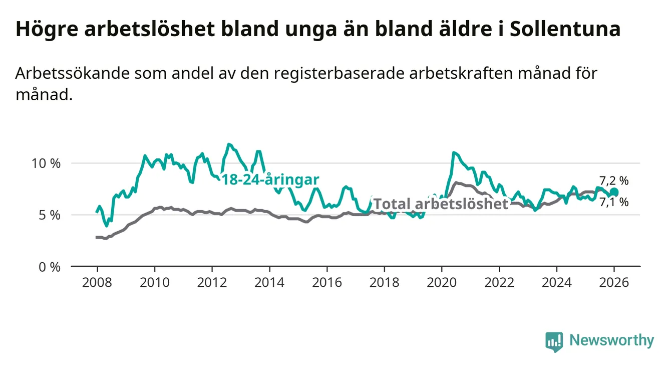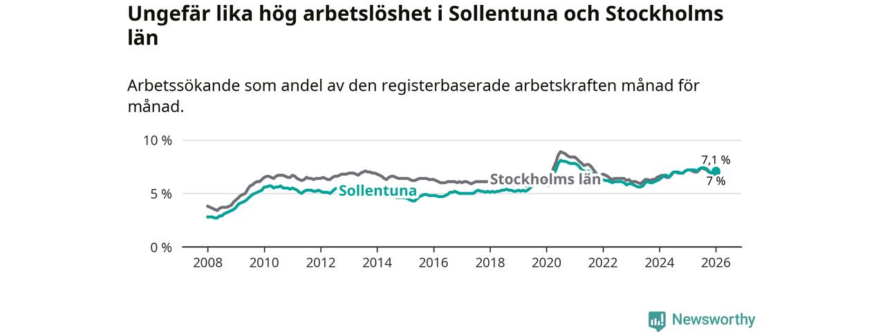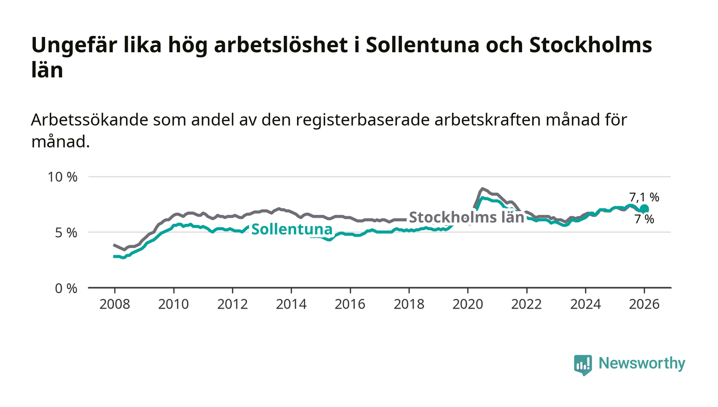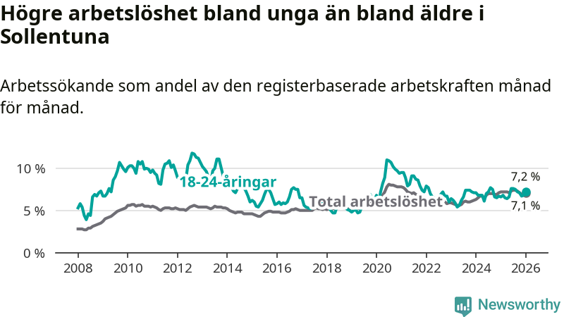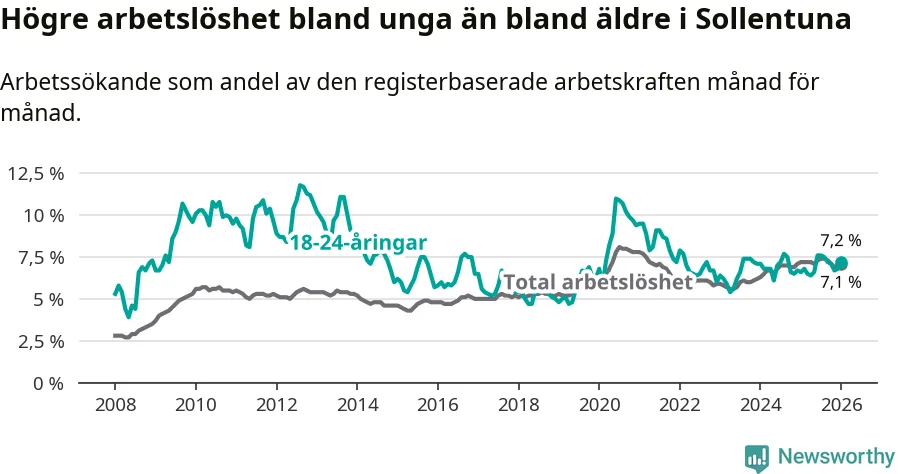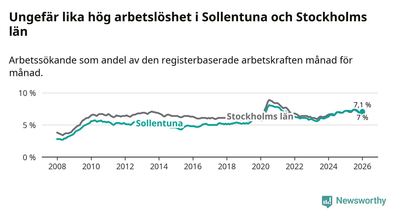 Medan Sollentuna har ungefär samma total arbetslöshet som Stockholms län, ligger ungdomsarbetslösheten 0,3 procentenheter högre i Sollentuna.