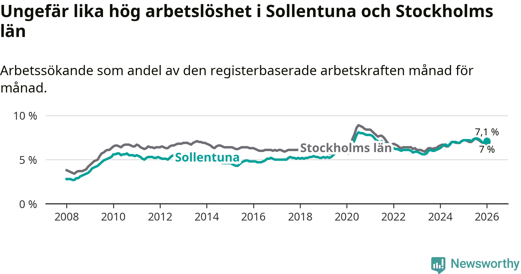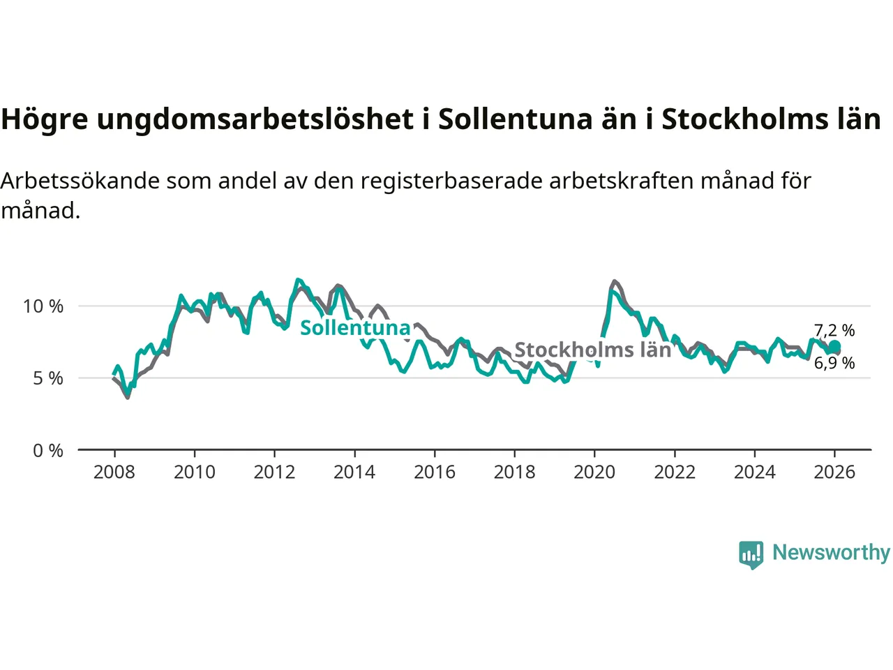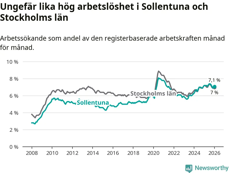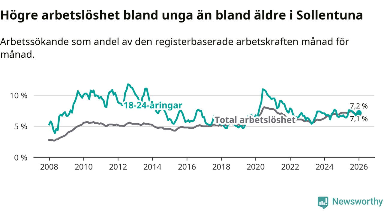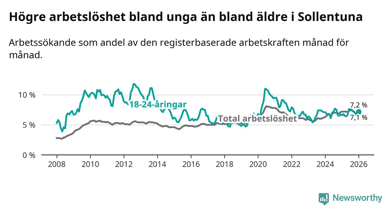 Medan Sollentuna har ungefär samma total arbetslöshet som Stockholms län, ligger ungdomsarbetslösheten 0,3 procentenheter högre i Sollentuna.