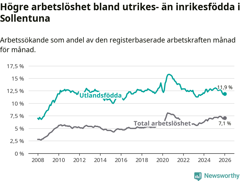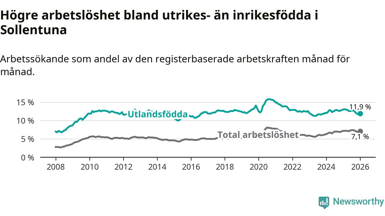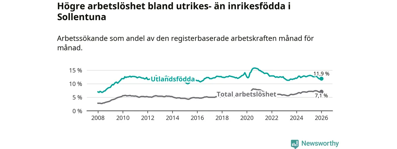 Skillnaden i arbetslöshet mellan utrikesfödda och hela befolkningen är 4,8 procentenheter i Sollentuna. Det är en mindre skillnad än för ett år sedan (−1,0 procentenheter).