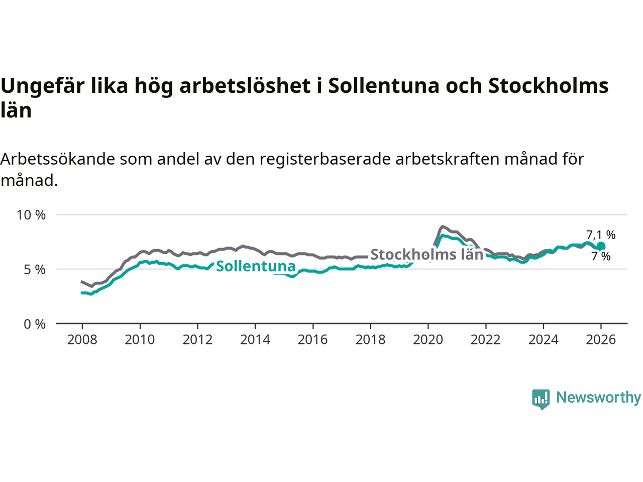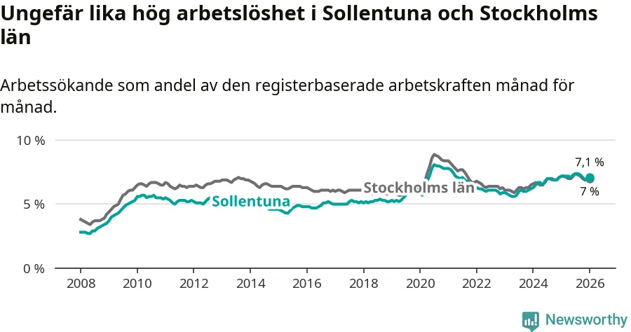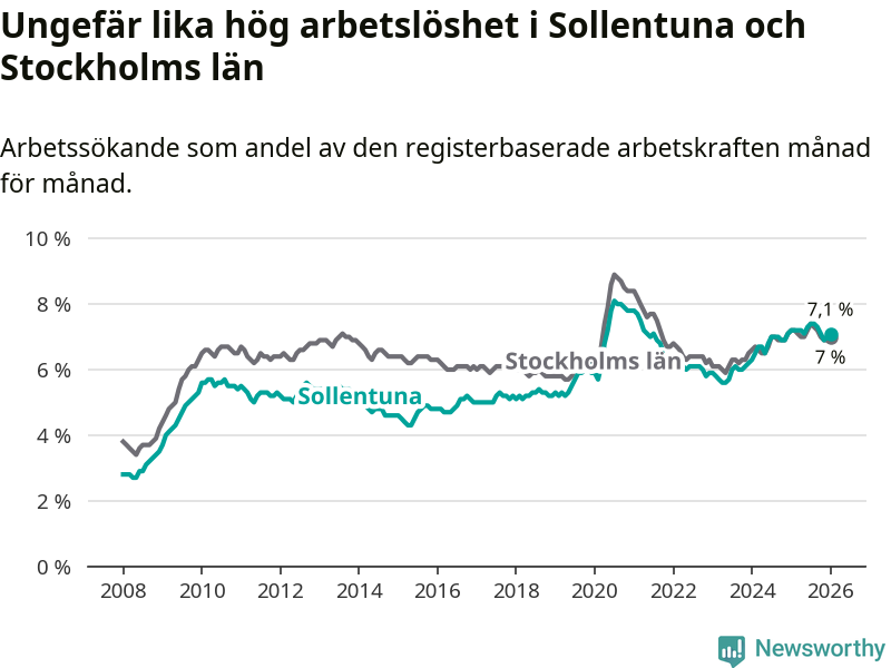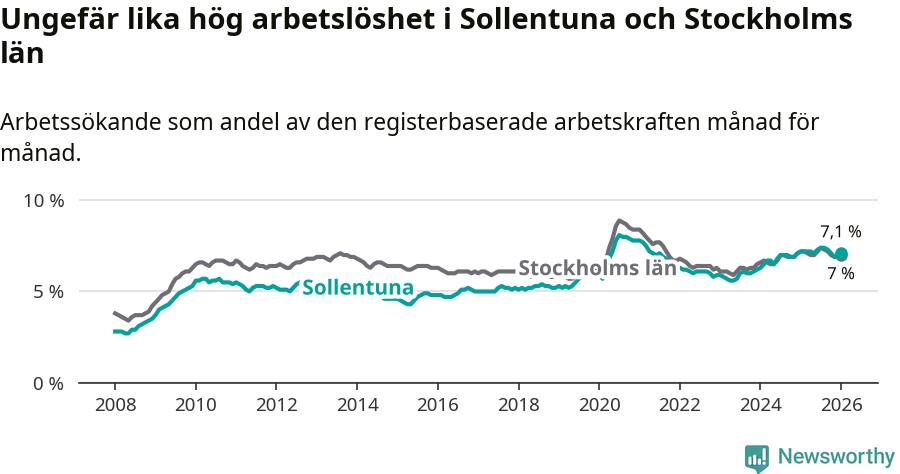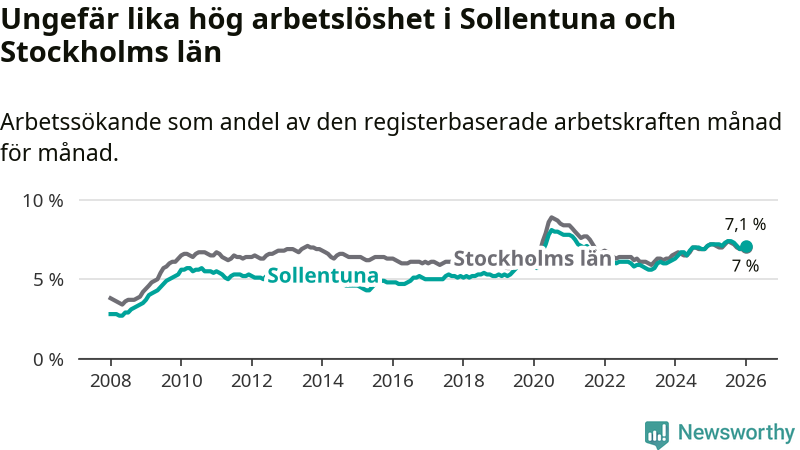 Under januari månad rapporterade Sollentuna kommun en total arbetslöshet på 7,1 procent. Det är en minskning jämfört med samma tidpunkt i fjol (−0,1 procentenheter). Även i Stockholms län sjunker arbetslösheten något.