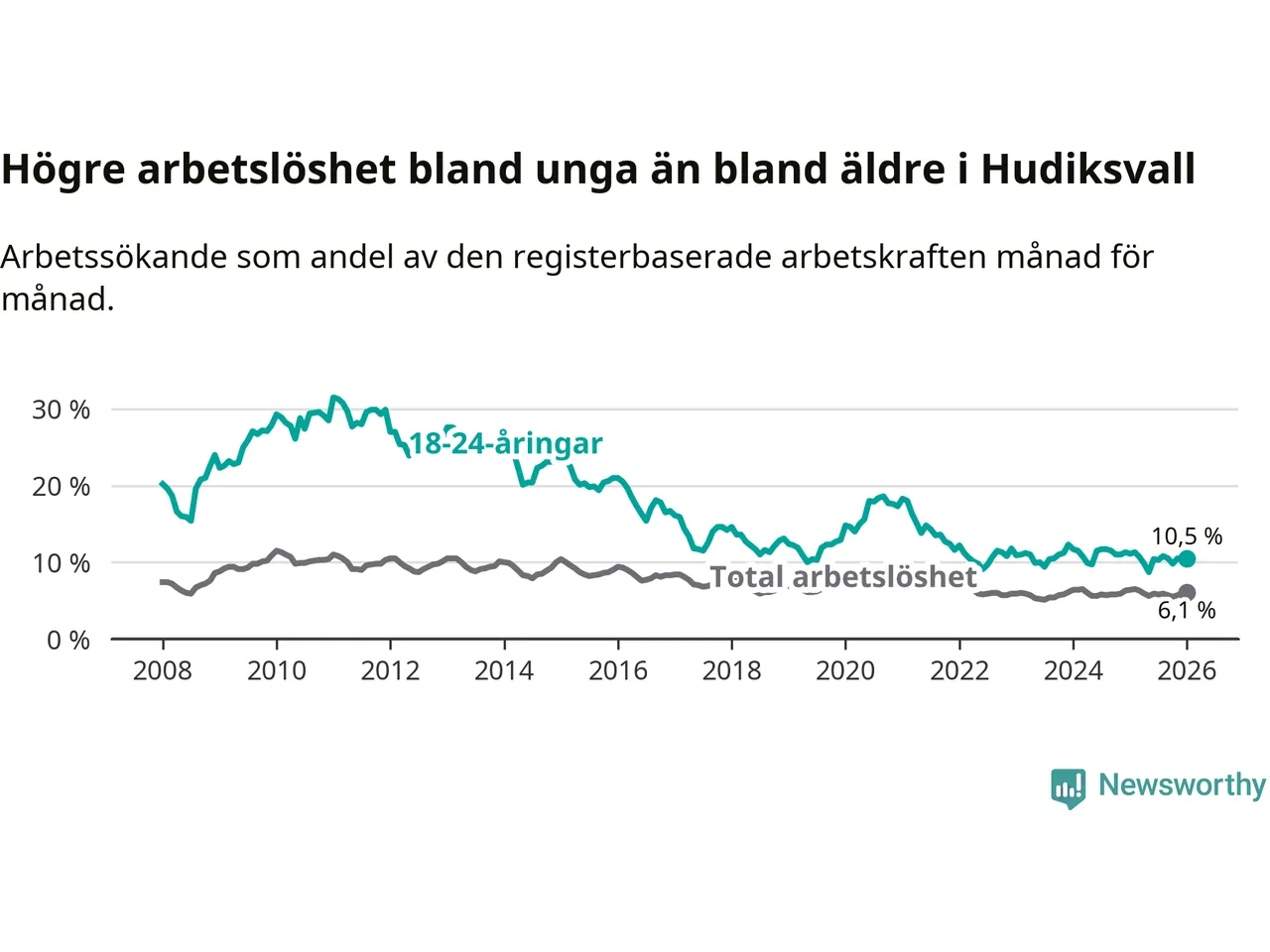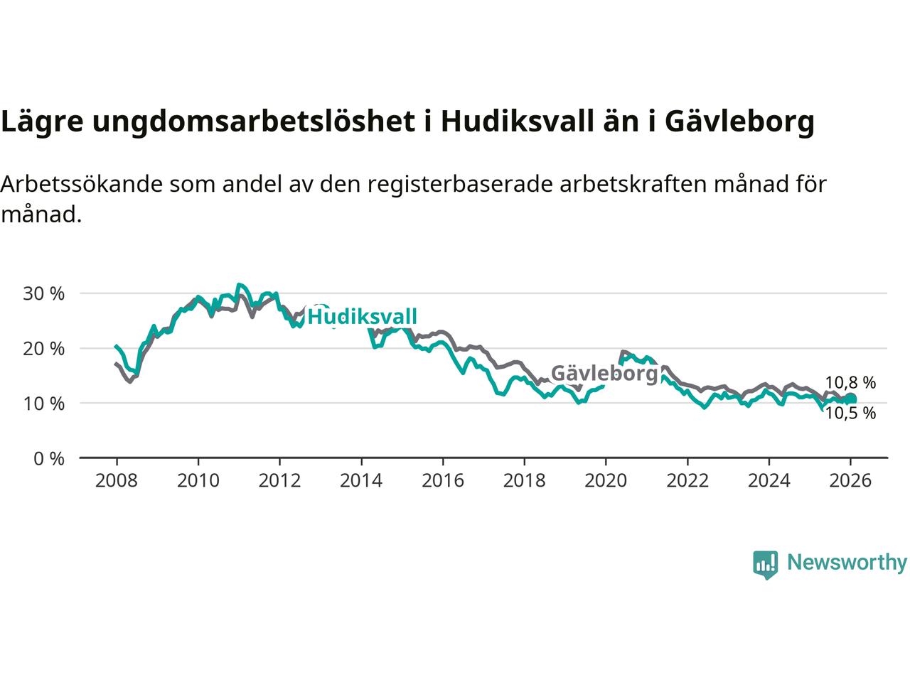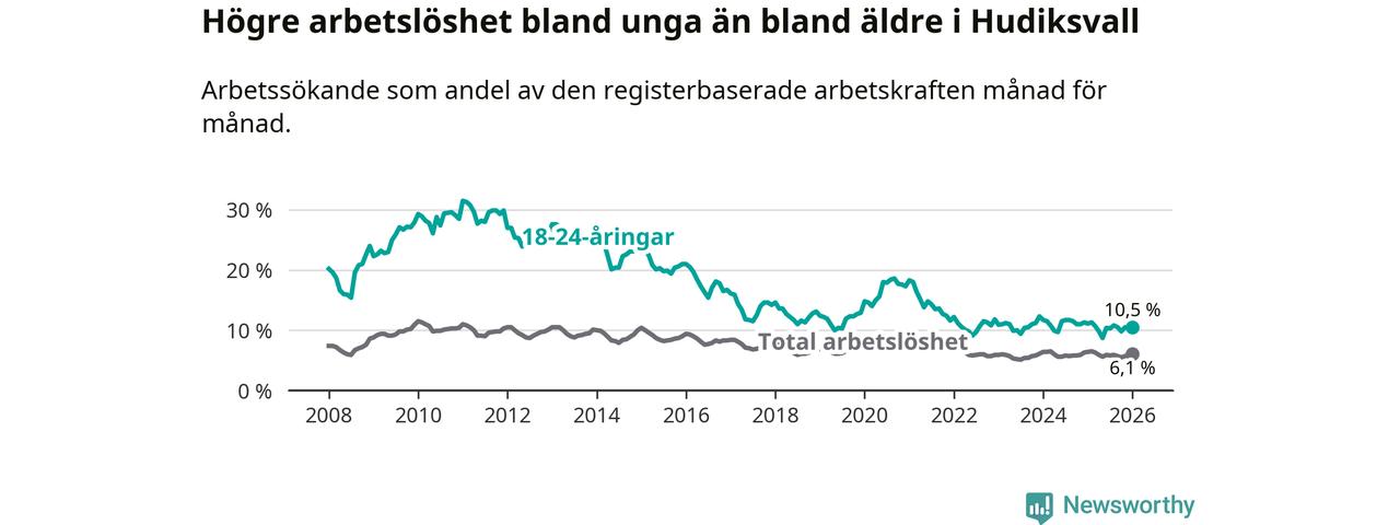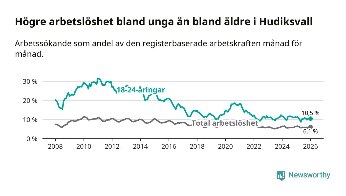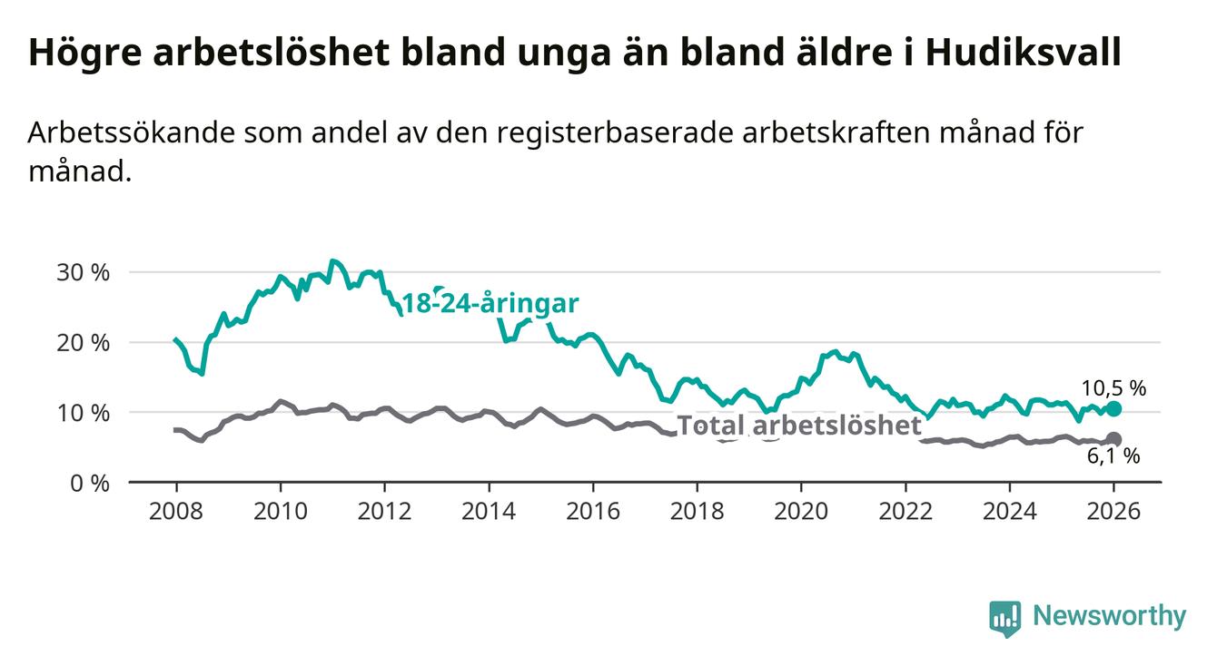 I och med den senaste månadens nedgång har de ungas arbetslöshet i Hudiksvall sjunkit 15 månader i följd (ner från 11,0 procent i oktober 2024 till 10,5 procent nu).
