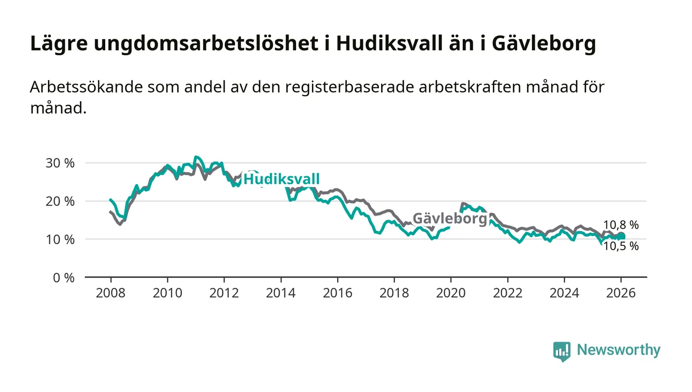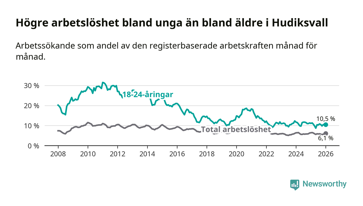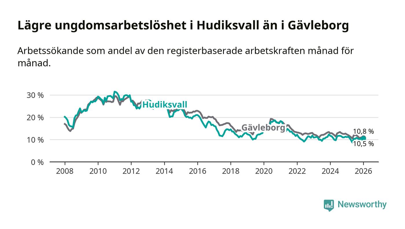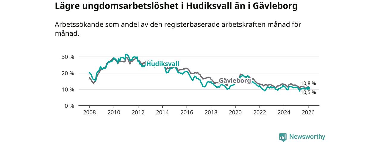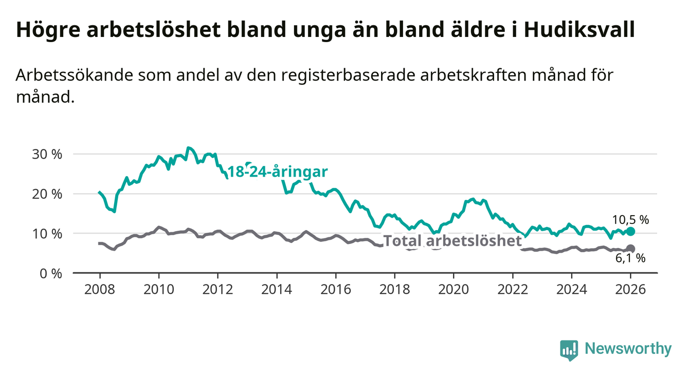 I och med den senaste månadens nedgång har de ungas arbetslöshet i Hudiksvall sjunkit 15 månader i följd (ner från 11,0 procent i oktober 2024 till 10,5 procent nu).
