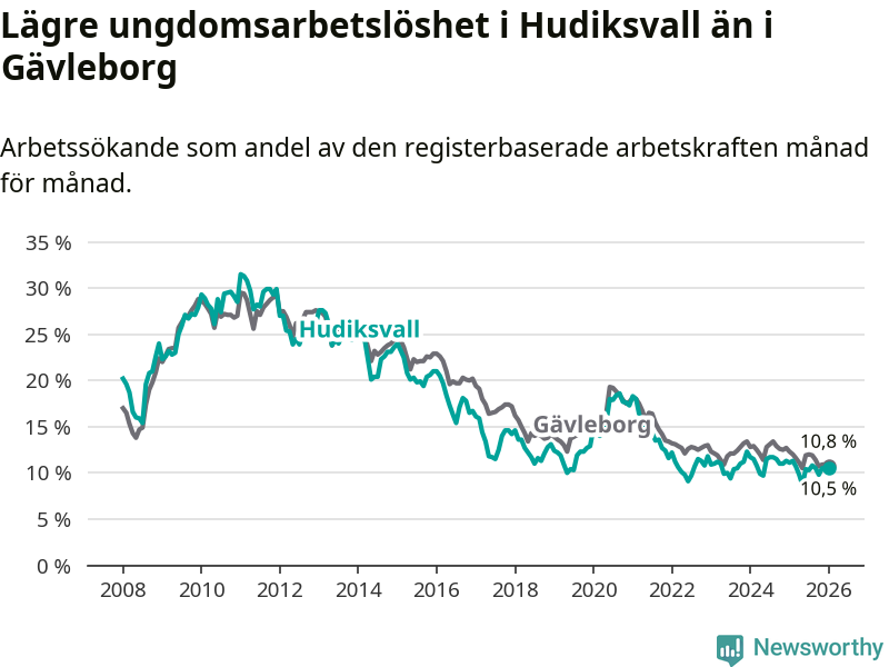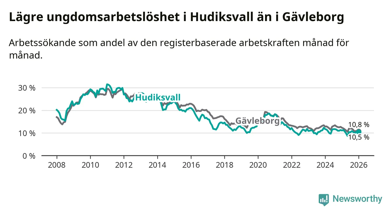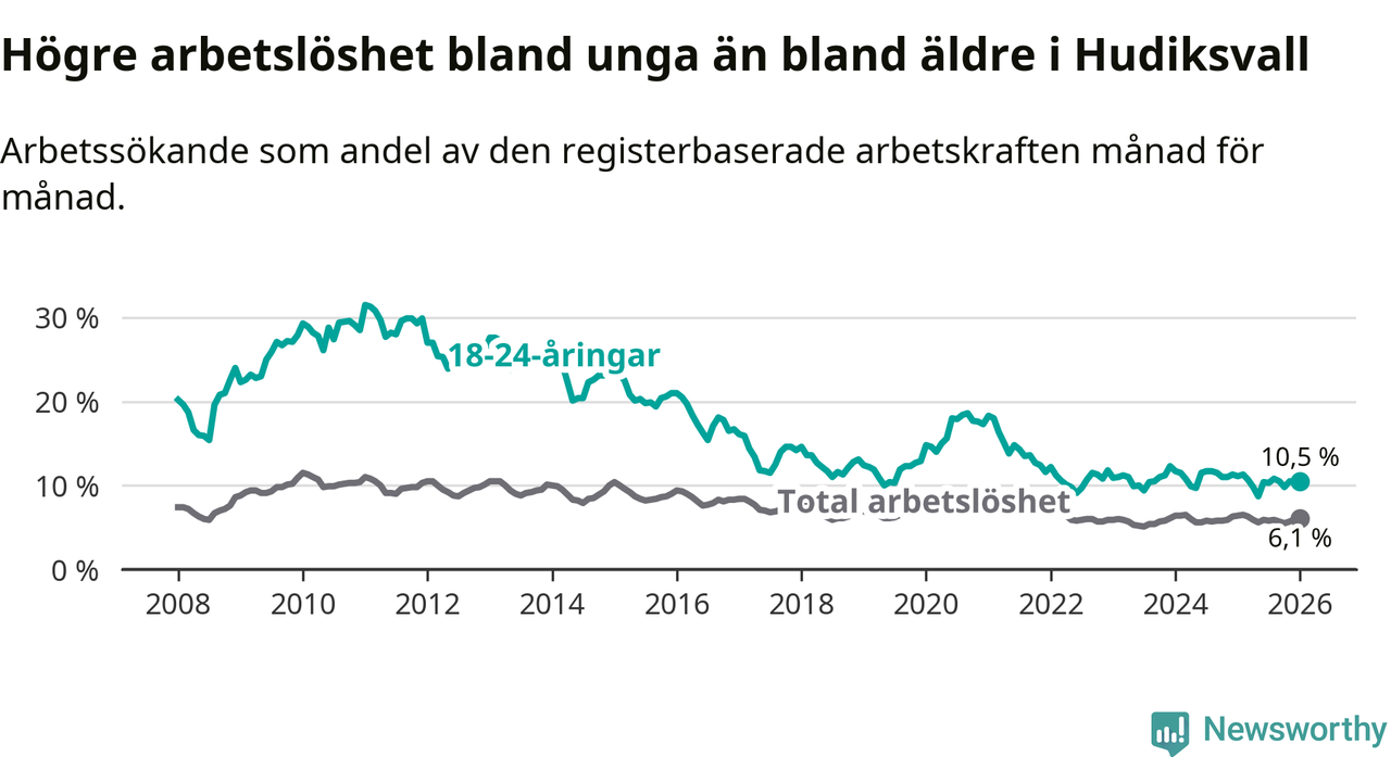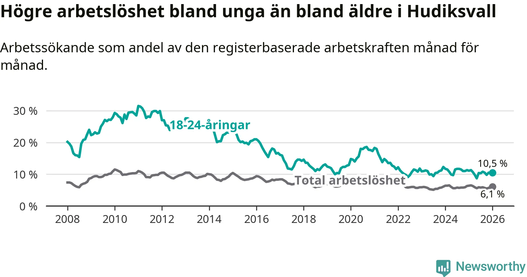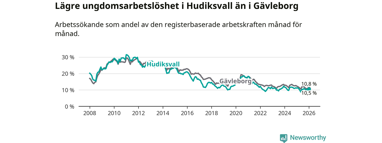 I och med den senaste månadens nedgång har de ungas arbetslöshet i Hudiksvall sjunkit 15 månader i följd (ner från 11,0 procent i oktober 2024 till 10,5 procent nu).