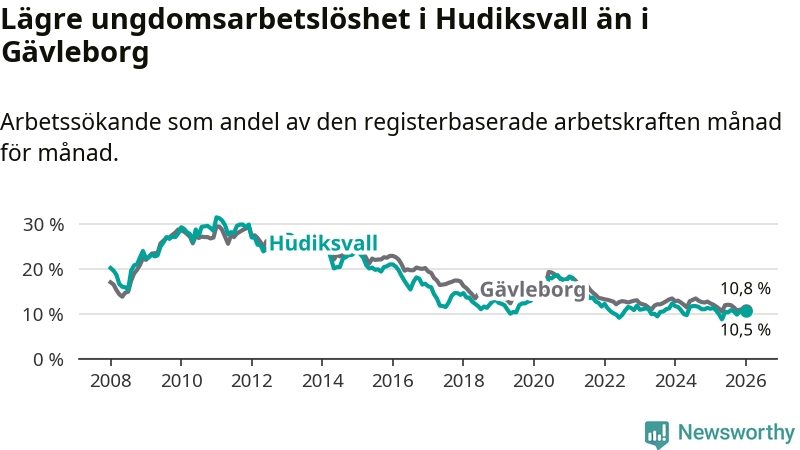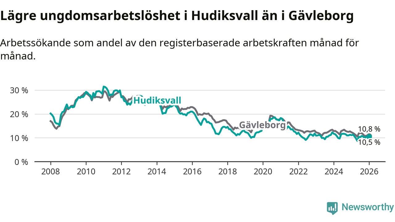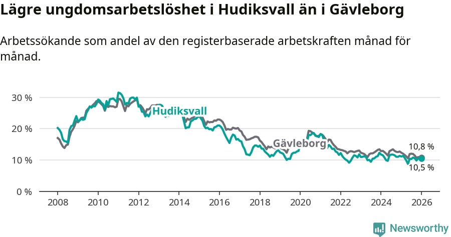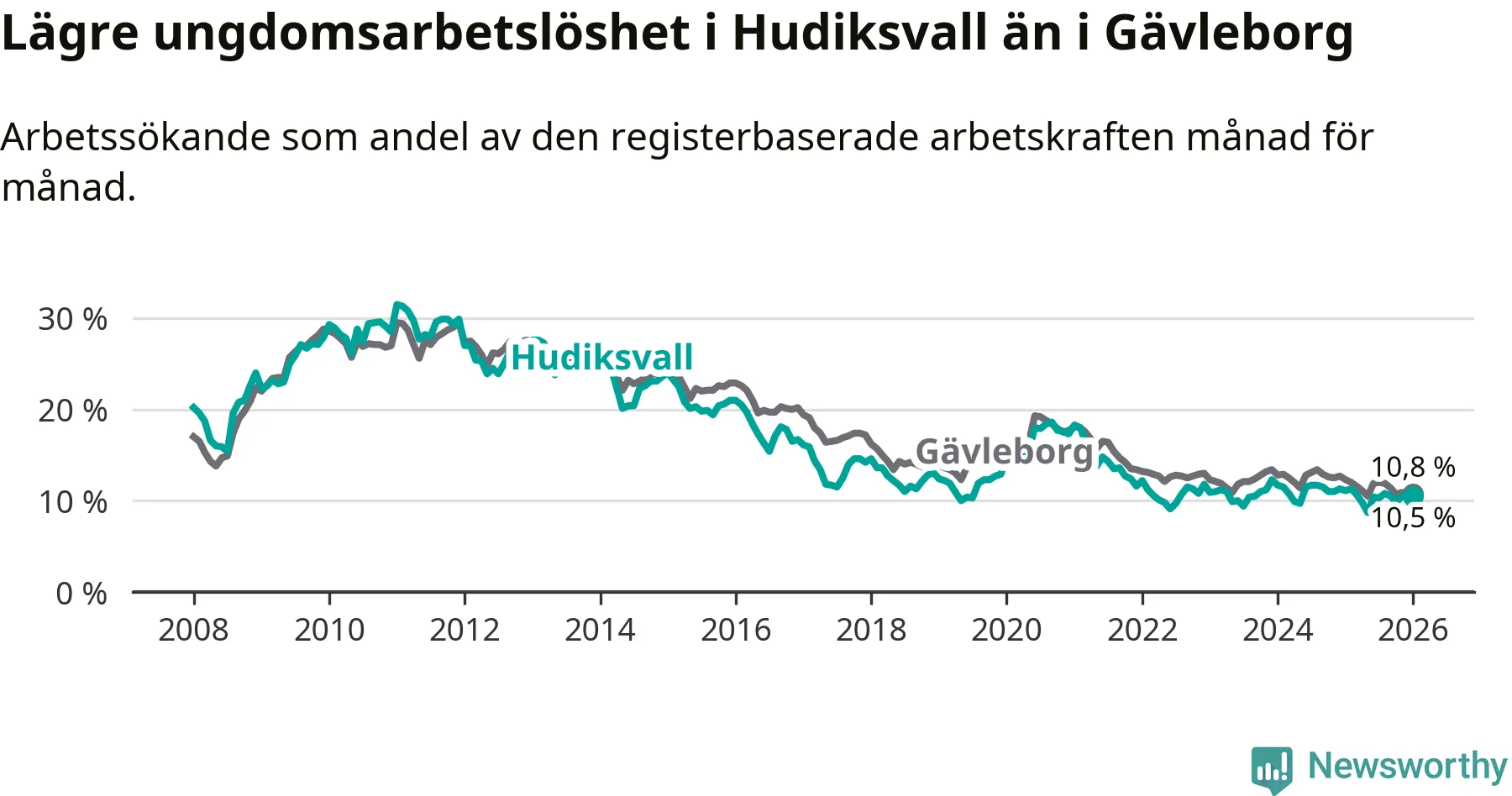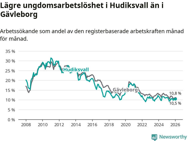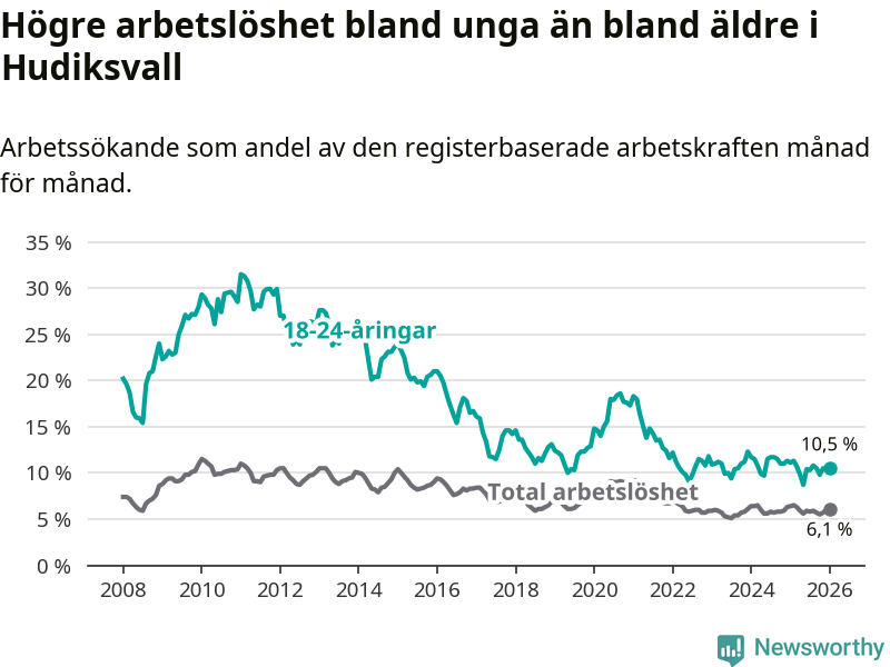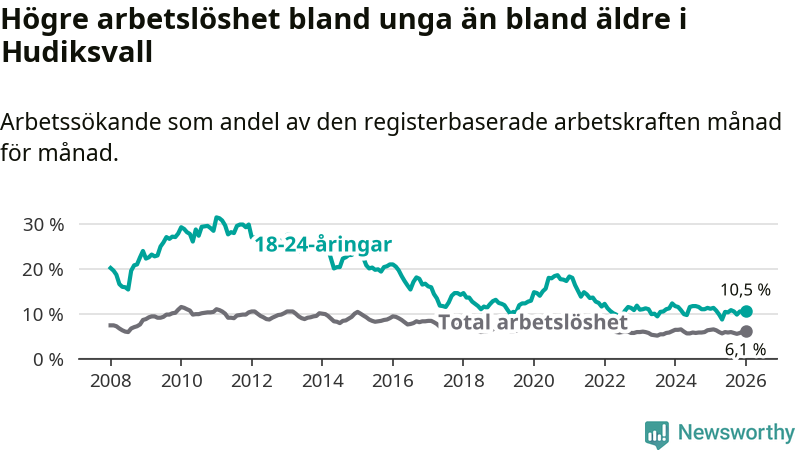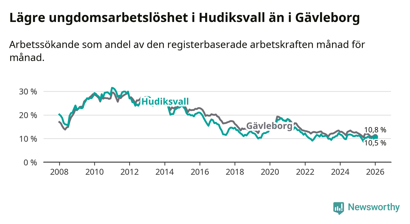 I och med den senaste månadens nedgång har de ungas arbetslöshet i Hudiksvall sjunkit 15 månader i följd (ner från 11,0 procent i oktober 2024 till 10,5 procent nu).