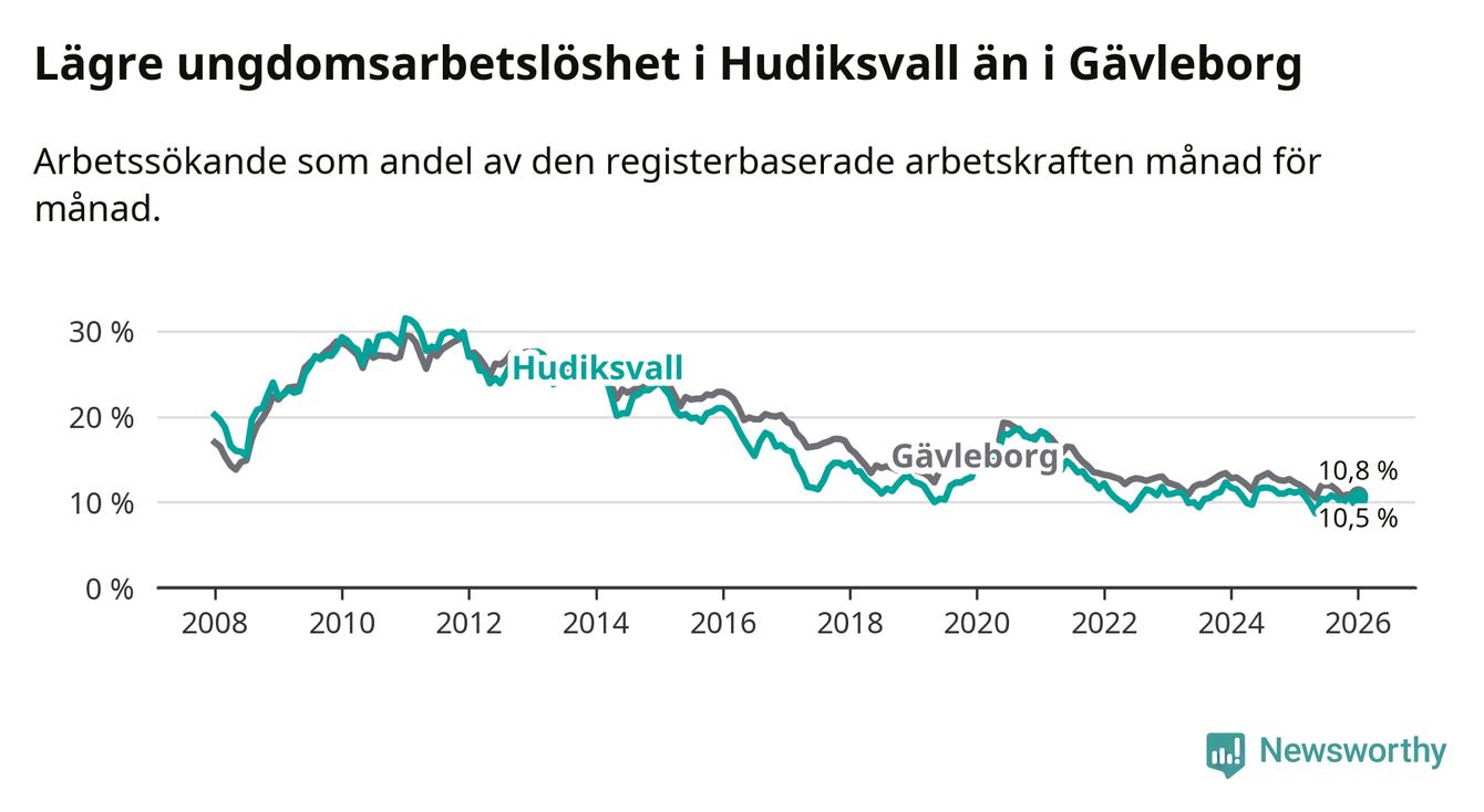 Graf: Arbetslöshet bland unga i Hudiksvalls kommun och Gävleborgs län