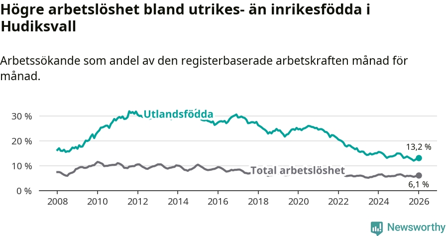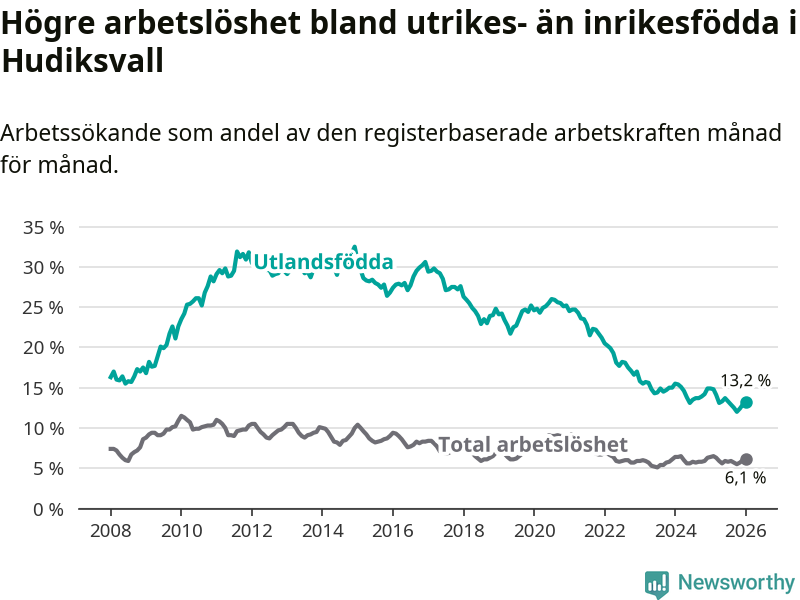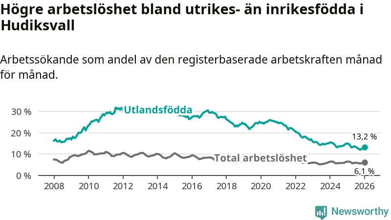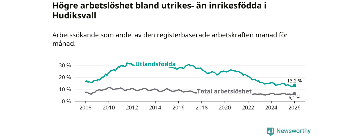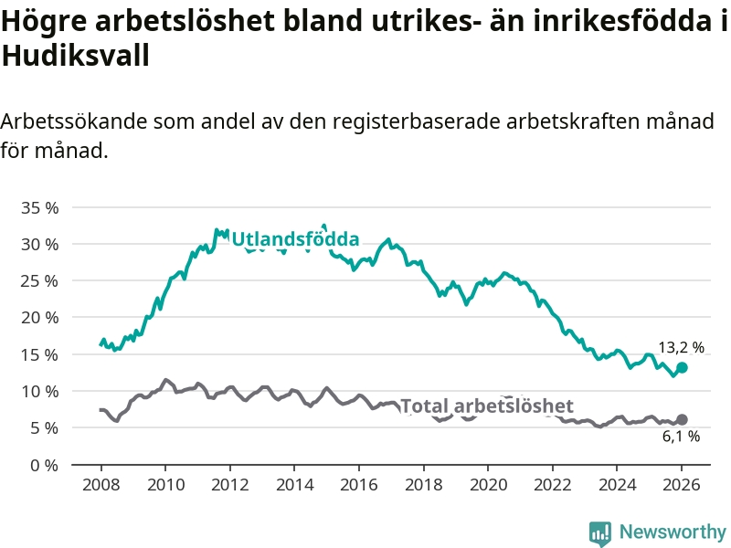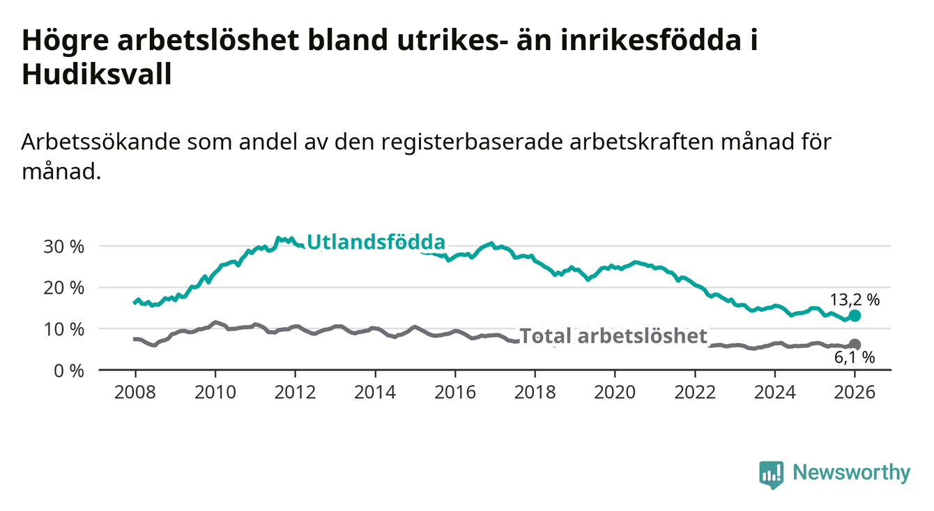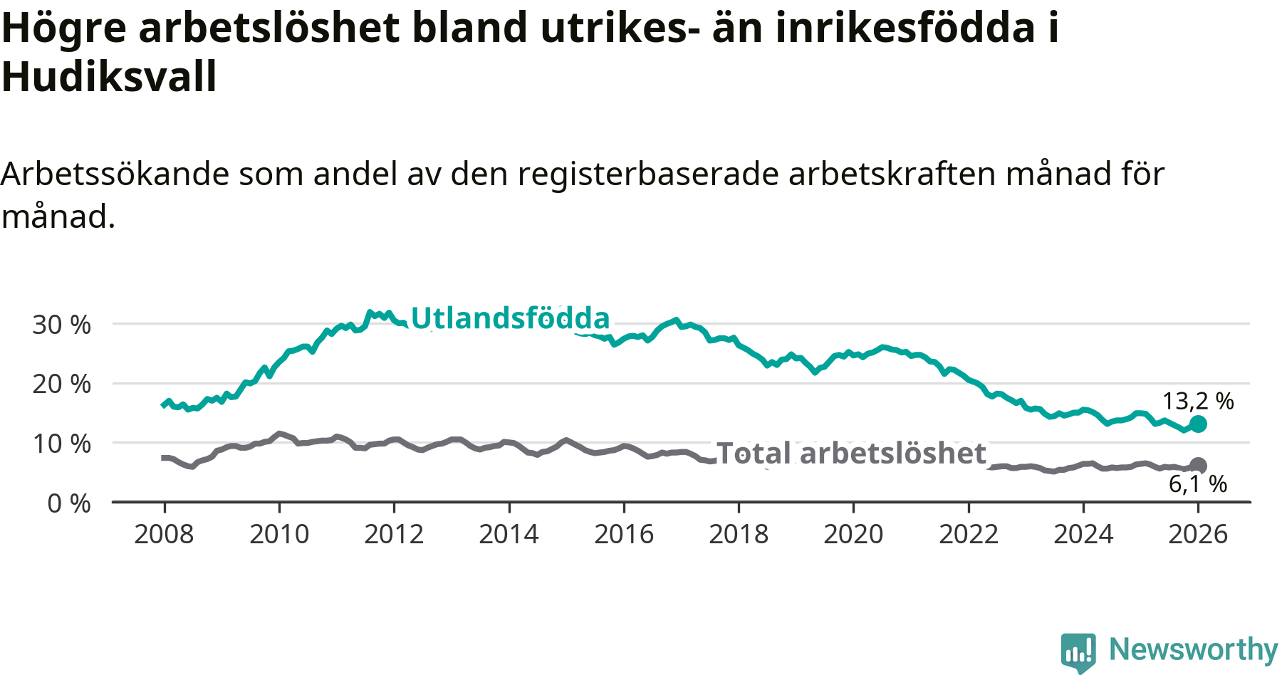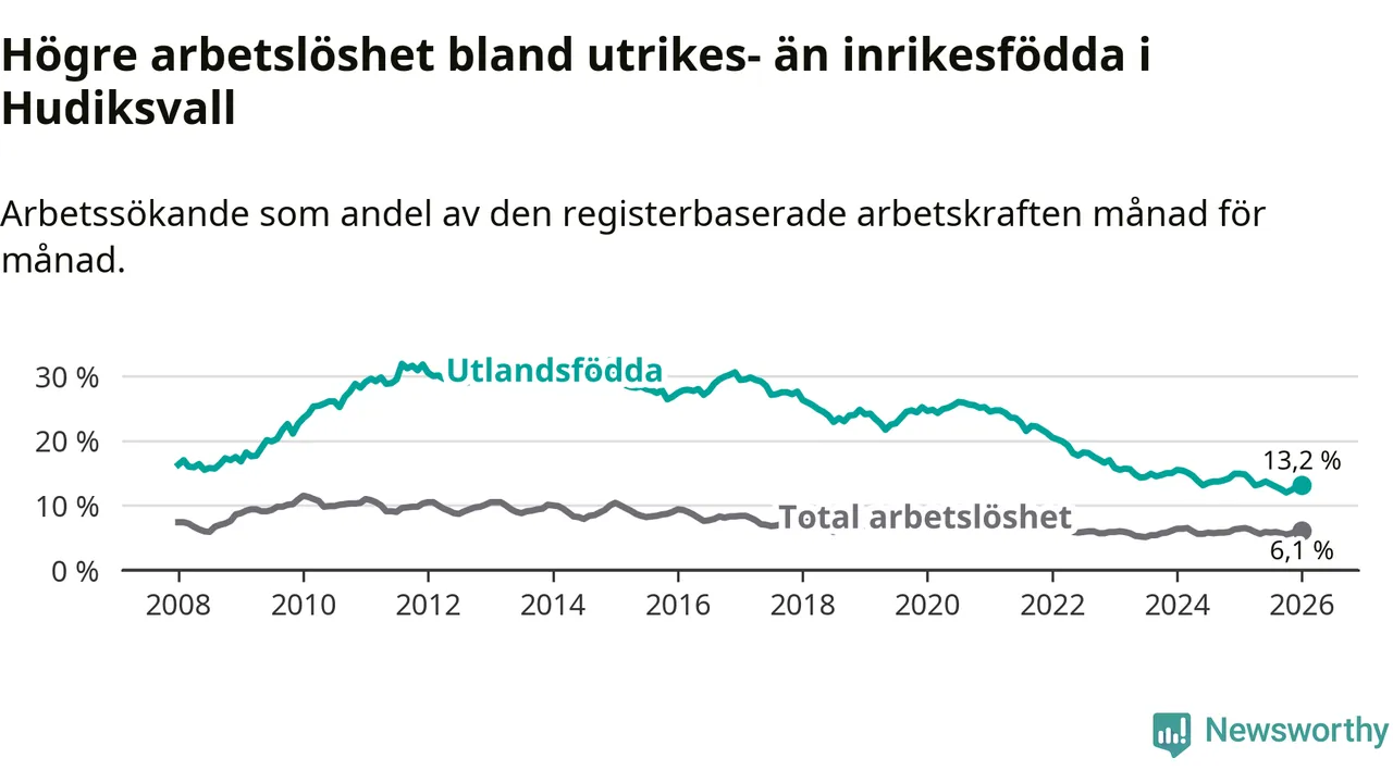 Arbetslösheten bland utlandsfödda var 13,2 procent i Hudiksvall under januari månad, motsvarande 306 av 2 318 personer. Det är 1,7 procentenheter färre än vid samma tidpunkt i fjol (−36 om man räknar personer). Därmed är de utlandsföddas arbetslöshet lägre än vid samma tidpunkt i fjol för sjunde månaden i följd.
