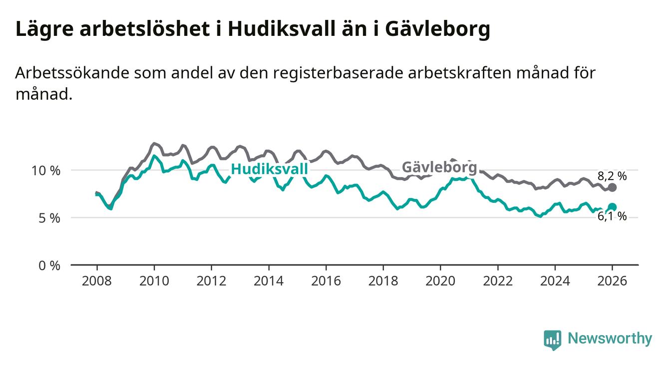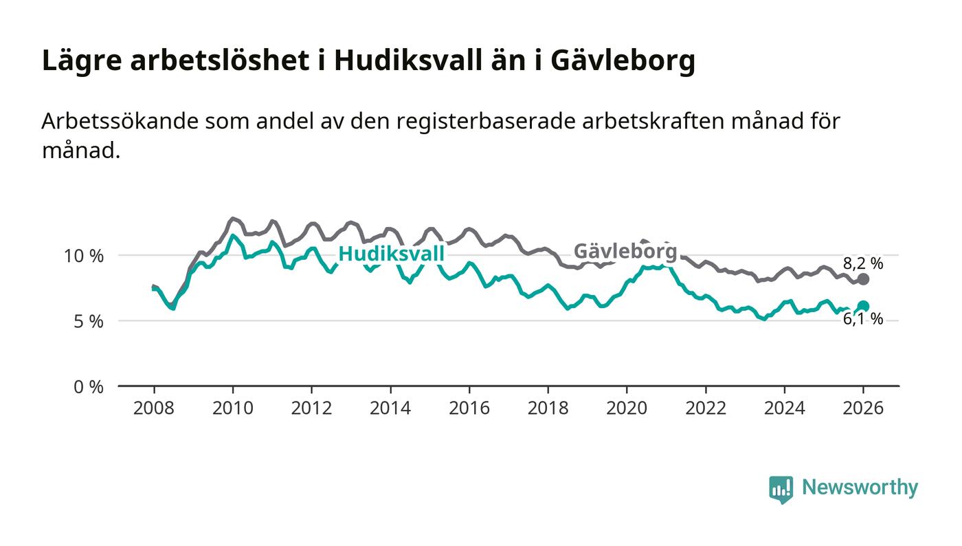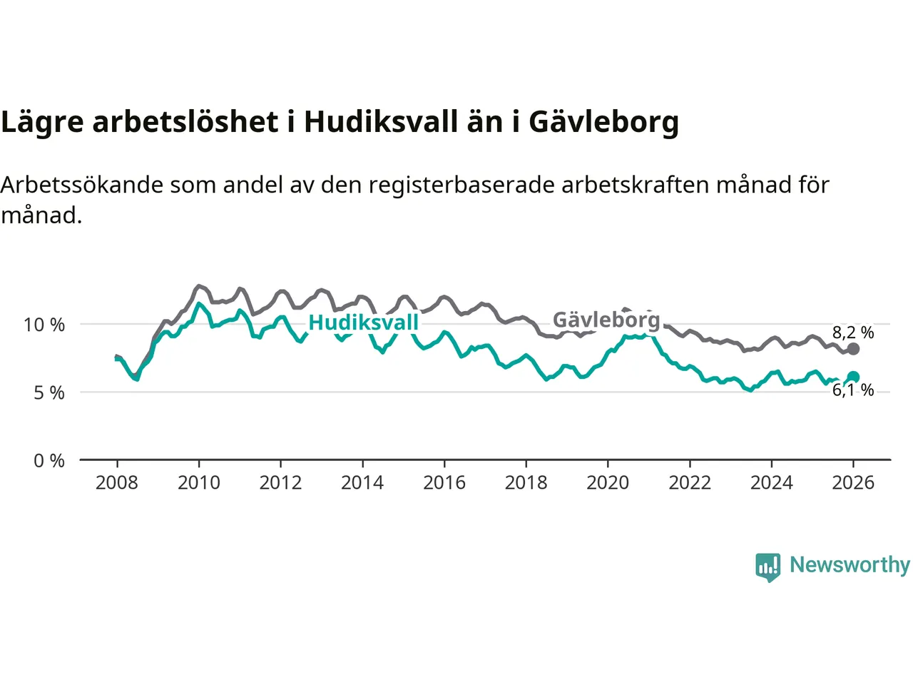 Hudiksvall hade redan tidigare lägre arbetslöshet än snittet i hela Gävleborgs län och nu växer klyftan (6,1 procent i kommunen, jämfört med 8,2 procent i hela länet). Hudiksvall har därmed även den lägsta arbetslöshetsnivån i länet. Söderhamn har den högsta (9,0 procent).